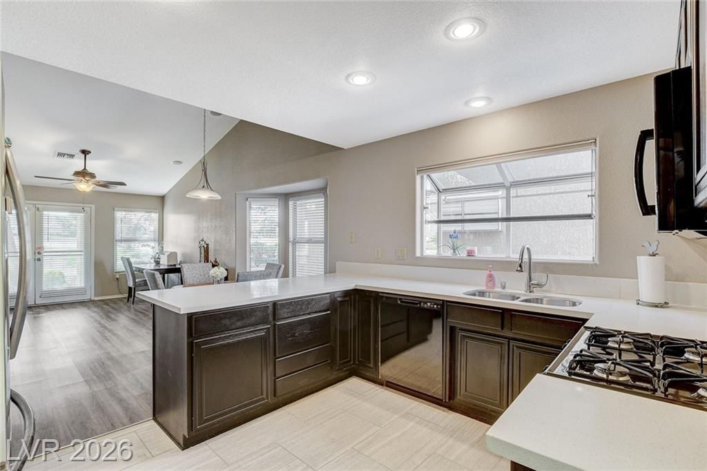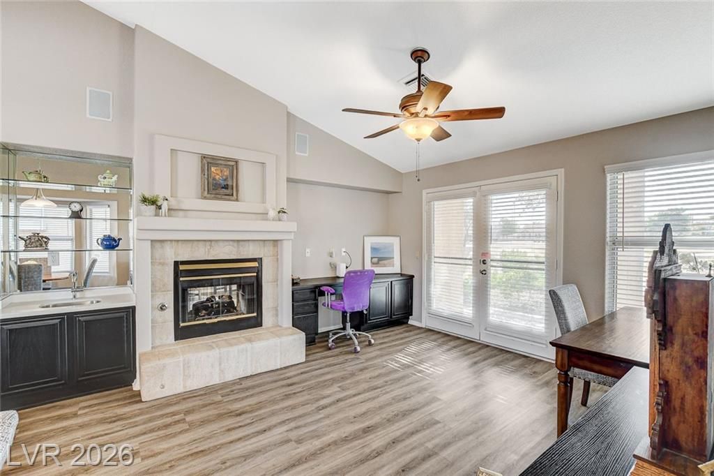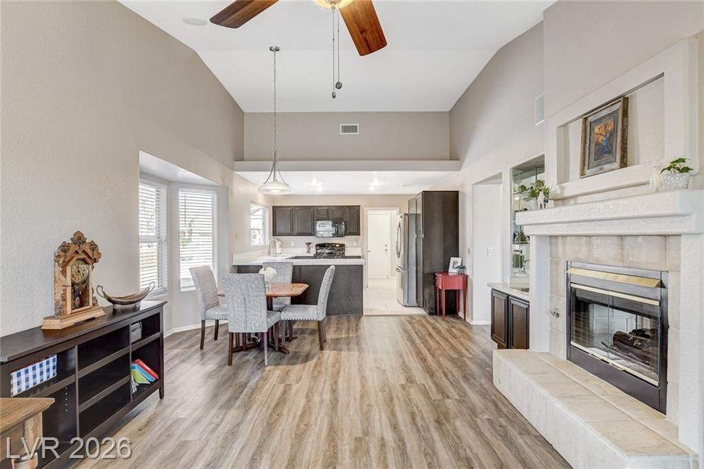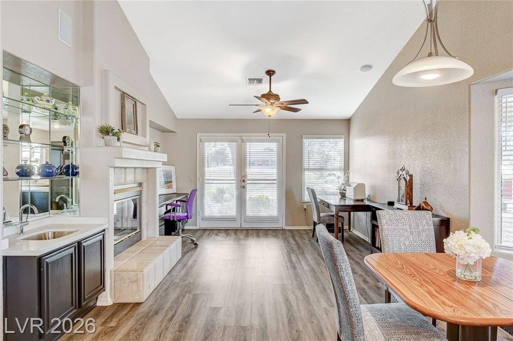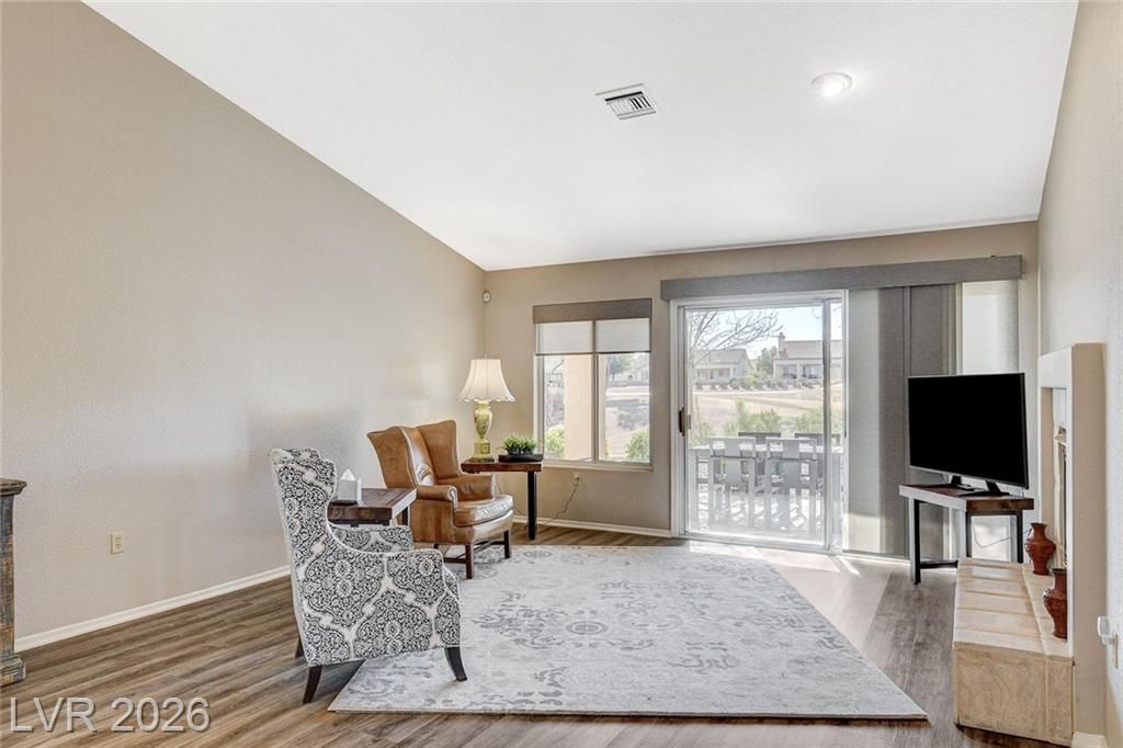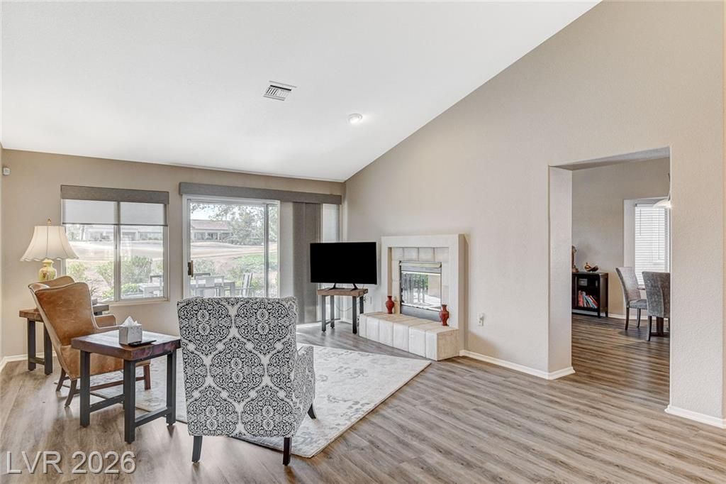 Gracious and open, this 2 bedroom/2 bath Sun City Summerlin townhome is located on the golf course! The spacious & open floorplan has wonderful natural light, separate living and family rooms, lots of storage options including cabinets in the garage, and a cozy and warm two sided fireplace with openings in the family room and living room. Entertaining room galor with a large, covered patio overlooking the golf course. The spacious living room has room for formal dining or that piano you don't want to part with. The kitchen with garden window and breakfast bar connects with the family room with a dining nook, a mini wet bar, built-in desk area and views of the golf course. This 55+ community has walking & jogging trails, golf cart friendly roads, 3 golf courses, 3 clubhouses, fitness centers, pools, tennis, pickle ball and social clubs with just about any craft or card game available. Don't miss this opportunity for a truly resort type lifestyle!