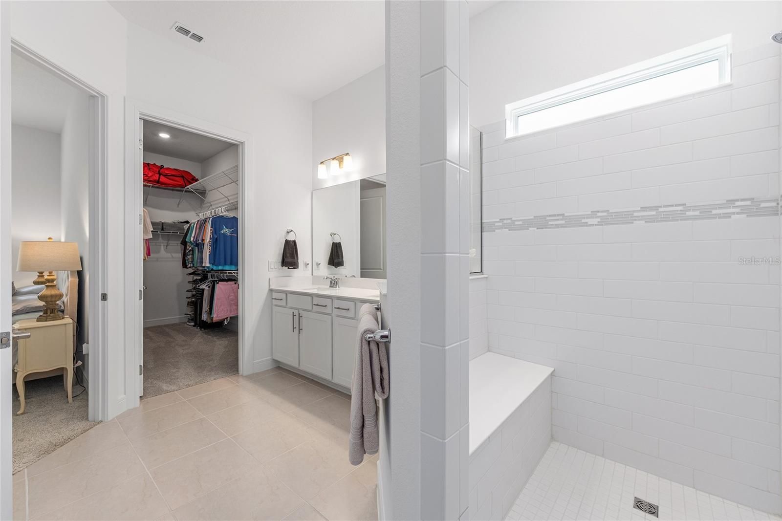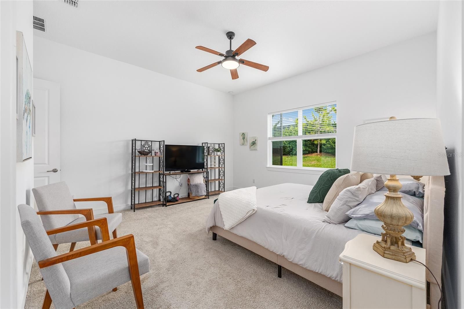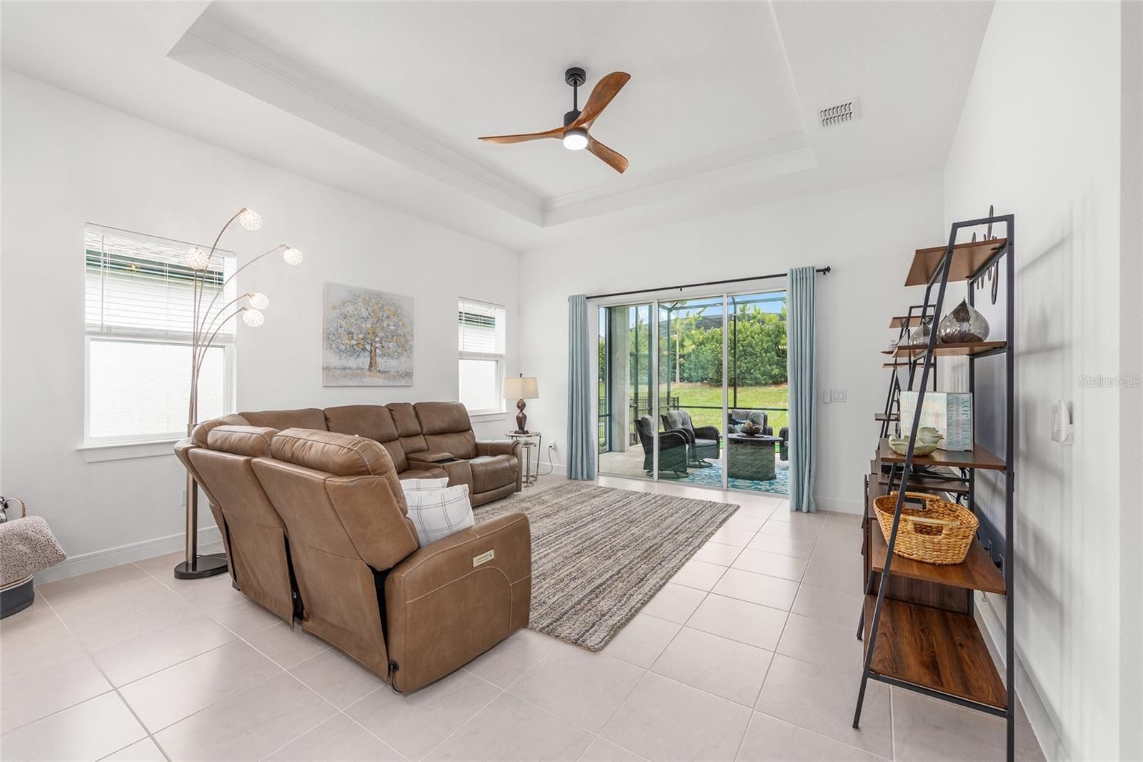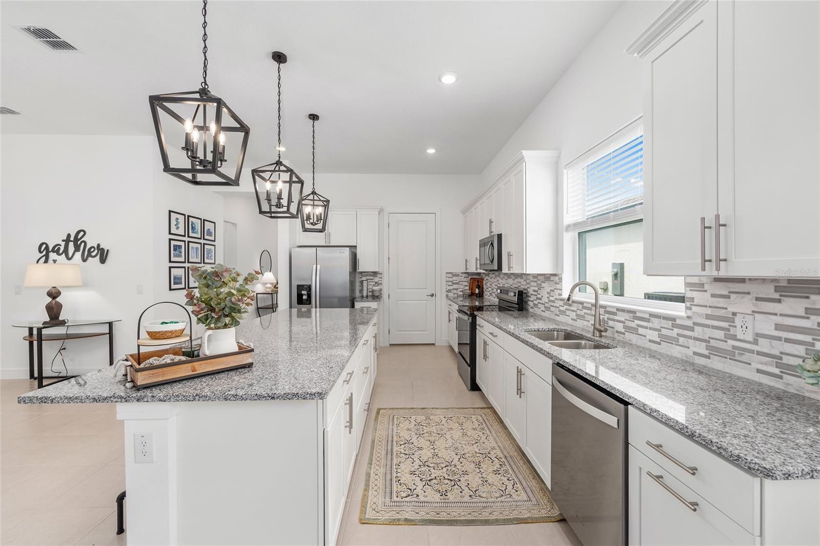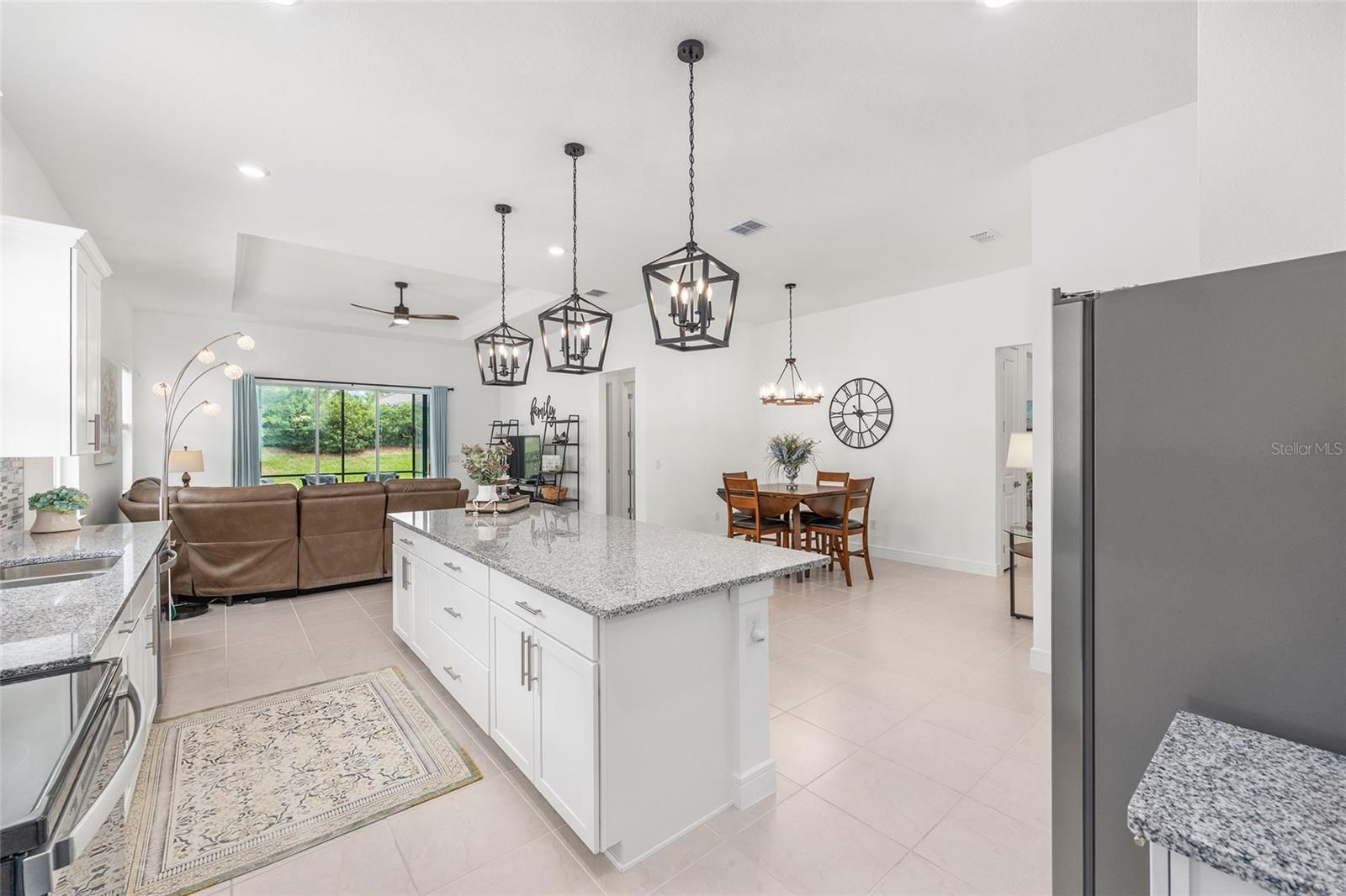 - Ceiling Fan(s), Eat-in Kitchen, High Ceilings, In-Wall Pest Control, Kitchen/Family Room Combo, Open Floorplan, Main Level Primary, Stone Counters, Thermostat, Tray Ceiling(s), Walk-In Closet(s), Window Treatments