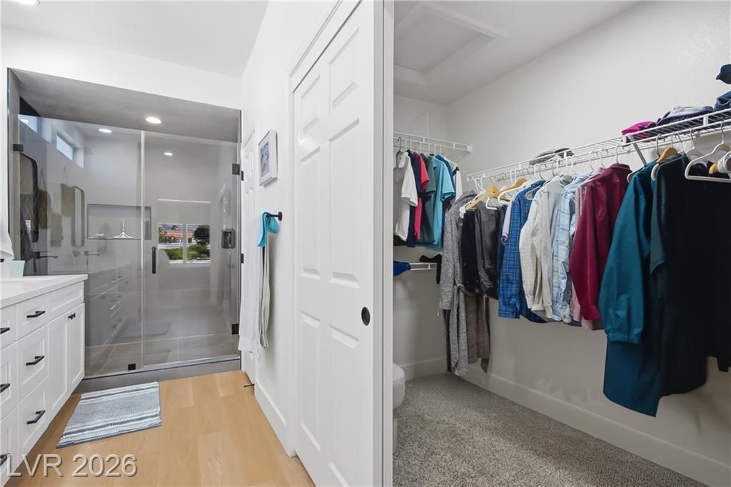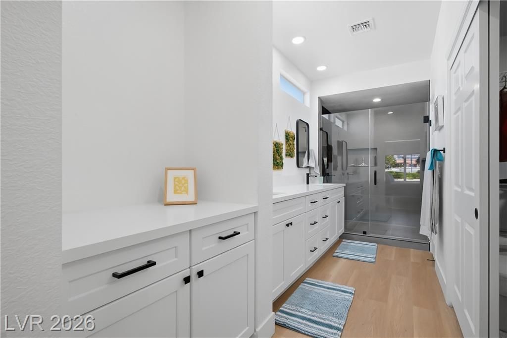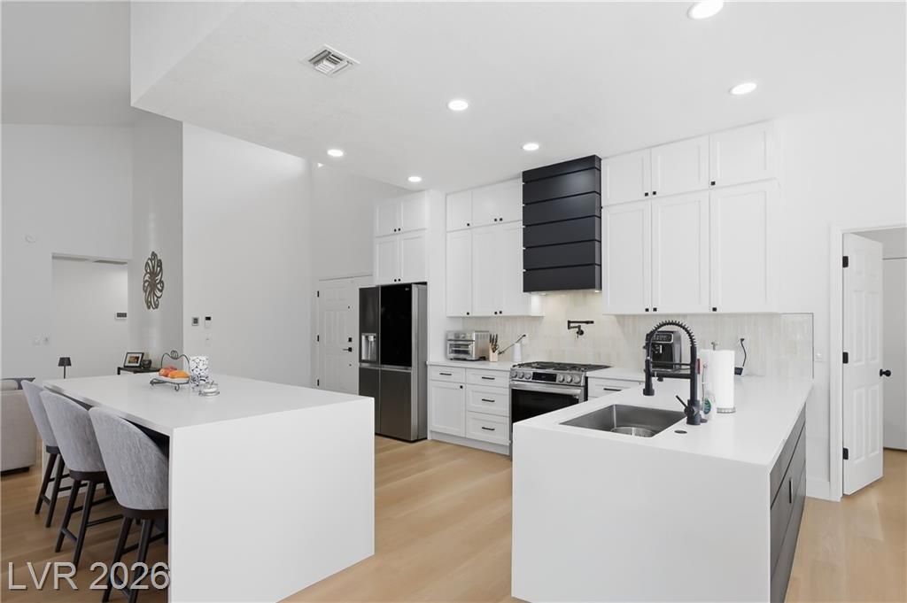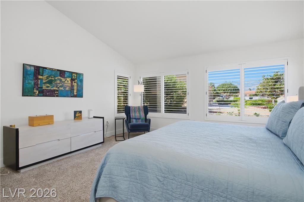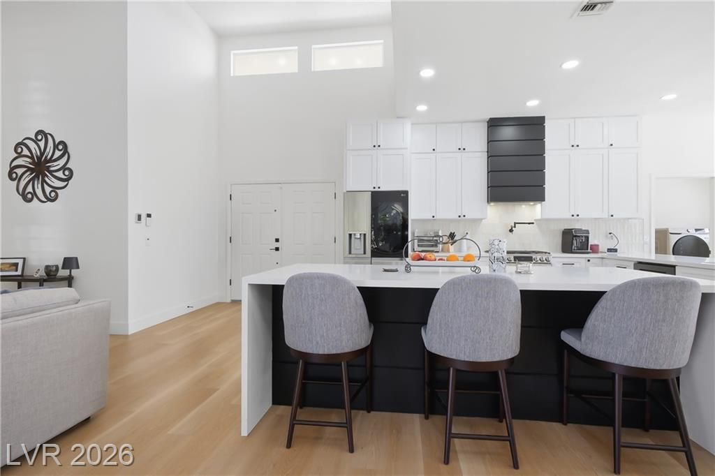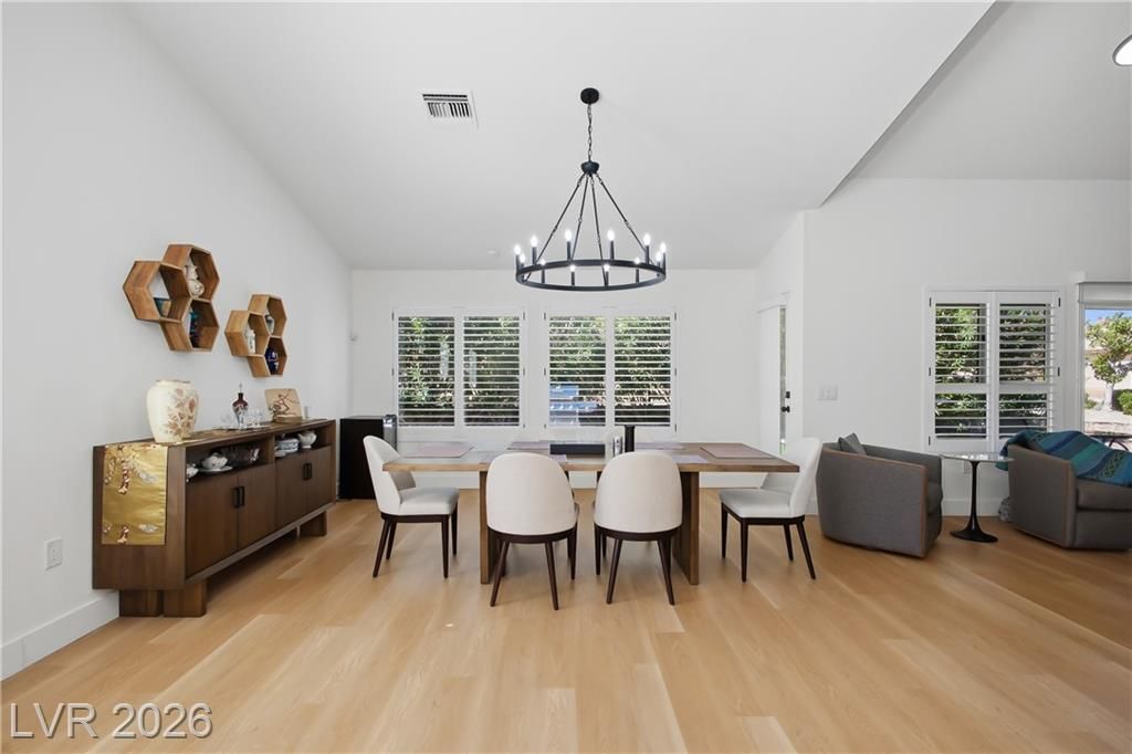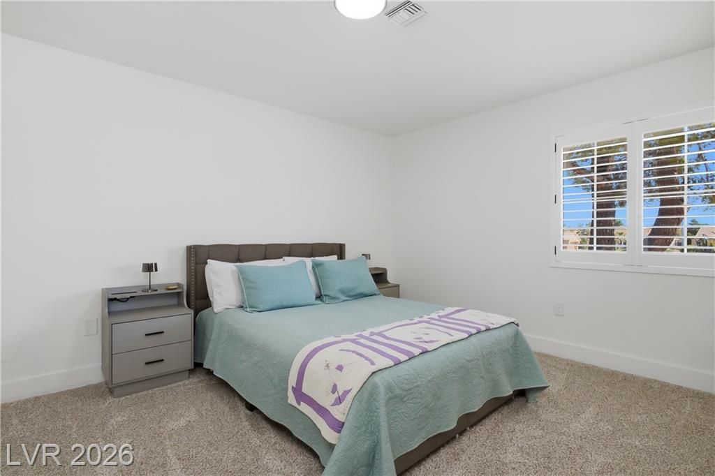 Beautifully updated in 2023, this 3 bed, 2 bath, 2,115 sq. ft. home in Sun City Summerlin features stylish modern finishes throughout. Upgrades include neutral 3-tone paint, quartz countertops, custom cabinetry, 5" square baseboards, SS appliances, wood-look vinyl flooring, carpet in the bedrooms and contemporary lighting & plumbing fixtures. Front & rear landscaping were refreshed & window coverings are installed throughout.The bright open floor plan is ideal for everyday living and entertaining, highlighted by a large kitchen island and comfortable seating areas. The spacious primary en-suite offers dual vanities and a walk-in closet, while the second and third bedrooms are conveniently located near a full bath. Sun City Summerlin is a premier 55+ community featuring three golf courses, four clubhouses, sports courts, dining, clubs, and activities, all near Downtown Summerlin’s shopping, dining, entertainment, the Triple-A baseball stadium, and the Golden Knights practice arena.