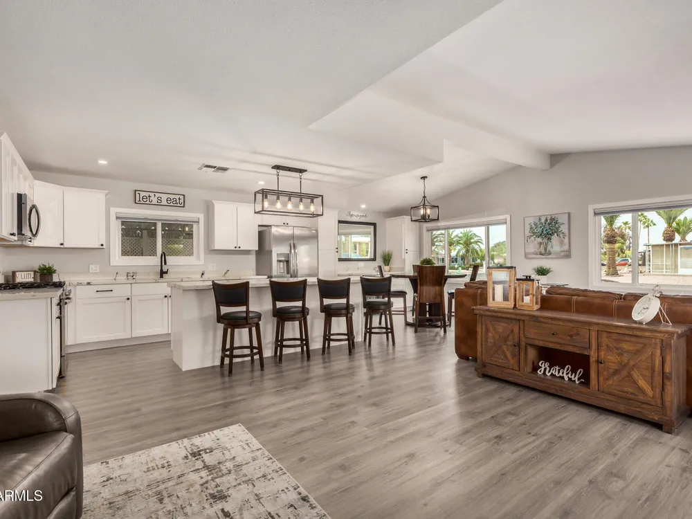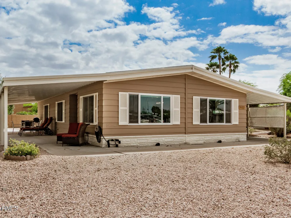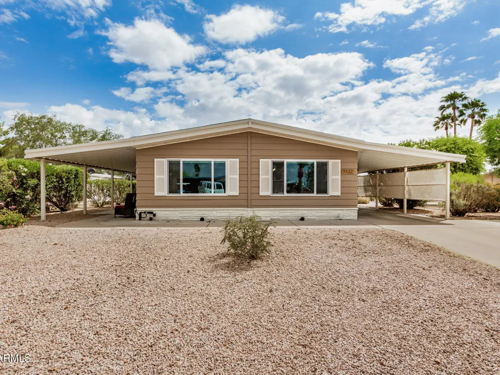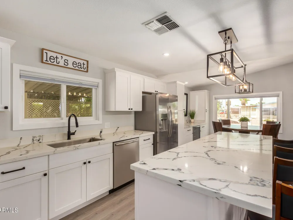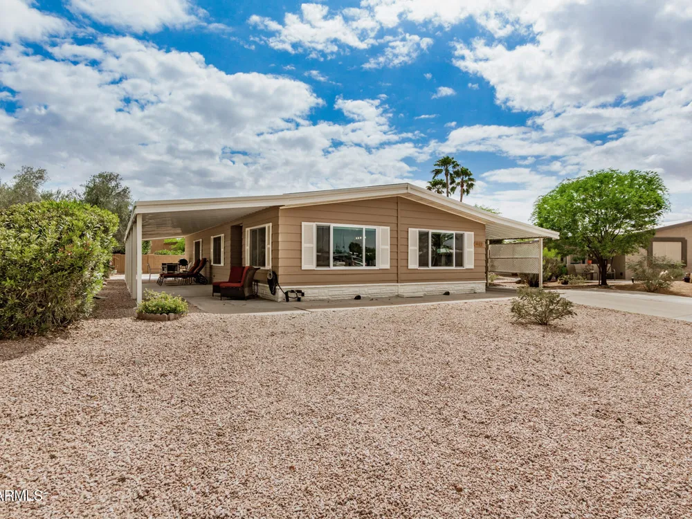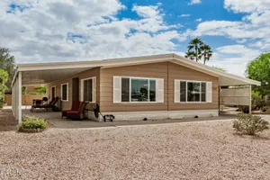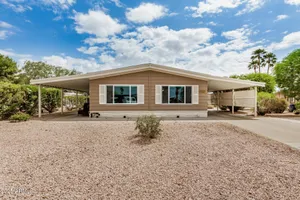Check out this beautifully remodeled manufactured home in the 45+ community of Sun Lakes. This delightful 2-bedroom property features vaulted ceilings, wood-look flooring, a soothing color palette, and a spacious great room perfect for entertaining. The modern kitchen is equipped with stainless steel appliances, a gas stove, white cabinets, stylish lighting, quartz countertops, and a central island with a breakfast bar. Each of the two main bedrooms includes its own ensuite. The home also boasts updated plumbing and ADA-approved widened doorways for enhanced accessibility. Outside, enjoy a covered patio and shed in the backyard, ideal for outdoor activities. Community amenities include a pool, spa, fitness center, and more. Don't miss out on this gem!