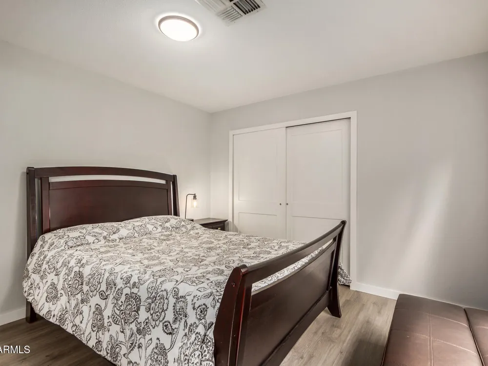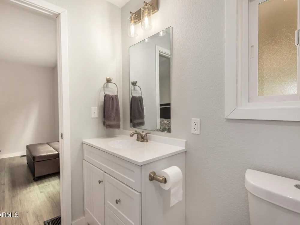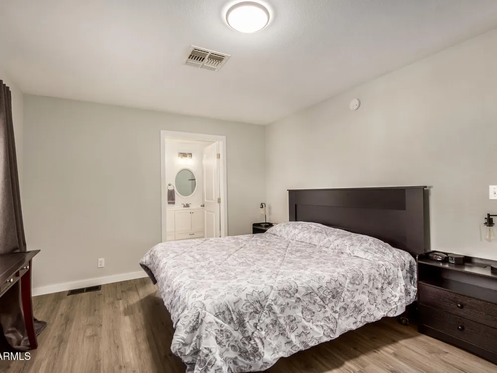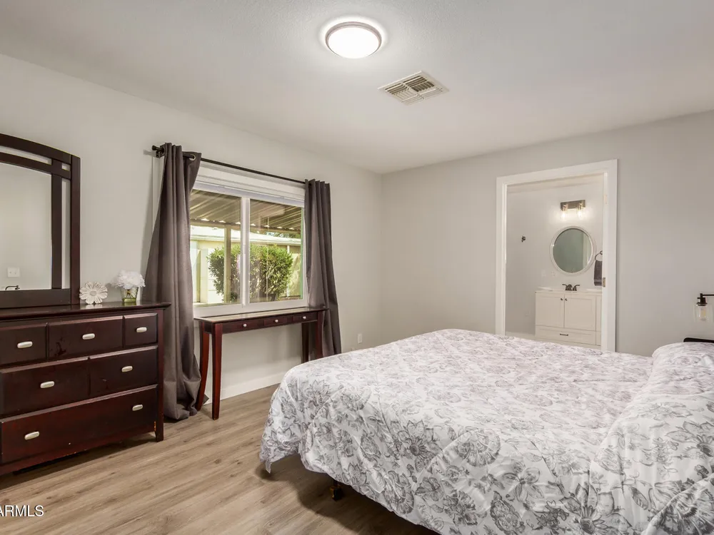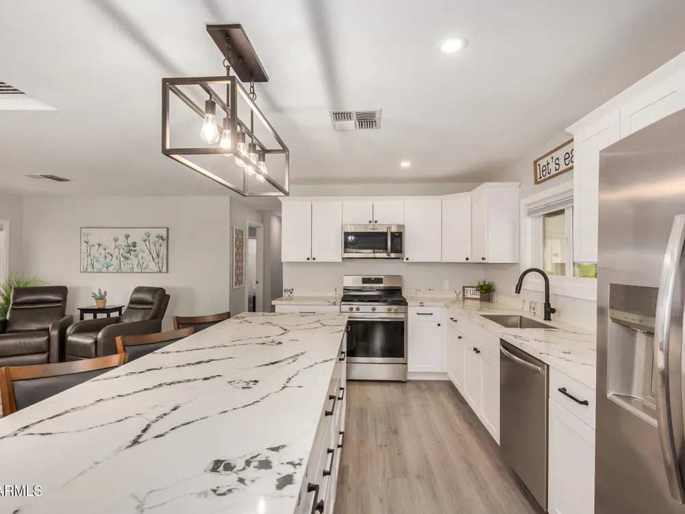 Check out this beautifully remodeled manufactured home in the 45+ community of Sun Lakes. This delightful 2-bedroom property features vaulted ceilings, wood-look flooring, a soothing color palette, and a spacious great room perfect for entertaining. The modern kitchen is equipped with stainless steel appliances, a gas stove, white cabinets, stylish lighting, quartz countertops, and a central island with a breakfast bar. Each of the two main bedrooms includes its own ensuite. The home also boasts updated plumbing and ADA-approved widened doorways for enhanced accessibility. Outside, enjoy a covered patio and shed in the backyard, ideal for outdoor activities. Community amenities include a pool, spa, fitness center, and more. Don't miss out on this gem!