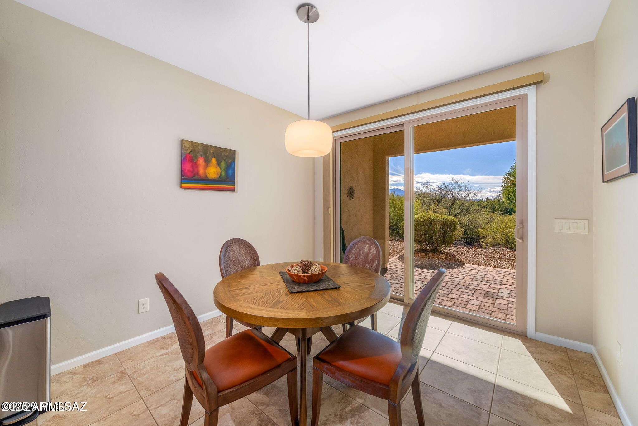 Welcome to the Quail Creek 55+ Community! This delightful, move-in-ready villa is ready to become your new home. Located in the heart of Green Valley, this two-bedroom, two-bathroom villa offers 1,399 sq ft of living space and is perfect for an active adult lifestyle. The home features a calming neutral palette and tile flooring throughout. The large great room is ideal for hosting or relaxing while enjoying magnificent mountain views. The open floor plan includes a designer kitchen with a large island, quartz countertops, a composite sink, stainless appliances, a gas range, a stylish tile backsplash, quality cabinetry with hardware, under-cabinet lighting, and a dining area. Just off the great room is a true den, perfect for a home office or media room. The villa is positioned to maximize the view, offering unobstructed sights of the Santa Rita Mountains and the ever-changing desert with no rear neighbors. The split floor plan ensures privacy, with the Owner's Suite located at the rear of the home. The luxurious ensuite features a double vanity, an oversized walk-in shower, and a walk-in closet. Enjoy your own private sanctuary as you relax the extended covered patio, complete with a ceiling fan. The true appeal of "Villa Living" is the low-maintenance lifestyle; the HOA covers hazard insurance, exterior paint, roof and window maintenance, landscaping, pest control, and common area maintenance. This villa is perfect for year-round living, as a second home, or as an investment property. All furniture, decor, and finishings seen in the home are available on a separate bill of sale. Green Valley is a highly desirable area of Tucson, and this villa is conveniently close to shopping, restaurants, and healthcare. The Quail Creek community offers many amenities, including the Canyon club, Pickleball courts, creative arts, and technology center, fitness and sports facilities, dog park, resort, style pools, tennis, golf and more.