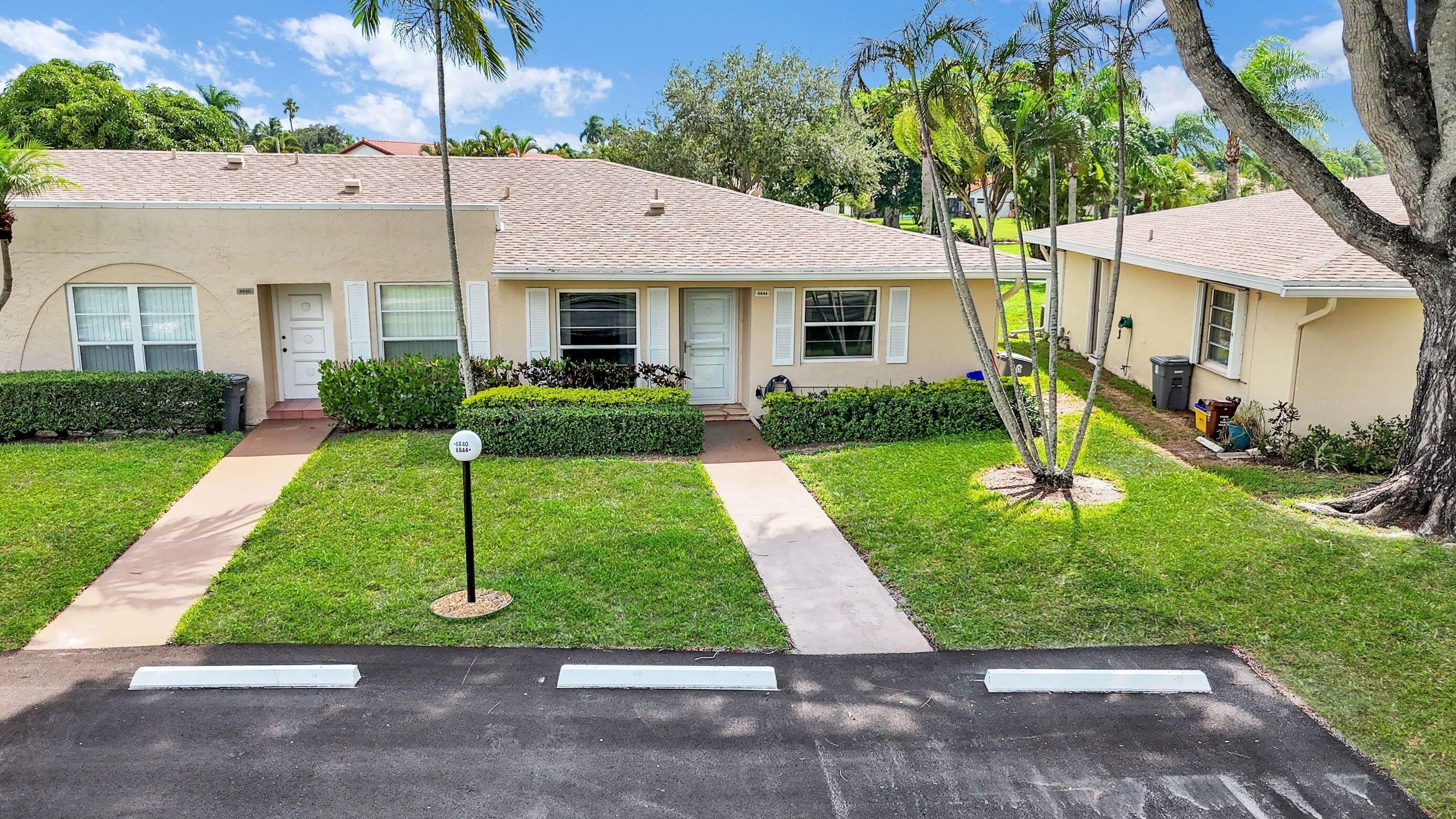 Spectacular 2 bedroom 2 bath PRIMARY SWEETS. Large open Family room with custom mirrors. Freshly Painted, new fans, renovated all APPLIANCES & AIR CONDITIONER just 2 years old. CORNER VILLA WITH VIEW TO THE CANAL . . All Hurricane Windows & Shutter to make it completed. Excellent location, close to the Turnpike, shopping centers, restaurants, and Super Market right across the street GATED COMMUNITY WALKING DISTANCE TO THE CLUB HOUSE. Pickleball - Tennis - Community Pool - Shuffle Board - Bocce Ball - VERY SECURE LOCATION. Two car spots in front of semi detached Villa. LOW HOA - 55 and over community. MUST SEE...