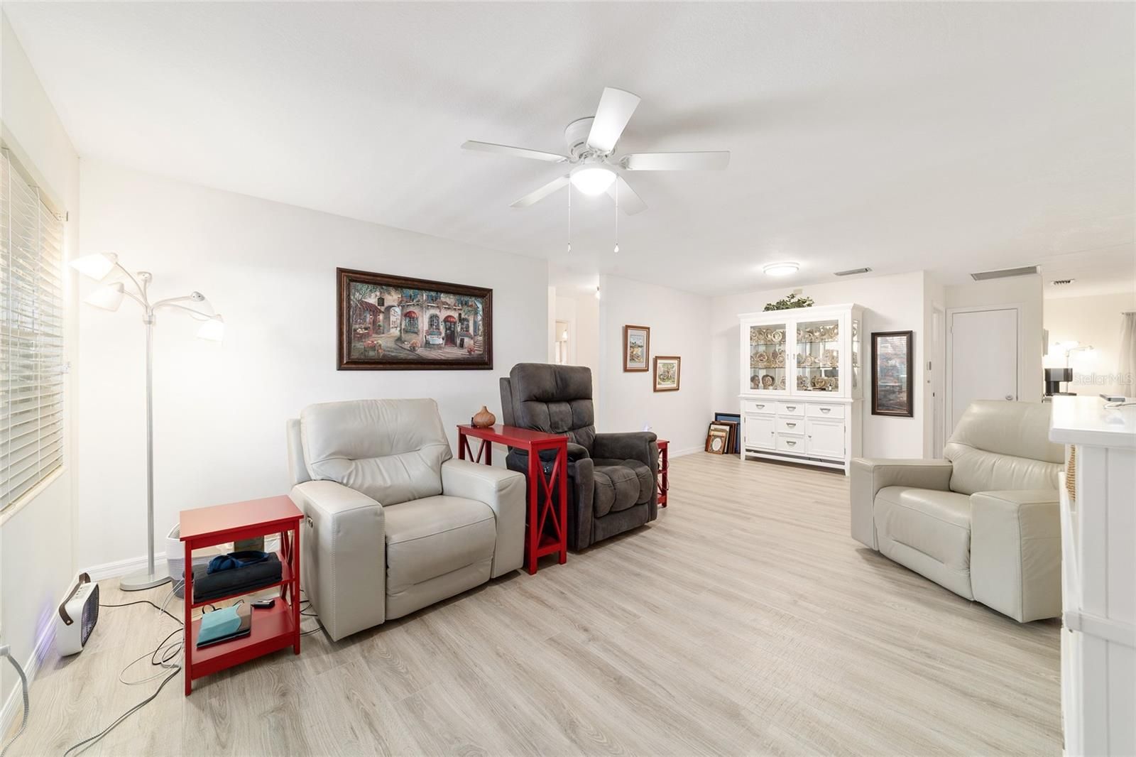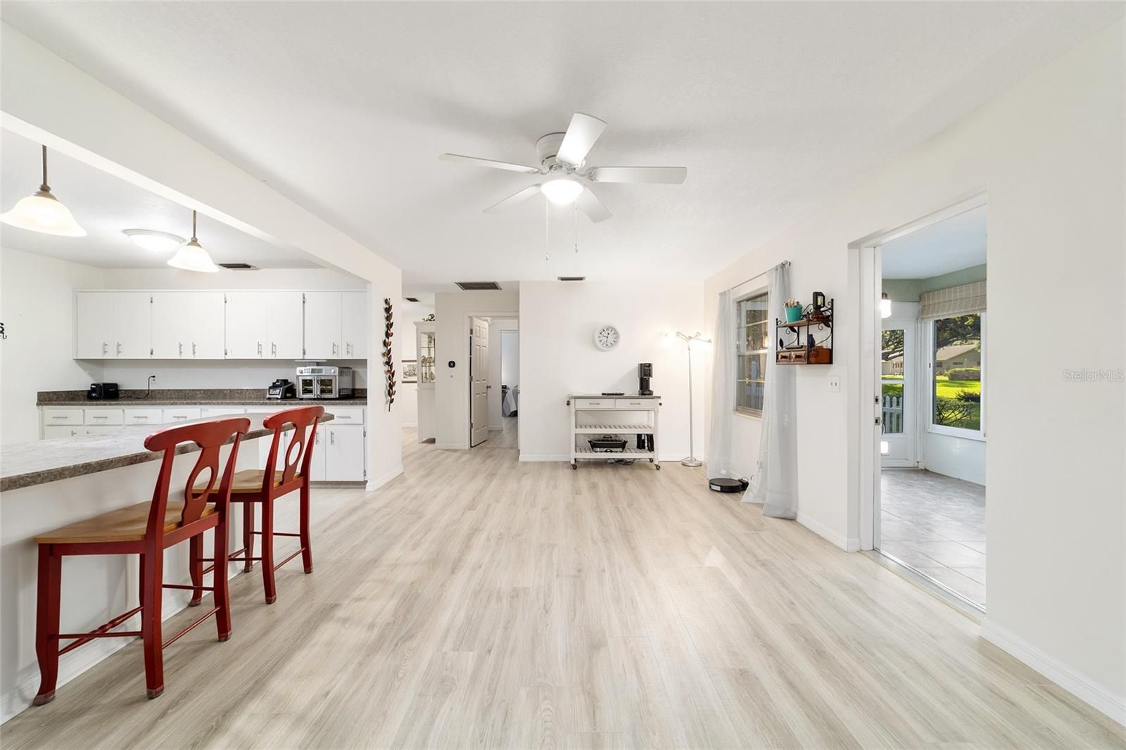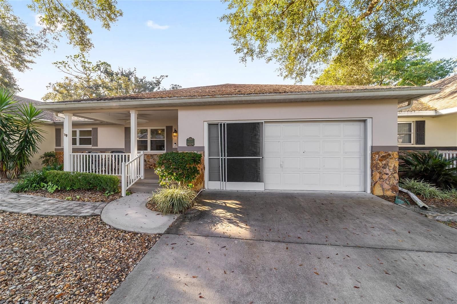 Clean Bostonian features 2 bedrooms, 2 bathrooms, and an OVERSIZED 21x24, 2 car garage. This welcoming home offers newer luxury vinyl plank throughout, updated light fixtures, plantation shutters, NO popcorn ceiling, and great curb appeal including a paver patio area out front. The spacious kitchen boasts stainless steel appliances, tile backsplash, plentiful storage, and an island. The primary suite features and a convenient walk through, walk-in closet for easy access to the great room and an updated ensuite bathroom with gorgeous vanity, glass enclosed step-in shower with upgraded tile surround, and a comfort height commode. The second bedroom easily accommodates a king-sized bed. The four-season lanai is perfect for enjoying Florida year-round and adds additional living space under heat & air while the paver patio offers a great spot to grill with the added privacy of a fence. For added convenience, roof was replaced in 2019, windows in 2007, and HVAC in 2020. On Top of the World is Ocala's premier 55+ golf course community with world class amenities and golf cart access to dining, shopping, entertainment, health, and beauty.