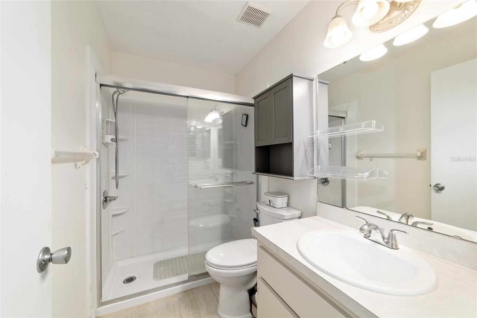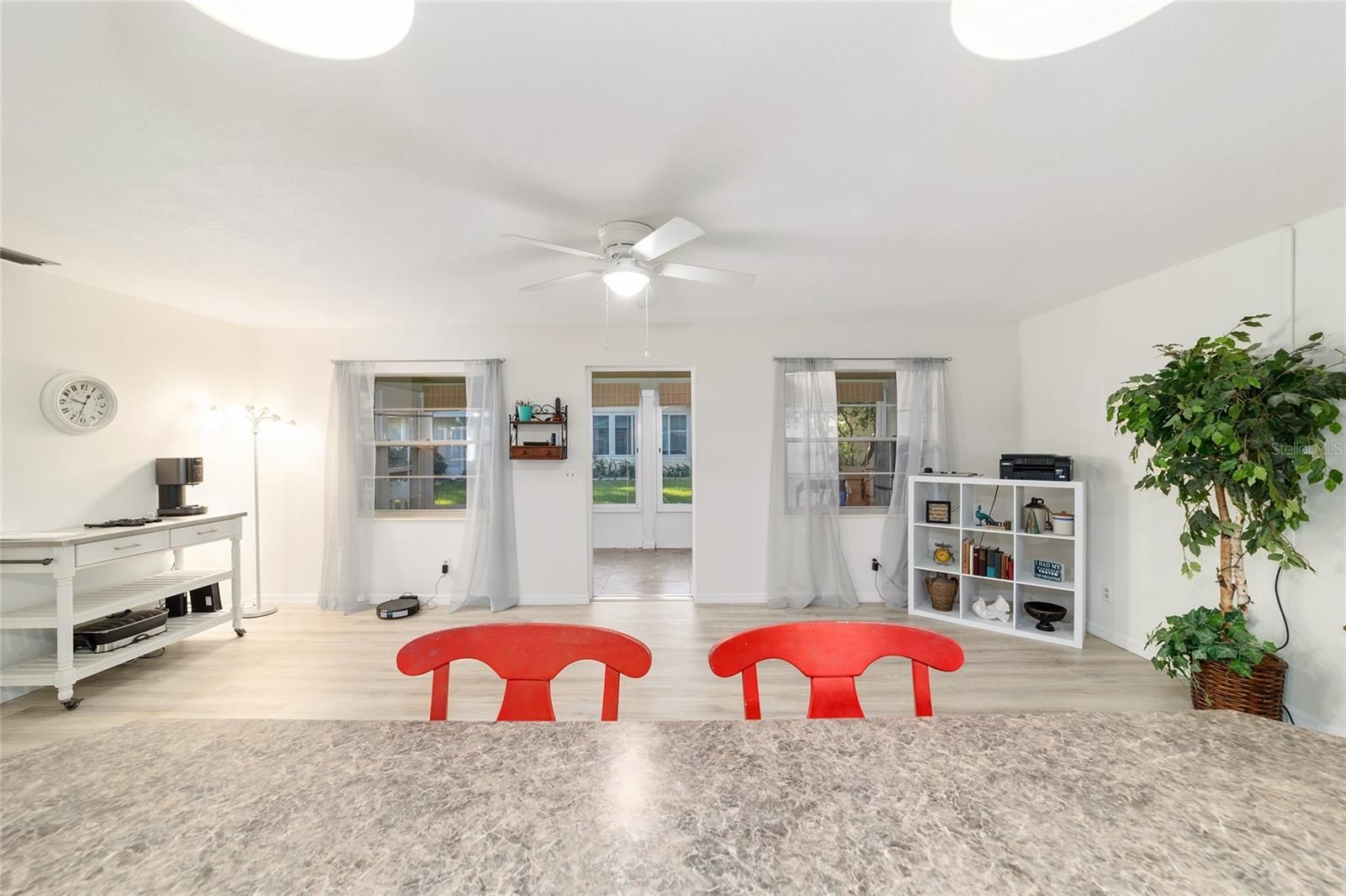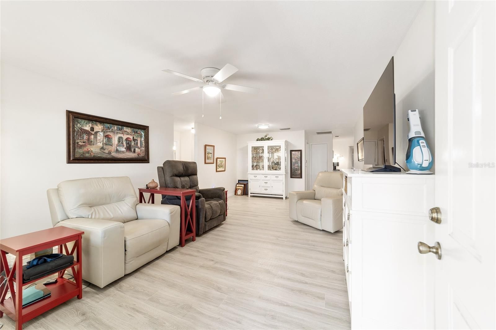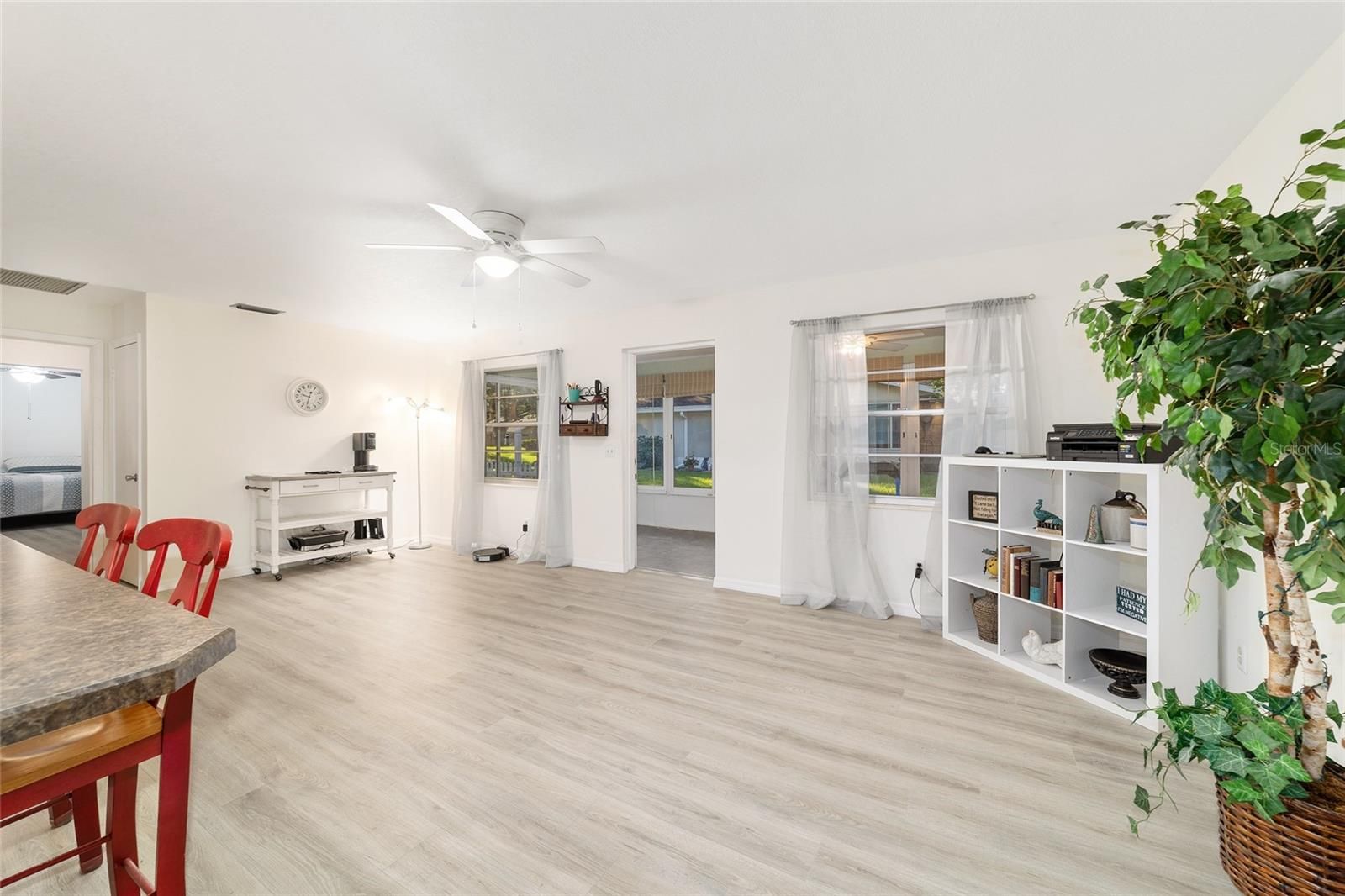 Clean Bostonian features 2 bedrooms, 2 bathrooms, and an OVERSIZED 21x24, 2 car garage. This welcoming home offers newer luxury vinyl plank throughout, updated light fixtures, plantation shutters, NO popcorn ceiling, and great curb appeal including a paver patio area out front. The spacious kitchen boasts stainless steel appliances, tile backsplash, plentiful storage, and an island. The primary suite features and a convenient walk through, walk-in closet for easy access to the great room and an updated ensuite bathroom with gorgeous vanity, glass enclosed step-in shower with upgraded tile surround, and a comfort height commode. The second bedroom easily accommodates a king-sized bed. The four-season lanai is perfect for enjoying Florida year-round and adds additional living space under heat & air while the paver patio offers a great spot to grill with the added privacy of a fence. For added convenience, roof was replaced in 2019, windows in 2007, and HVAC in 2020. On Top of the World is Ocala's premier 55+ golf course community with world class amenities and golf cart access to dining, shopping, entertainment, health, and beauty.