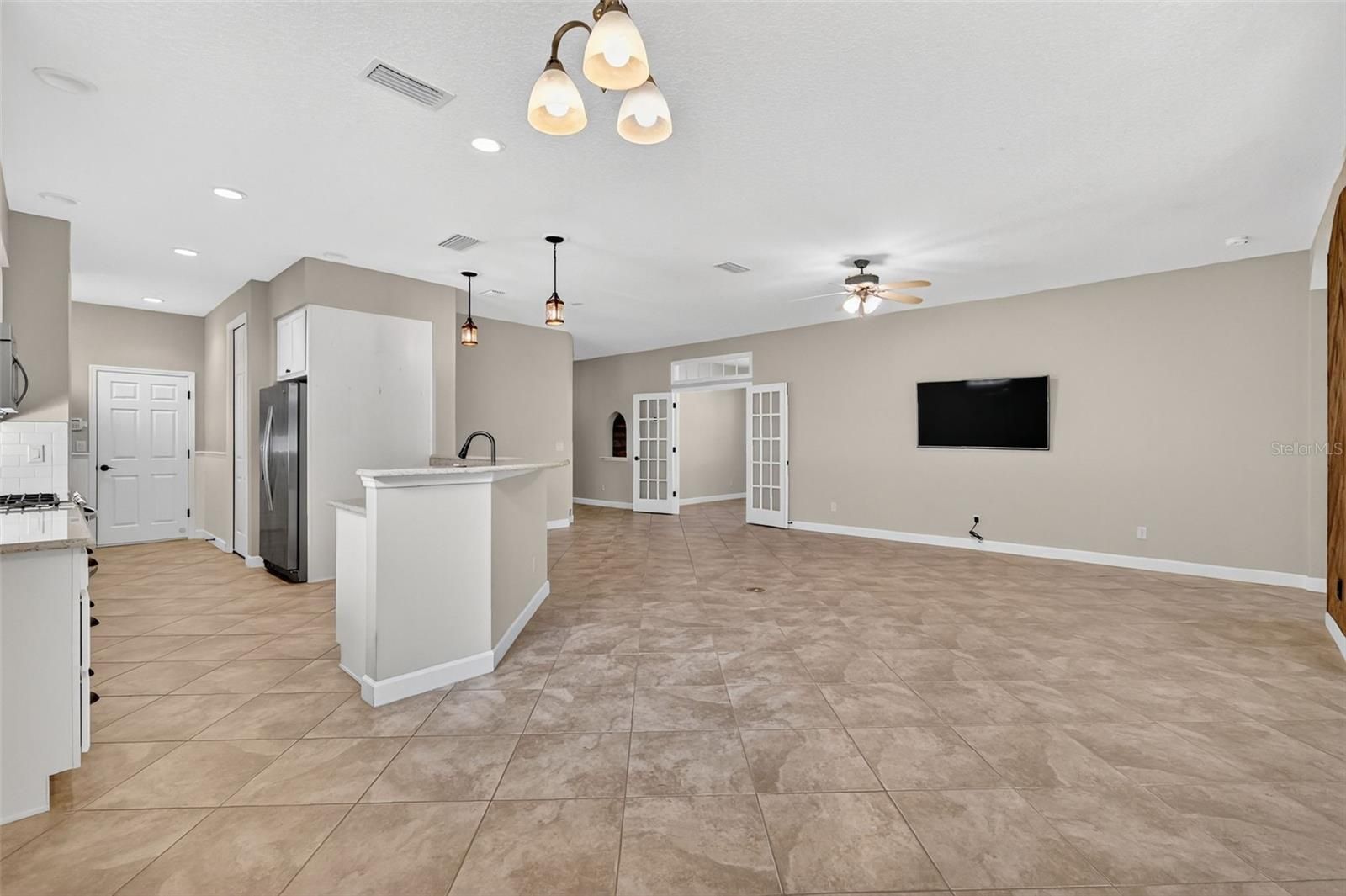 Welcome to 8852 Bridgeport Bay Circle, located in the premier 55+ active community of the Lakes of Mount Dora. This lakefront home offers stunning sunrises, serene water views, and beautifully upgraded living spaces. Upon entering through the front door, you are welcomed into the foyer, featuring an elegant arched display niche perfect for art or décor. The great room's open concept becomes the heart of this home, with its spaciousness, natural light, and gorgeous lake views. Surrounding the living area are the dining and breakfast rooms, either could be used as flexible space for entertaining or as additional seating areas in the living room. You'll find the 24x24 ceramic tile throughout just one of the many touches that make this house a home. The kitchen features quartz countertops, a subway-tiled backsplash, 42-inch cabinets, stainless-steel Whirlpool appliances, including a farmhouse-style single-bowl sink. Countertop-level glass-block windows ensure ample natural light, and there's a huge pantry. The primary suite finishes include window shutters, behind which are lovely views of the lake. There are two closets and a zero-entry walk-in shower with decorative glass tile accents. The vanity features Corian countertops and ample storage under the split sinks, and a private water closet. At the front of the home is the "guest suite" featuring the second bedroom and bath. The bay window in the second bedroom enhances the room's 150-square-foot footprint. A sliding barn door is just one of the highlights of the second bath, which also features wainscot, a tub/shower combo, and a large linen closet. Glass French doors accent the den/office/craft room and a full-sized closet. Here you'll find a quiet space for work or hobbies, or 3rd bedroom. Outdoor living is exceptional. Pass through the triple-sliders to the four-season patio with double-pane windows, or enjoy the open air on the paver patio under the pergola, with mature landscaping and beautiful lake views. Barbeque enthusiasts will appreciate the pre-plumbed natural gas line. At 27'x19', this oversized garage provides flexibility for everyone, whether used for a workshop, storage, or hobbies. It features two garage doors: the front for 2 cars, and the side for easy golf cart access. Pull-down screens on each door provide a great cross breeze without the worry of pesky bugs, making this the perfect She-shed or Man-cave. The Whirlpool front-loading washer and dryer anchor the laundry room. Additional perks include a utility sink and a closet.  Cat lovers will appreciate the discreet access to the kitty litter station via the "mouse-hole". Residents enjoy a wealth of resort-style amenities, including an 18,000-square-foot clubhouse, resort-style pool, tennis and pickleball courts, bocce ball, croquet lawn, four miles of interconnecting waterways, scenic trails, inviting fire pits, and gated RV and boat parking. The HOA fee of $280/month includes internet, cable, irrigation, and access to numerous clubs and activities. Golf enthusiasts will enjoy the nearby Country Club of Mount Dora, while the vibrant towns of Mount Dora and Eustis host art galleries, festivals, restaurants, and shopping. Beaches and theme parks are just 45–60 minutes away. This home seamlessly blends elegant indoor spaces, outdoor enjoyment, and a vibrant lifestyle, making it ideal for those seeking comfort, leisure, and community in Central Florida’s Lakes of Mount Dora.