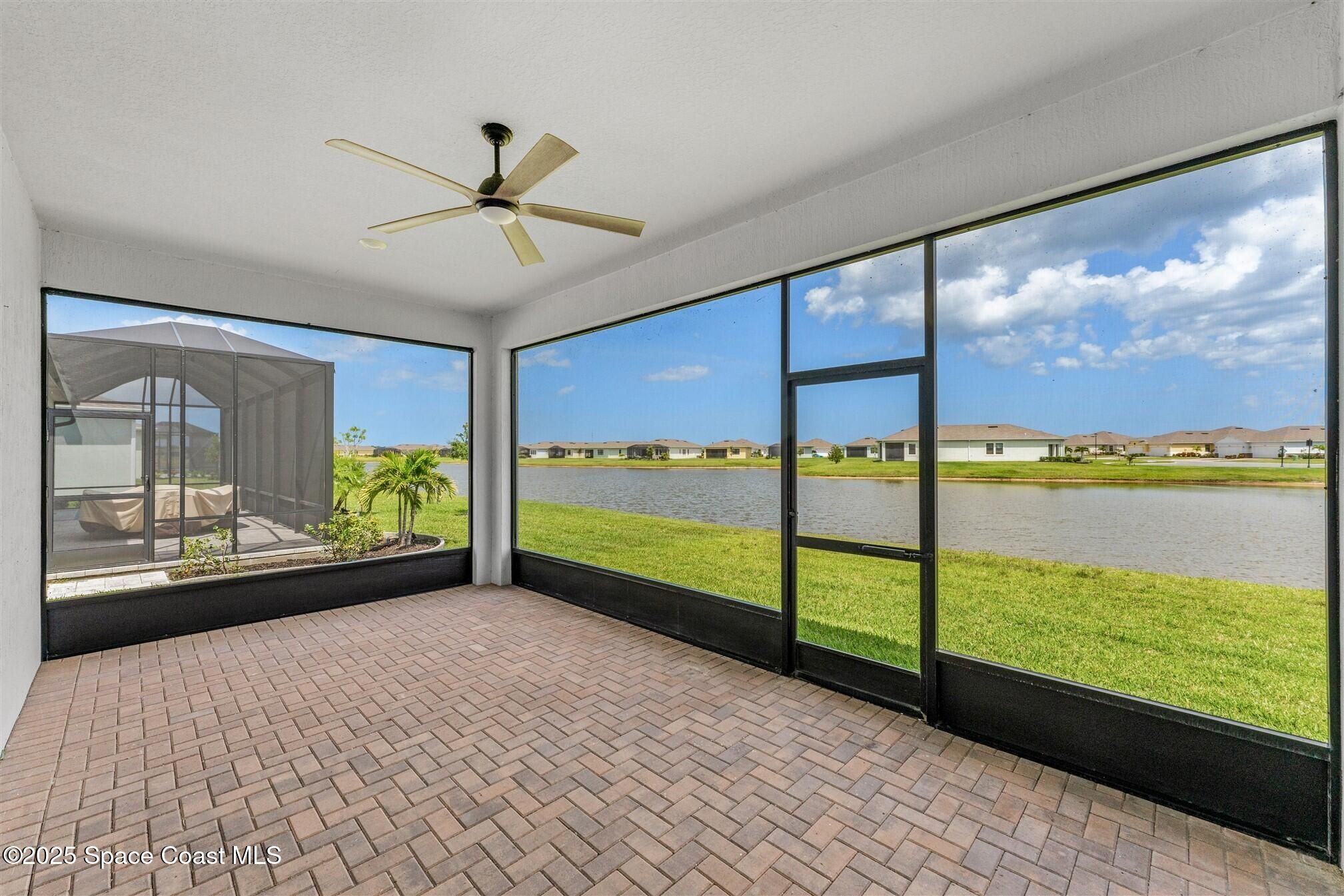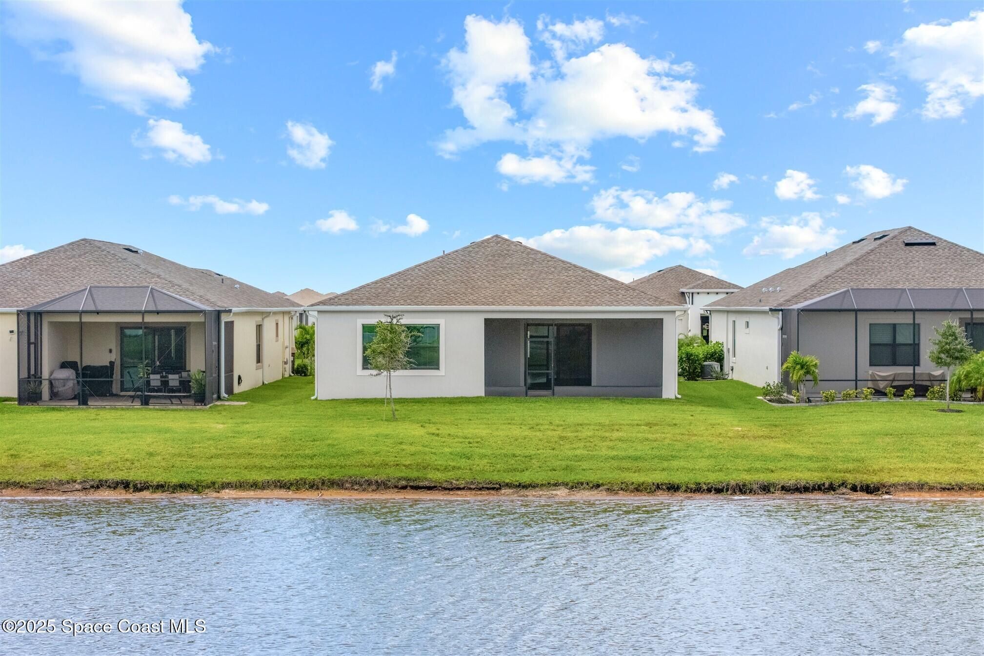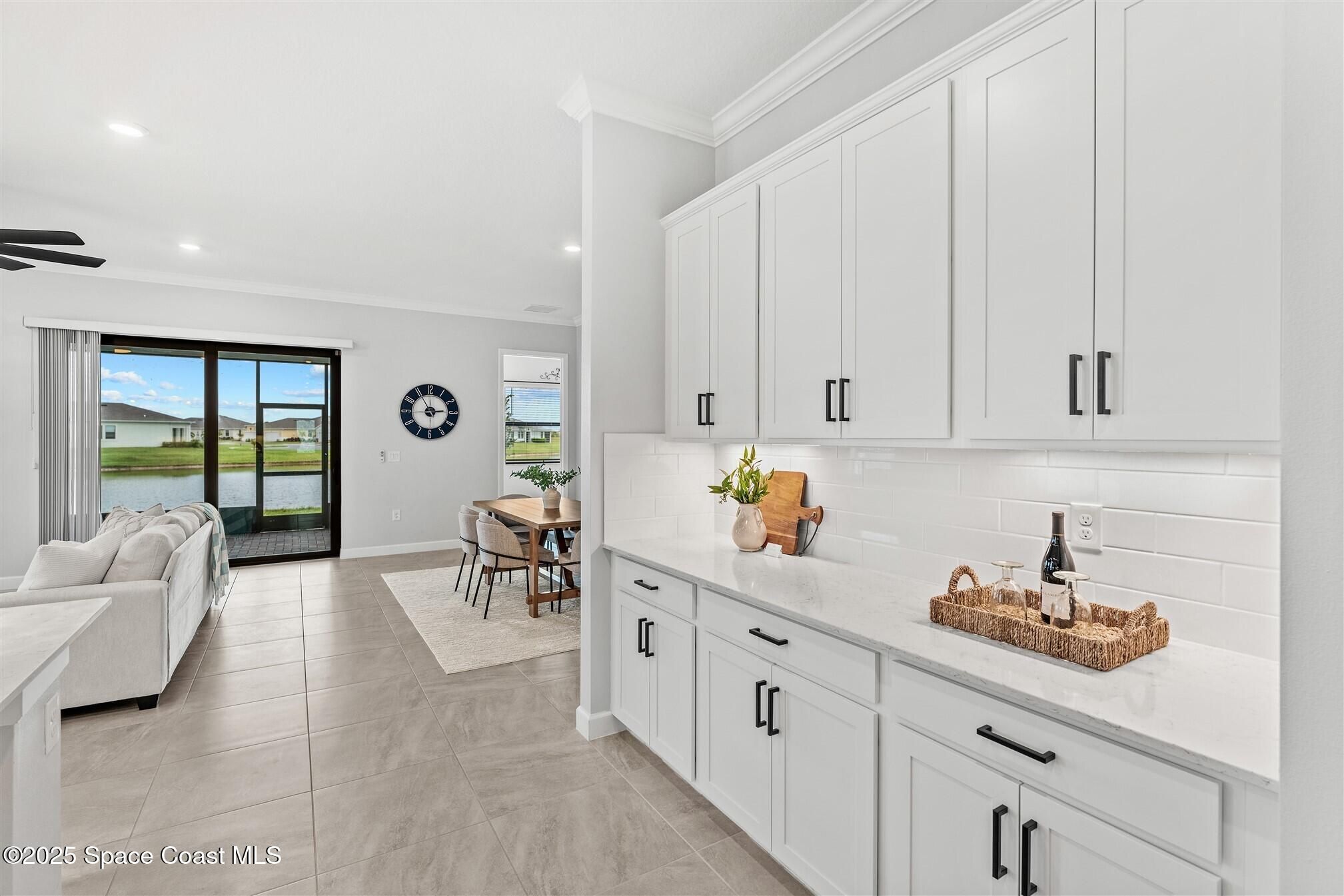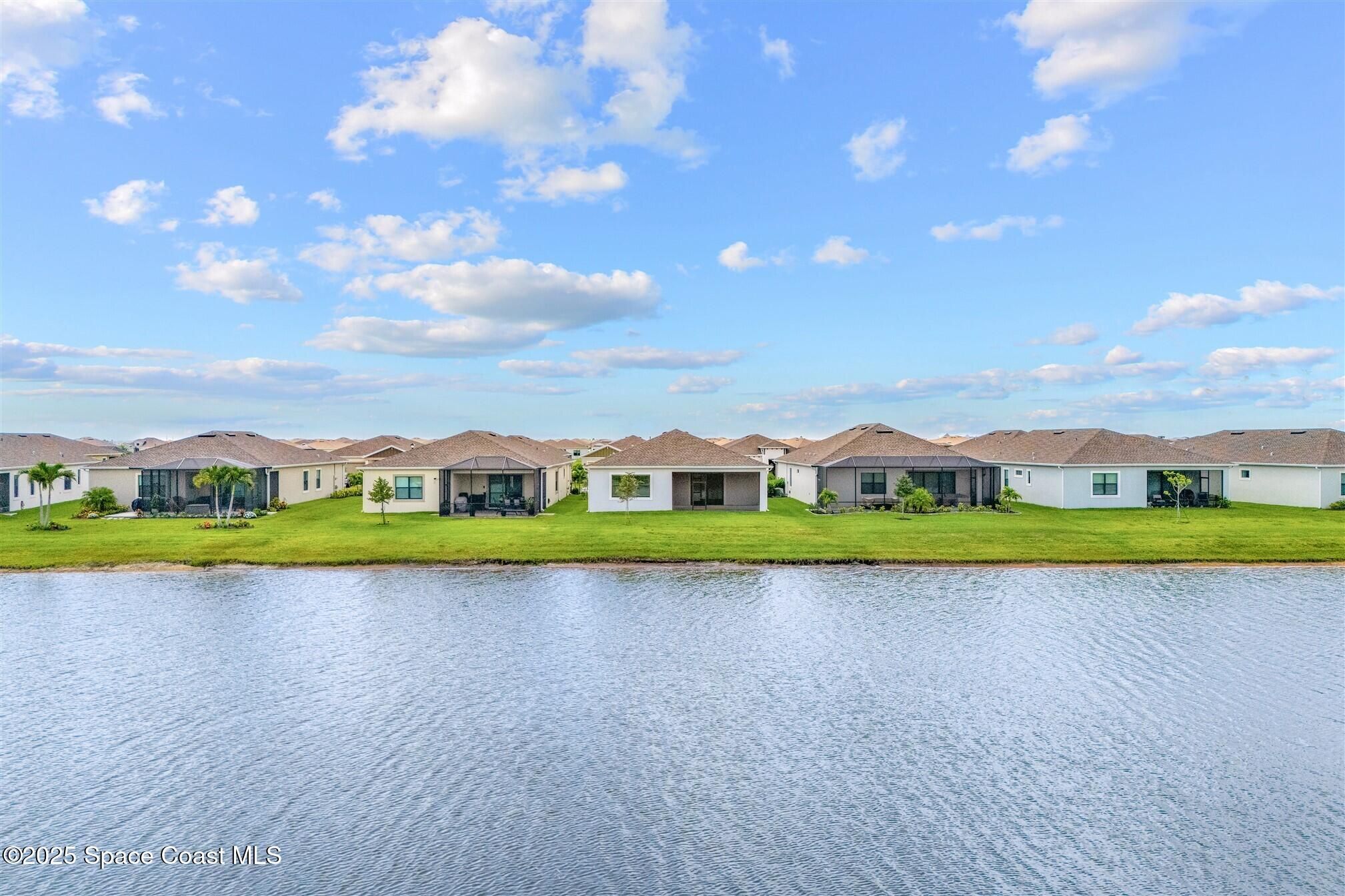 Stunning 4 bedroom, 3 1/2 bath, waterfront home in Bridgewater, Viera's popular gated 55+ resort style community. 3 bedrooms are en-suites, (4th is used as study) making this home perfect for out-of-town guests! This 2-year-old meticulous home is loaded with extras including IMPACT WINDOWS and SLIDERS, crown molding throughout, tile floors (no carpet!), screened lanai, luxury bath package, ceiling fans, pendent lights and 8' doors. White kitchen cabinets with tile backsplash, upgraded sink, faucet, and disposal! Top of the line appliances and undercabinet lighting! Dream laundry room with cabinets and a sink! Oversized primary bedroom and primary bath with a huge walk-in closet with custom built-ins! 20'X21' garage with epoxy floors! Truly turnkey and ready for new owners to move in! Assumable, low interest, VA mortgage! Unbelievable clubhouse w/ heated pool and spa, movie theater, fitness center, coffee lounge, tennis, pickleball! Close to shopping, restaurants, ocean beaches!