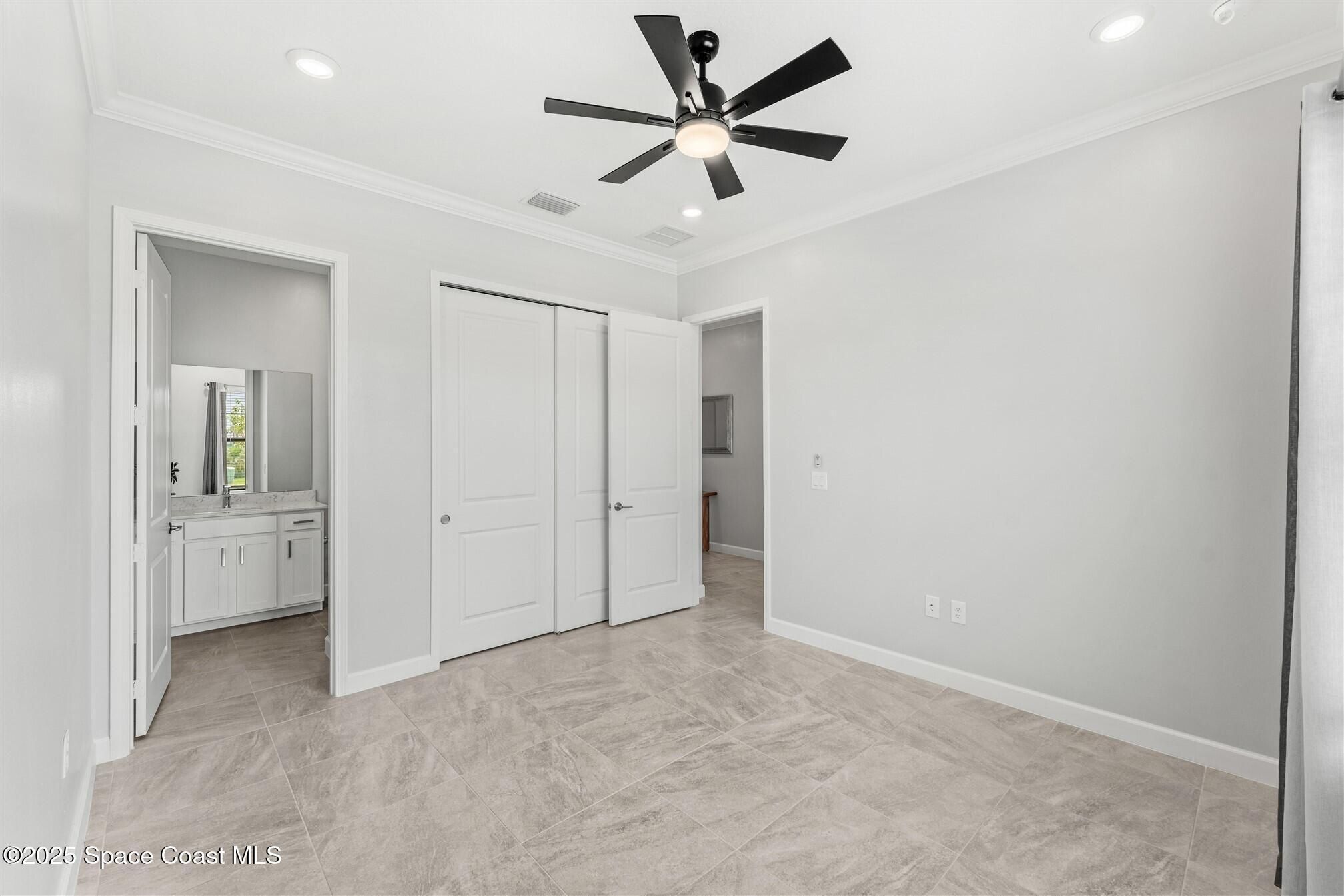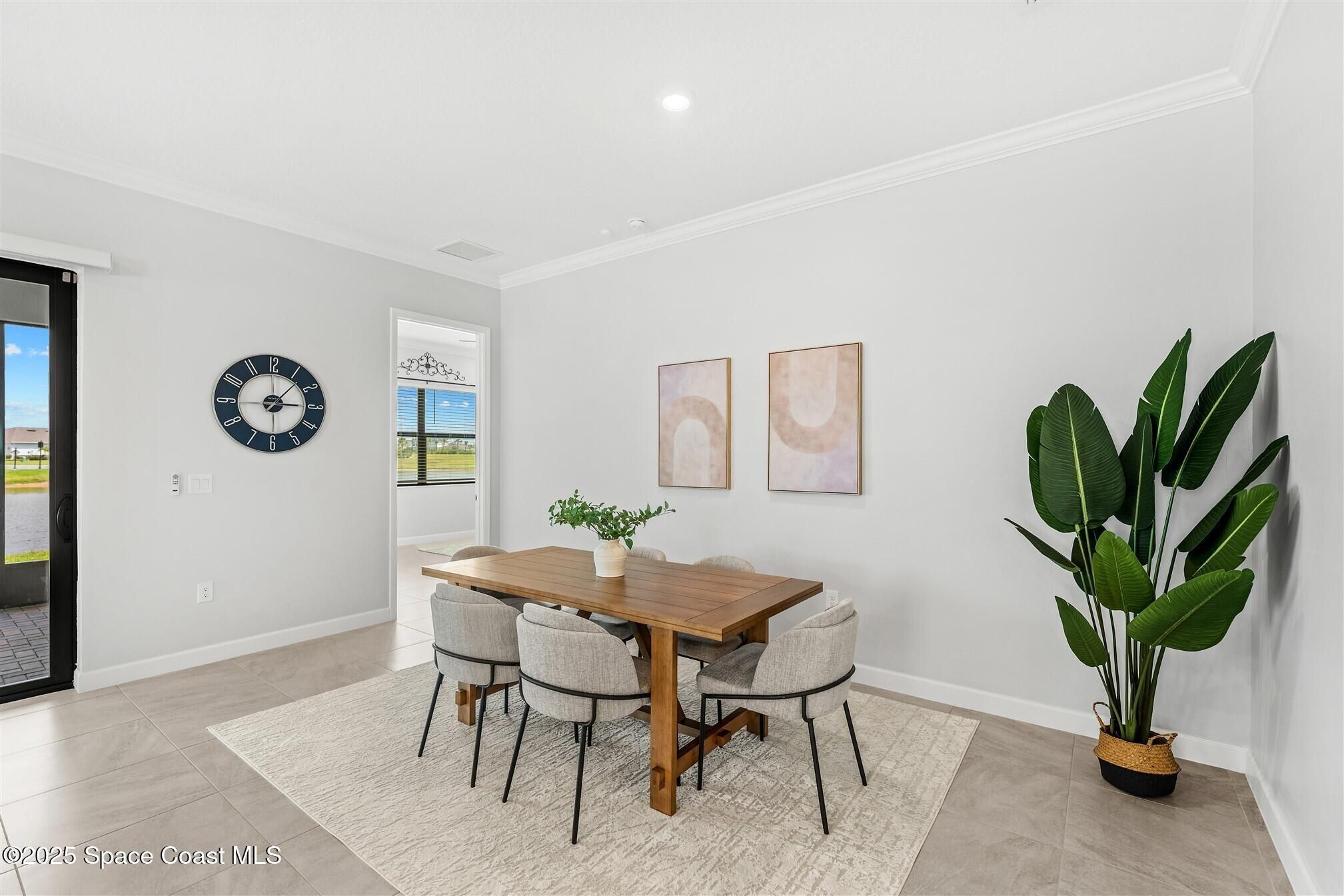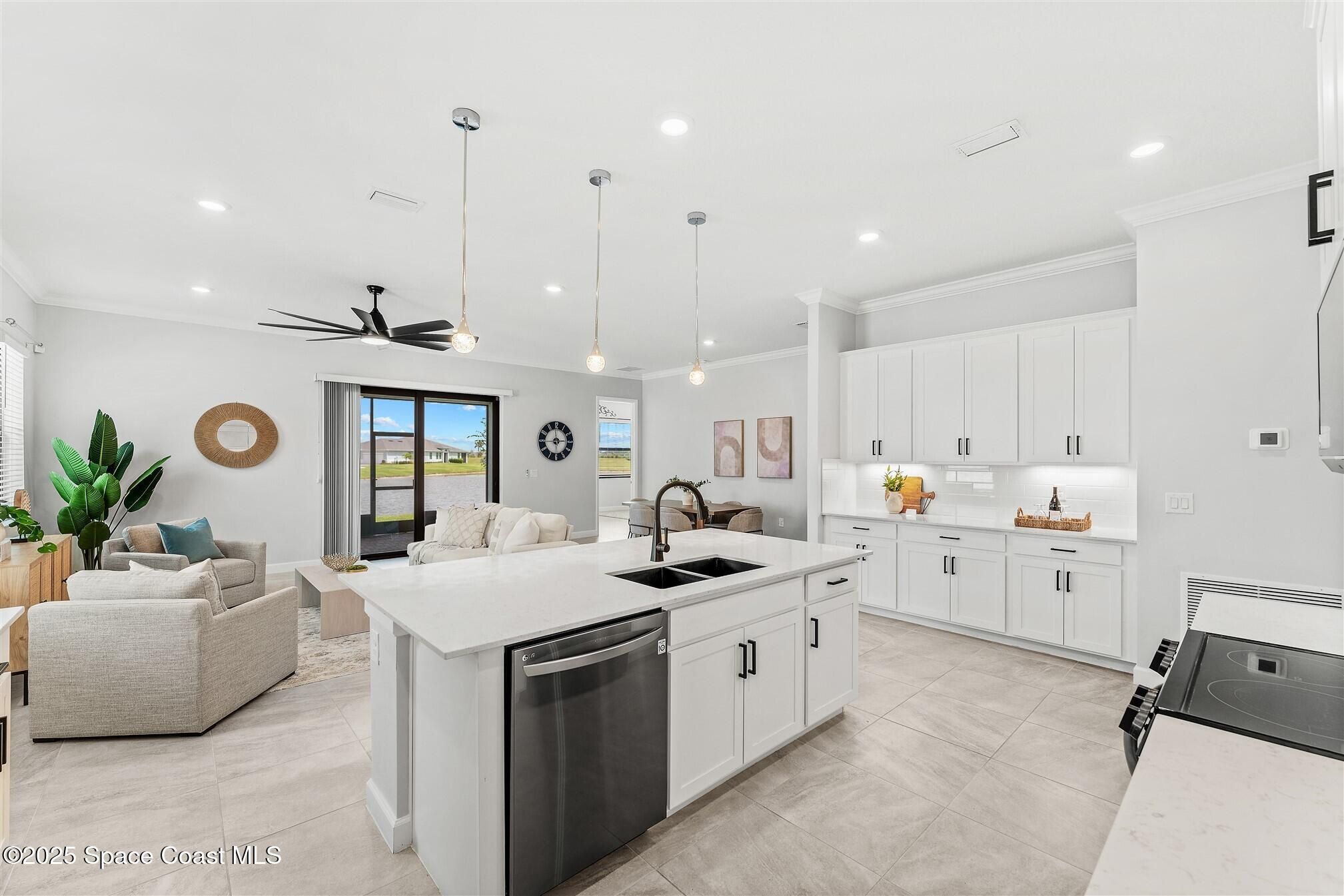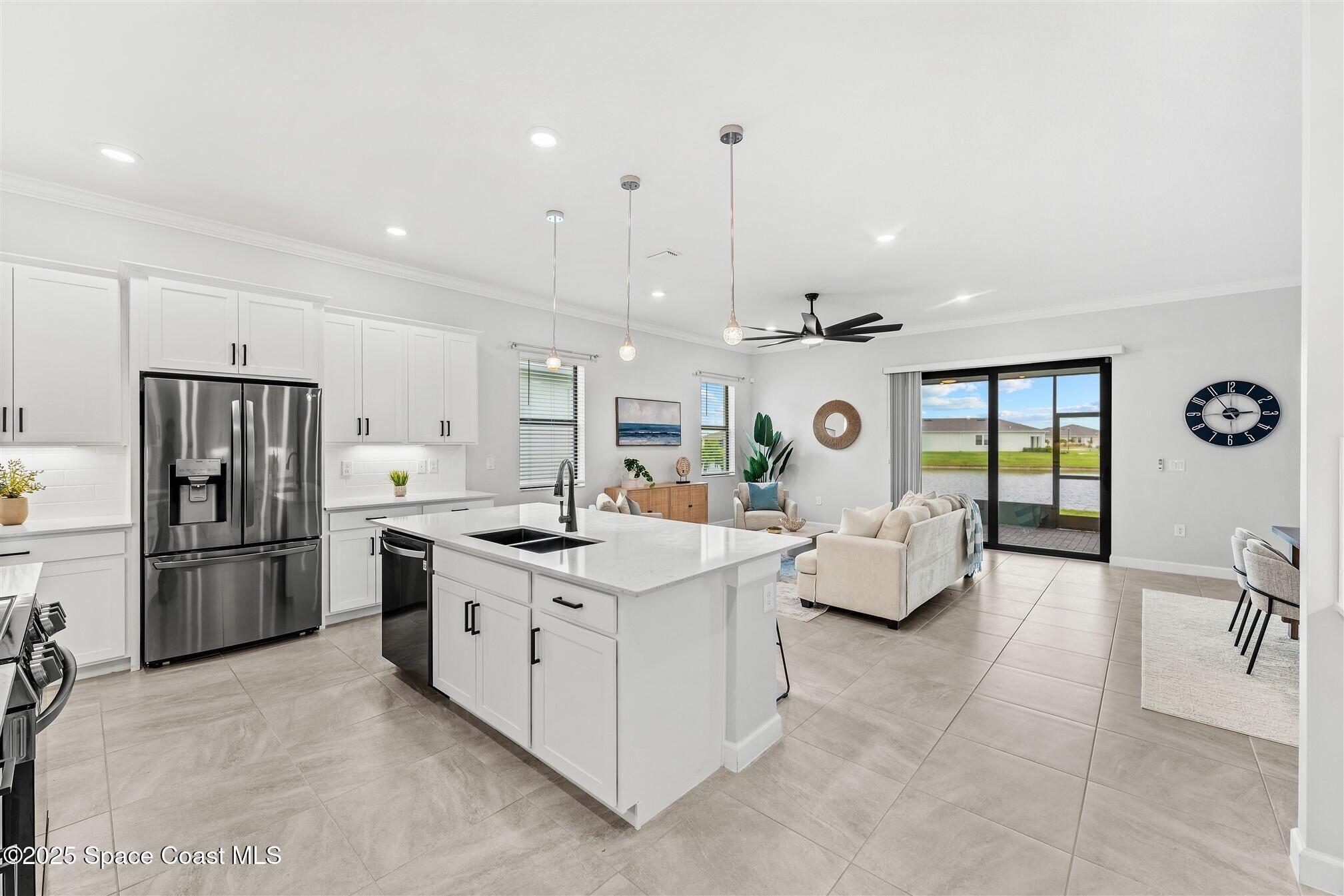 Stunning 4 bedroom, 3 1/2 bath, waterfront home in Bridgewater, Viera's popular gated 55+ resort style community. 3 bedrooms are en-suites, (4th is used as study) making this home perfect for out-of-town guests! This 2-year-old meticulous home is loaded with extras including IMPACT WINDOWS and SLIDERS, crown molding throughout, tile floors (no carpet!), screened lanai, luxury bath package, ceiling fans, pendent lights and 8' doors. White kitchen cabinets with tile backsplash, upgraded sink, faucet, and disposal! Top of the line appliances and undercabinet lighting! Dream laundry room with cabinets and a sink! Oversized primary bedroom and primary bath with a huge walk-in closet with custom built-ins! 20'X21' garage with epoxy floors! Truly turnkey and ready for new owners to move in! Assumable, low interest, VA mortgage! Unbelievable clubhouse w/ heated pool and spa, movie theater, fitness center, coffee lounge, tennis, pickleball! Close to shopping, restaurants, ocean beaches!