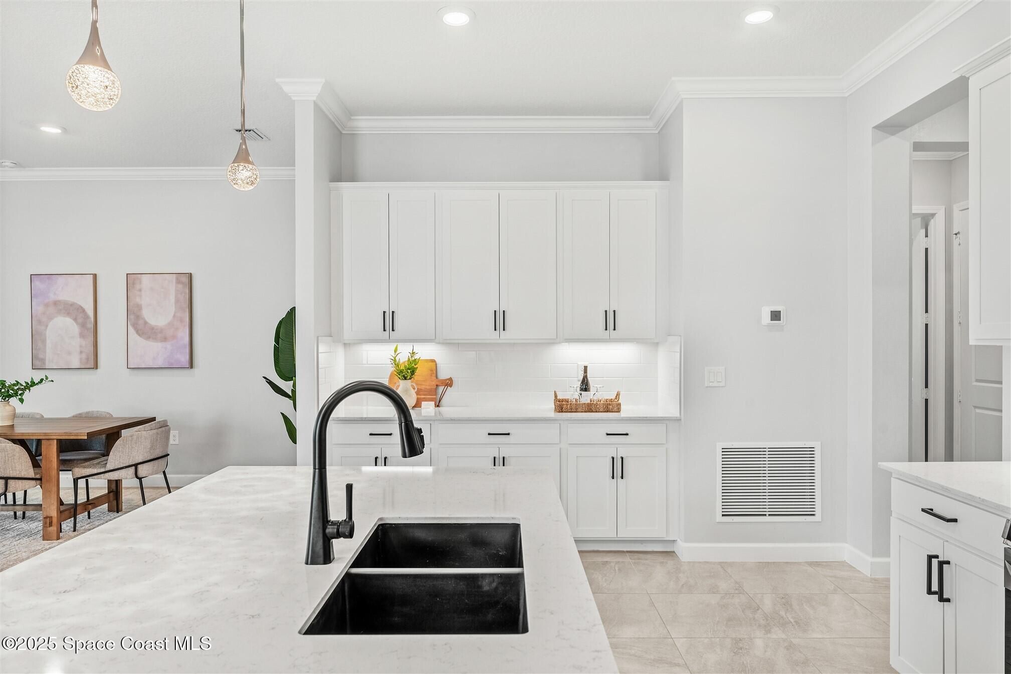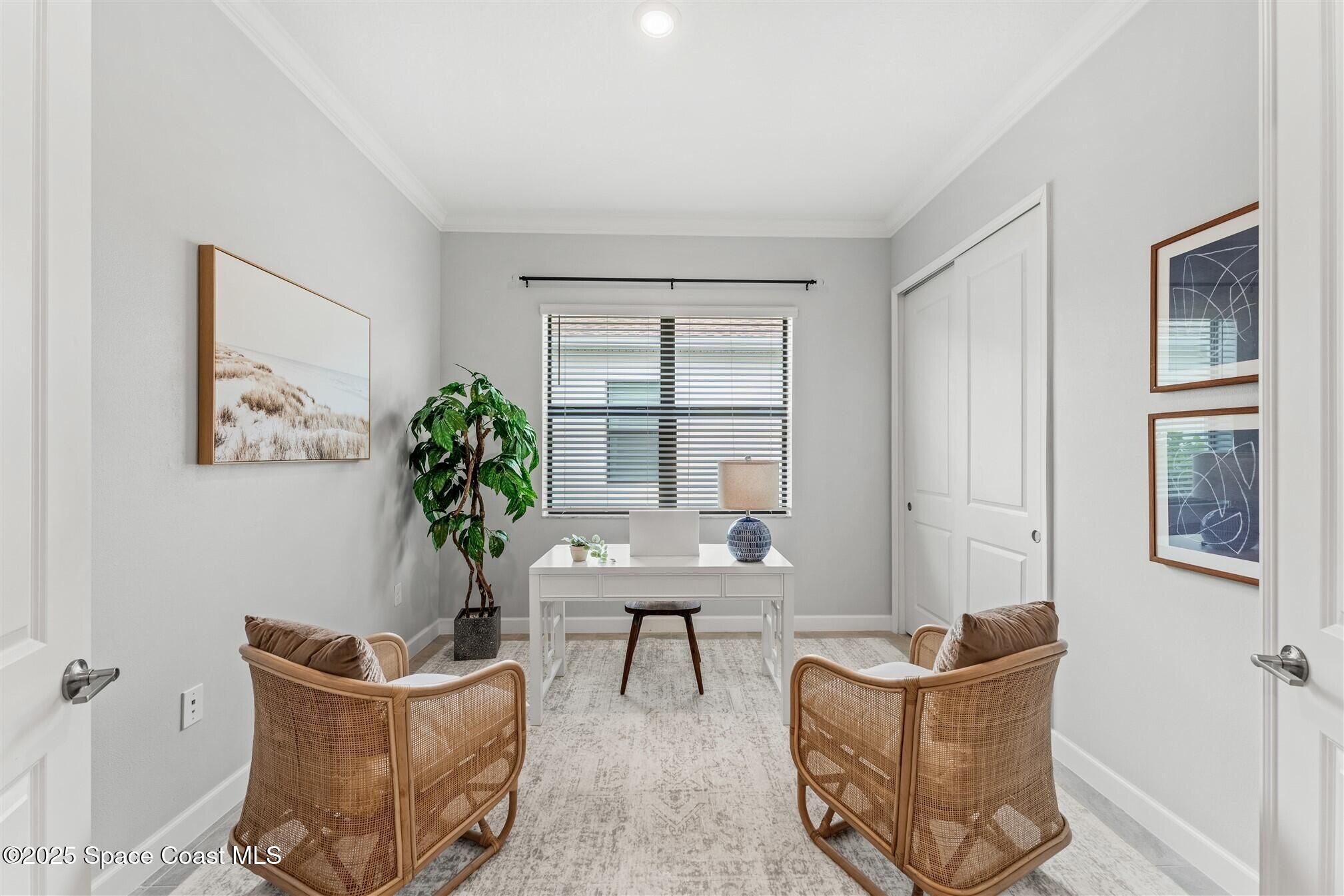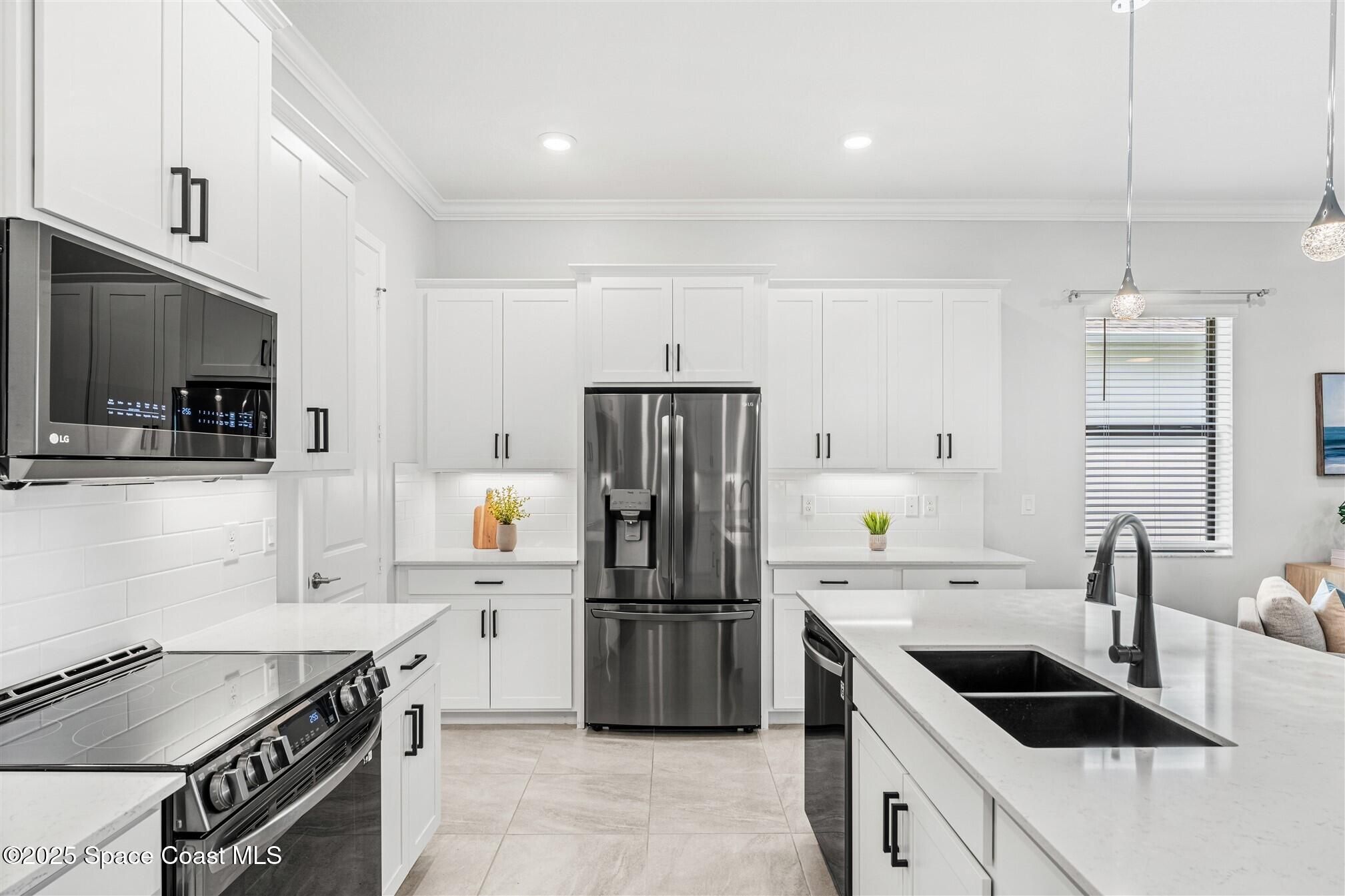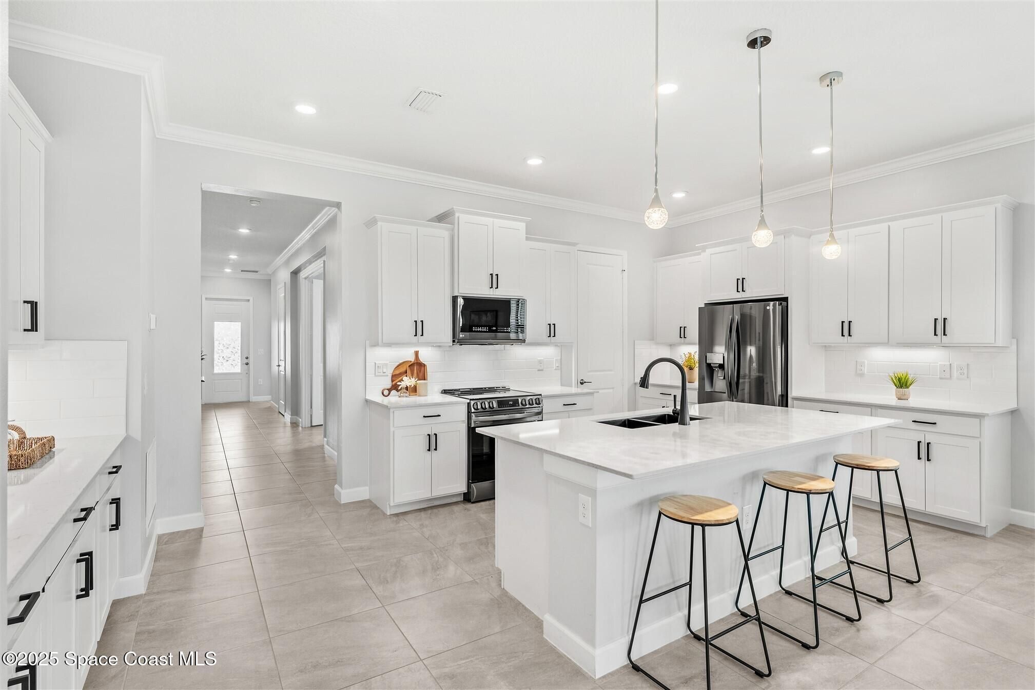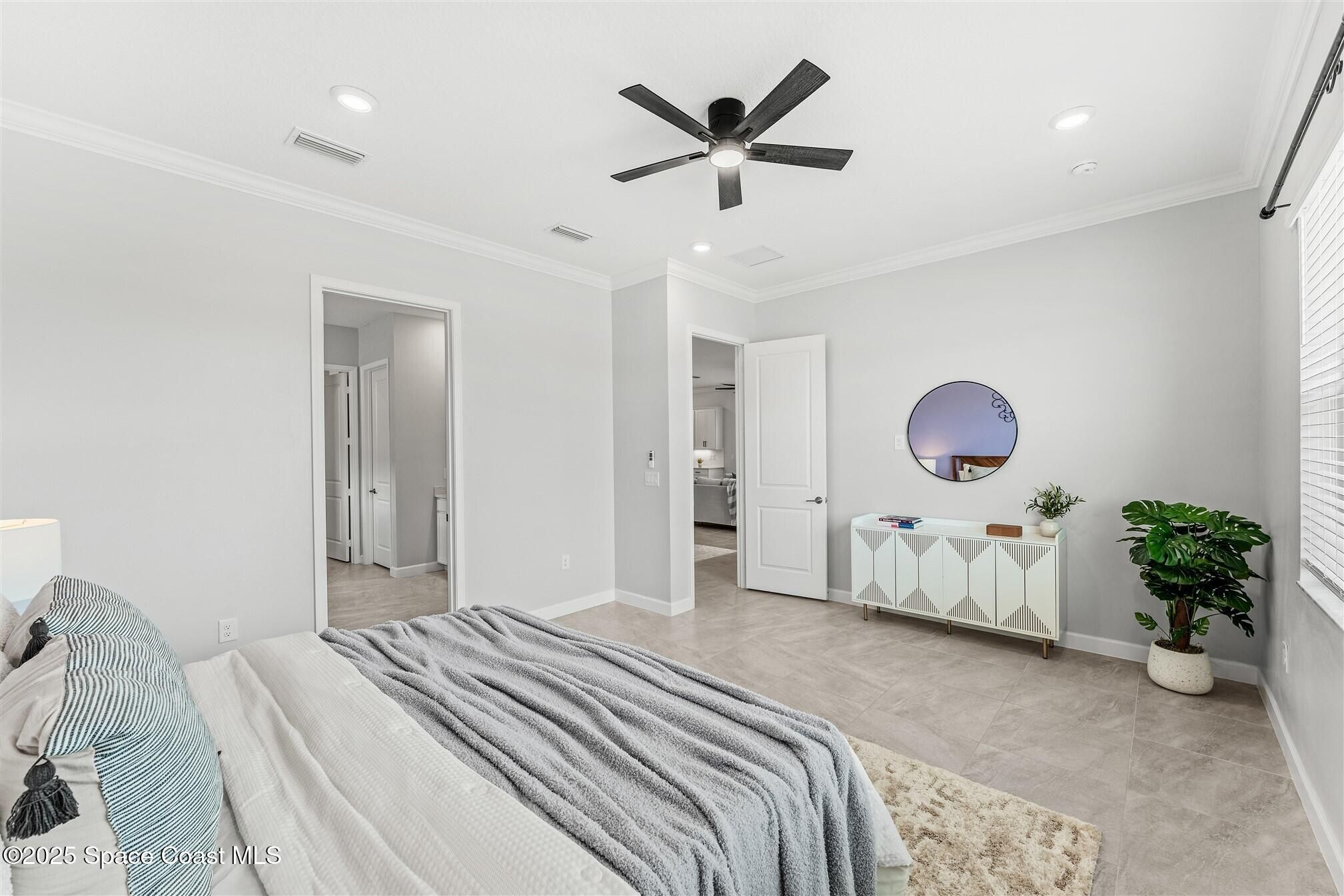 Stunning 4 bedroom, 3 1/2 bath, waterfront home in Bridgewater, Viera's popular gated 55+ resort style community. 3 bedrooms are en-suites, (4th is used as study) making this home perfect for out-of-town guests! This 2-year-old meticulous home is loaded with extras including IMPACT WINDOWS and SLIDERS, crown molding throughout, tile floors (no carpet!), screened lanai, luxury bath package, ceiling fans, pendent lights and 8' doors. White kitchen cabinets with tile backsplash, upgraded sink, faucet, and disposal! Top of the line appliances and undercabinet lighting! Dream laundry room with cabinets and a sink! Oversized primary bedroom and primary bath with a huge walk-in closet with custom built-ins! 20'X21' garage with epoxy floors! Truly turnkey and ready for new owners to move in! Assumable, low interest, VA mortgage! Unbelievable clubhouse w/ heated pool and spa, movie theater, fitness center, coffee lounge, tennis, pickleball! Close to shopping, restaurants, ocean beaches!