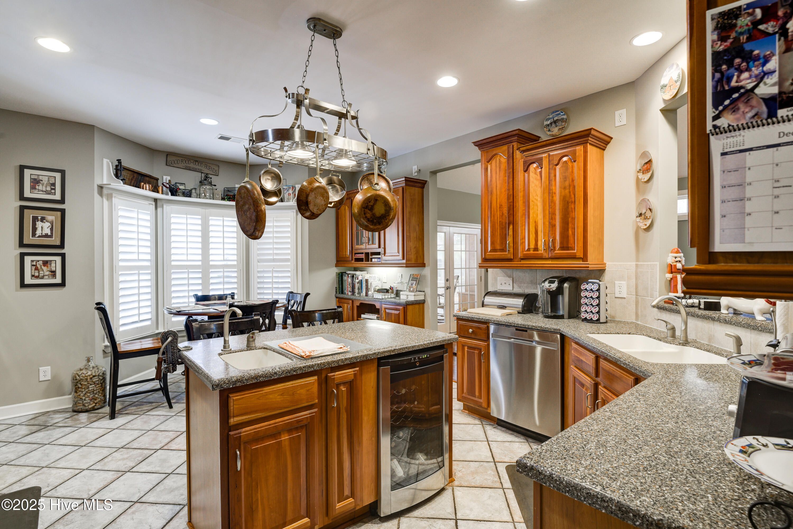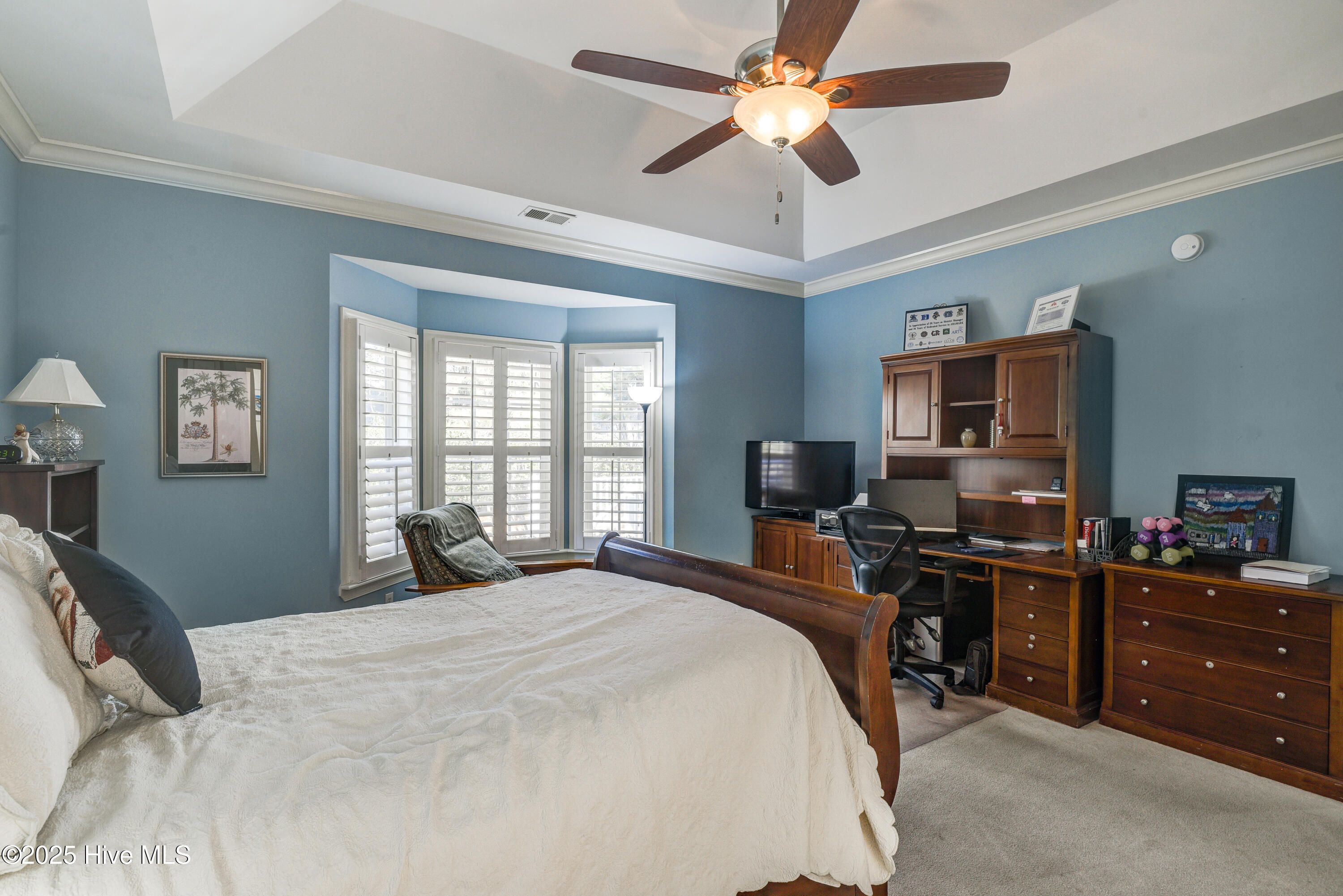 - Master Downstairs, Walk-In Closet(s), Tray Ceiling(s), High Ceilings, Entrance Foyer, Solid Surface Counters, Whirlpool, Bookcases, Kitchen Island, Ceiling Fan(s), Pantry, Walk-In Shower, Blinds