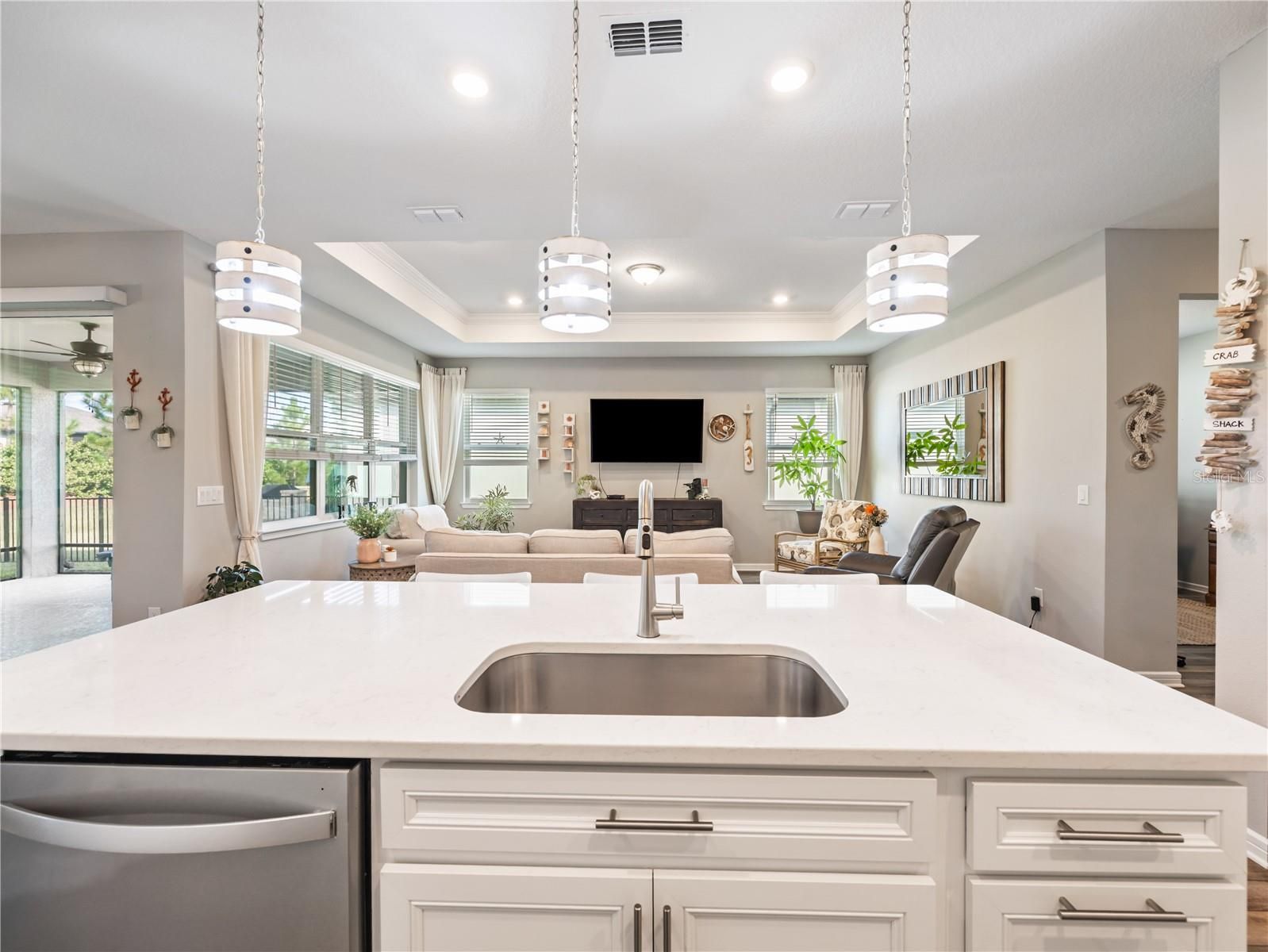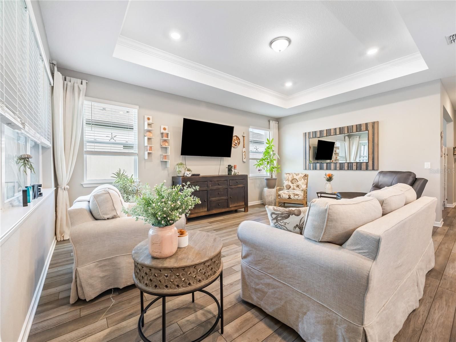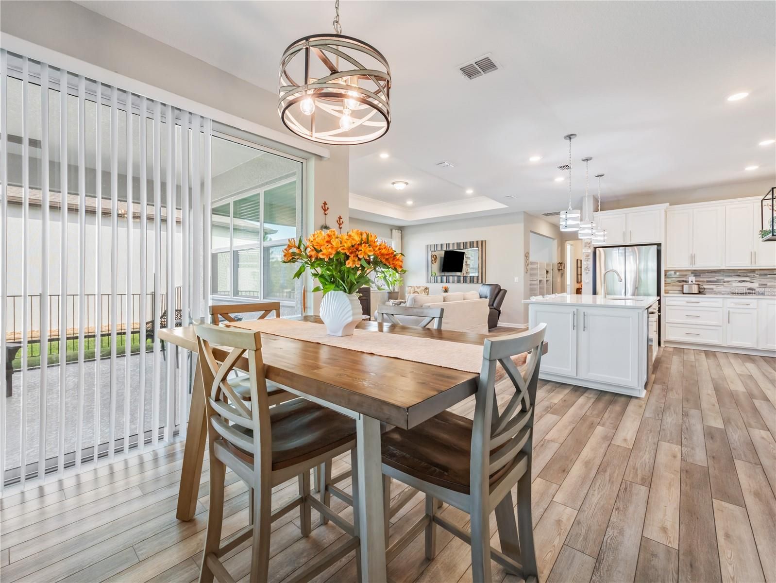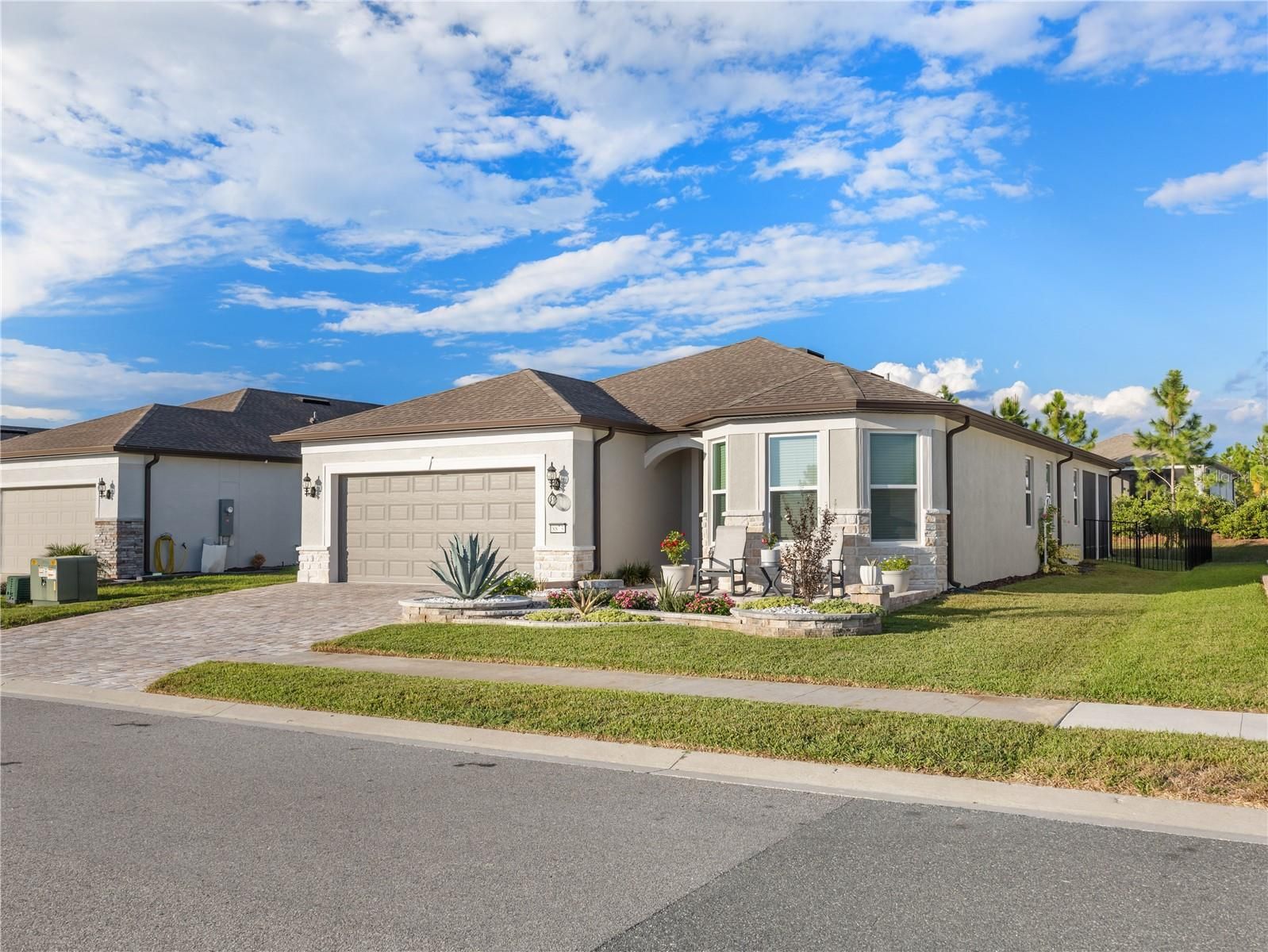 Welcome to this beautifully upgraded Mystique model in the sought-after 55+ community of Del Webb Stone Creek. This 2-bedroom, 2-bath home with a versatile flex room combines style and functionality with thoughtful details throughout. Inside, luxury vinyl flooring flows seamlessly through the main living areas, complemented by tile in the bathrooms. The gourmet kitchen features quartz countertops, a tiled backsplash, soft-close 42" white cabinets, and premium finishes, making it the heart of the home. The open living space showcases a tray ceiling and added recessed lighting, creating a bright and elegant atmosphere. The primary suite offers an extended tiled walk-in shower, while the secondary bath also features a beautifully tiled shower. Modern conveniences include smart home features for comfort and ease. Step outside to enjoy the extended screened lanai and a fully fenced backyard, perfect for entertaining or relaxing in privacy. Additional upgrades include an epoxy-coated extended garage with a widened paver driveway, providing both curb appeal and functionality. This home blends luxury, comfort, and convenience—all within a vibrant, amenity-rich community.