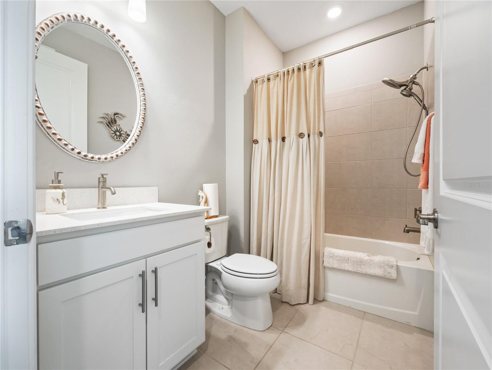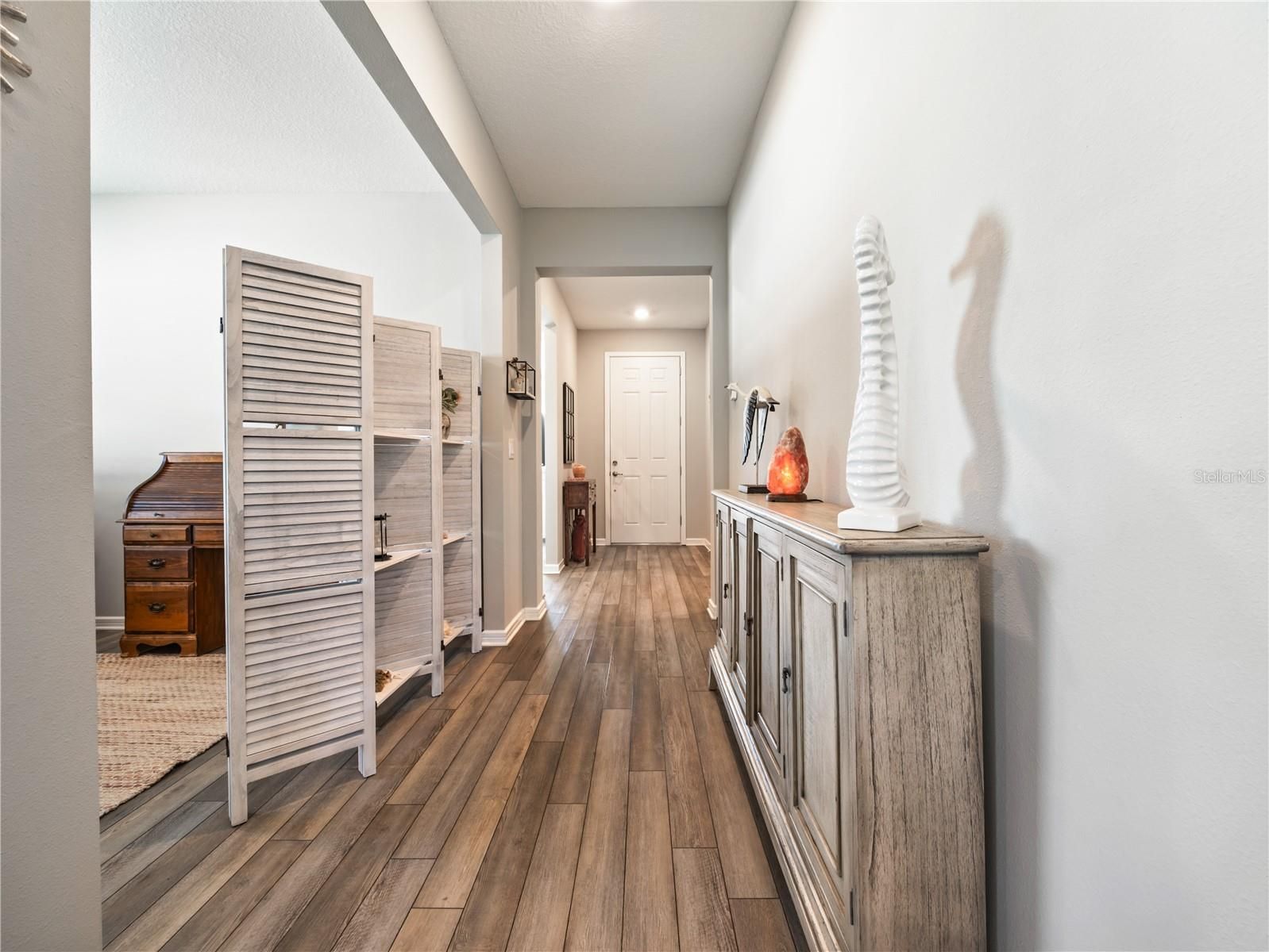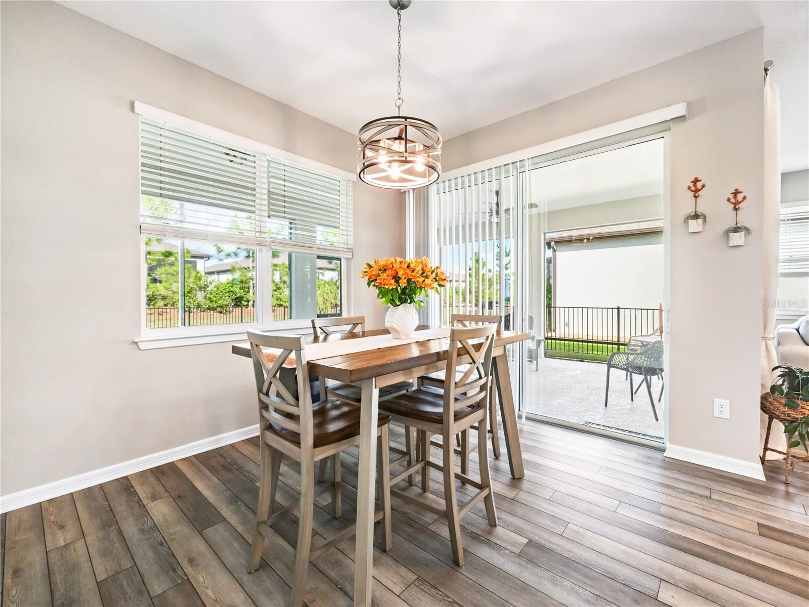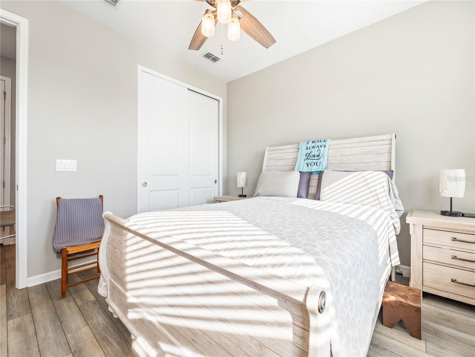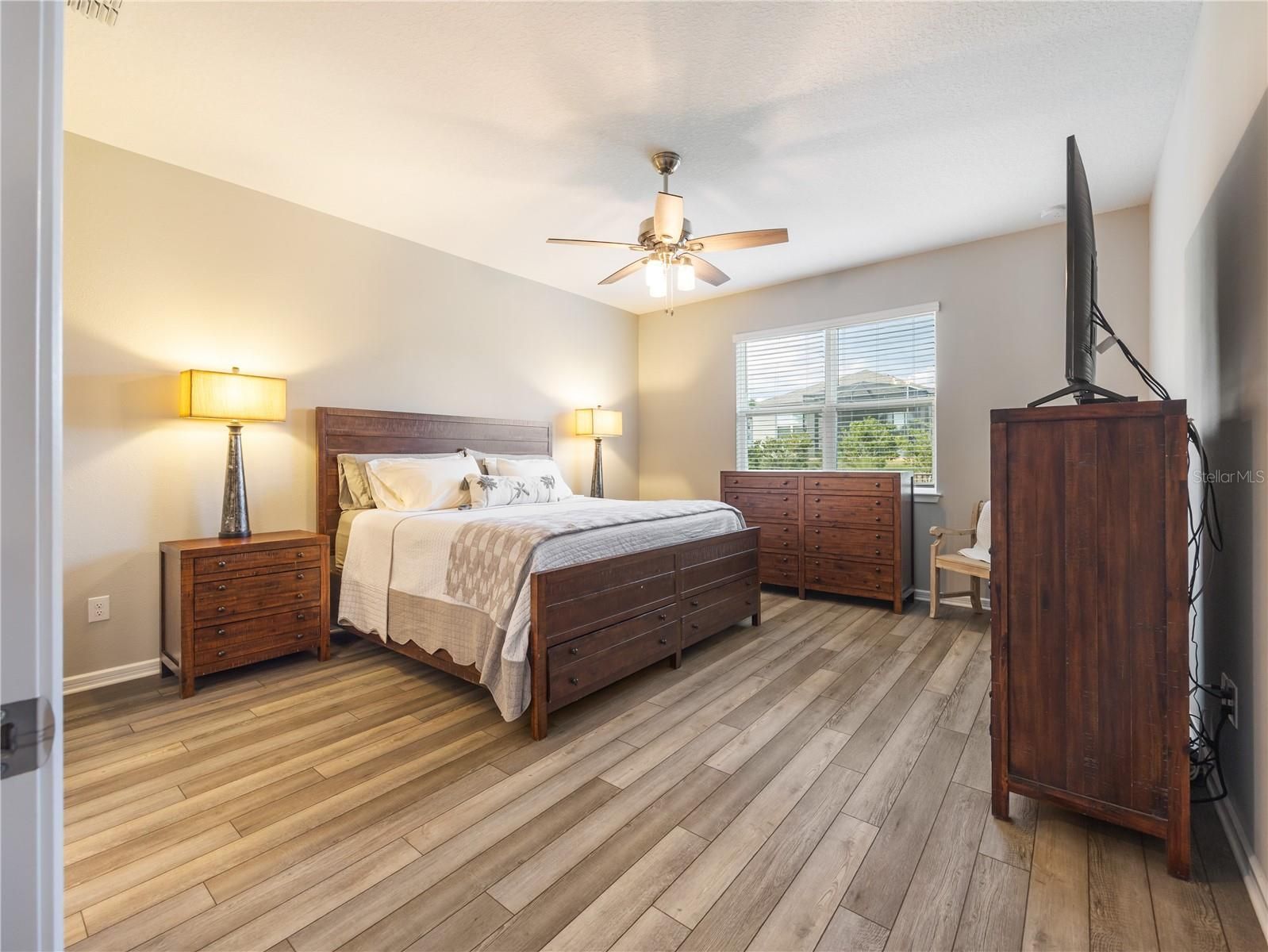 Welcome to this beautifully upgraded Mystique model in the sought-after 55+ community of Del Webb Stone Creek. This 2-bedroom, 2-bath home with a versatile flex room combines style and functionality with thoughtful details throughout. Inside, luxury vinyl flooring flows seamlessly through the main living areas, complemented by tile in the bathrooms. The gourmet kitchen features quartz countertops, a tiled backsplash, soft-close 42" white cabinets, and premium finishes, making it the heart of the home. The open living space showcases a tray ceiling and added recessed lighting, creating a bright and elegant atmosphere. The primary suite offers an extended tiled walk-in shower, while the secondary bath also features a beautifully tiled shower. Modern conveniences include smart home features for comfort and ease. Step outside to enjoy the extended screened lanai and a fully fenced backyard, perfect for entertaining or relaxing in privacy. Additional upgrades include an epoxy-coated extended garage with a widened paver driveway, providing both curb appeal and functionality. This home blends luxury, comfort, and convenience—all within a vibrant, amenity-rich community.