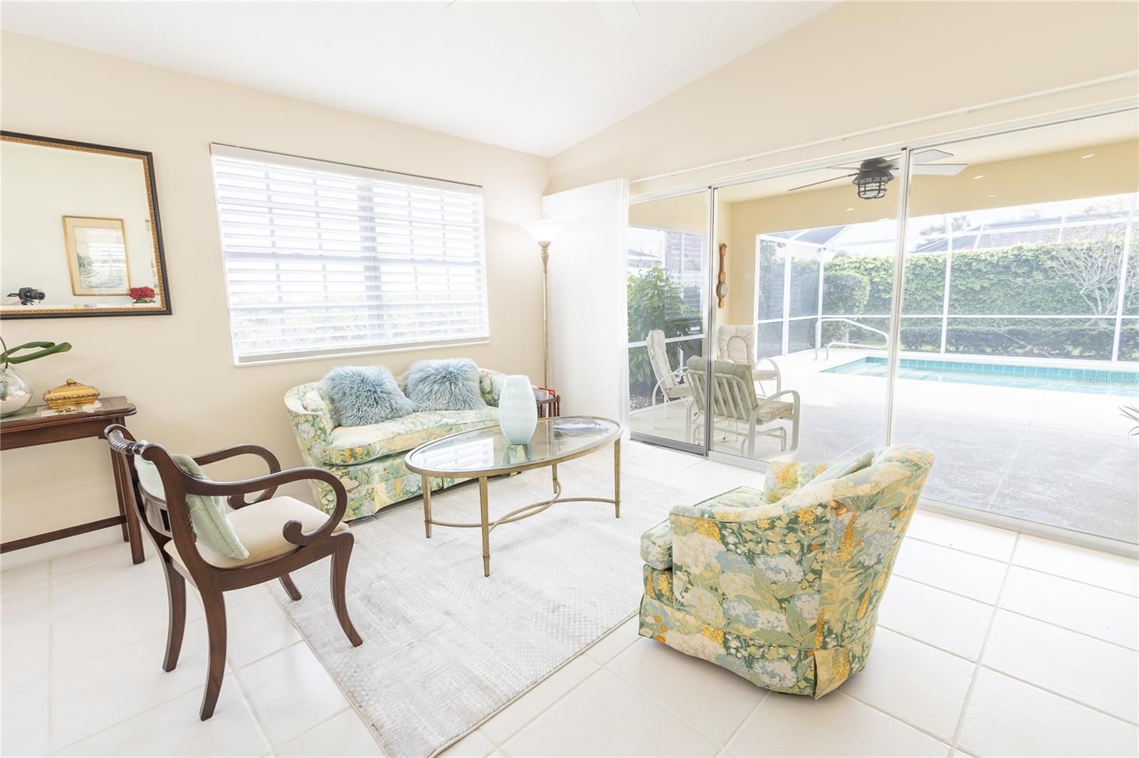 Welcome to this beautifully maintained Capri III residence in the highly sought after VillageWalk, a gated, resort-style community known for its exceptional amenities and serene surroundings. Perfectly positioned to maximize both privacy and location, this home enjoys a tranquil setting with lush green space just outside your door, offering peaceful views and a true sense of retreat. Located within Palmer Ranch, you’re only minutes from the world-famous Siesta Key Beach, top-rated dining, boutique shopping, and the scenic Legacy Trail. Enjoy the convenience of being close to everything while coming home to a private oasis. Inside, this thoughtfully designed two-bedroom, two-bath home offers light filled living spaces enhanced with smart home features. Tile flooring flows through the main living areas, the bright kitchen features granite countertops, ample cabinetry, and an open feel ideal for everyday living and entertaining. The spacious great room features soaring vaulted ceilings, creating a warm and inviting atmosphere. A separate family room overlooks the heated pool and screened lanai, your own secluded outdoor escape. Residents of VillageWalk enjoy an unmatched lifestyle with a clubhouse, geothermal heated resort-style pool and lap pool, six Har-Tru tennis courts, fitness center, meeting and event spaces, gift shop, gas station, and on-site restaurant; all within the gates of this beautifully maintained community. This is more than a home; it’s a private retreat in one of Sarasota’s most desirable locations.
