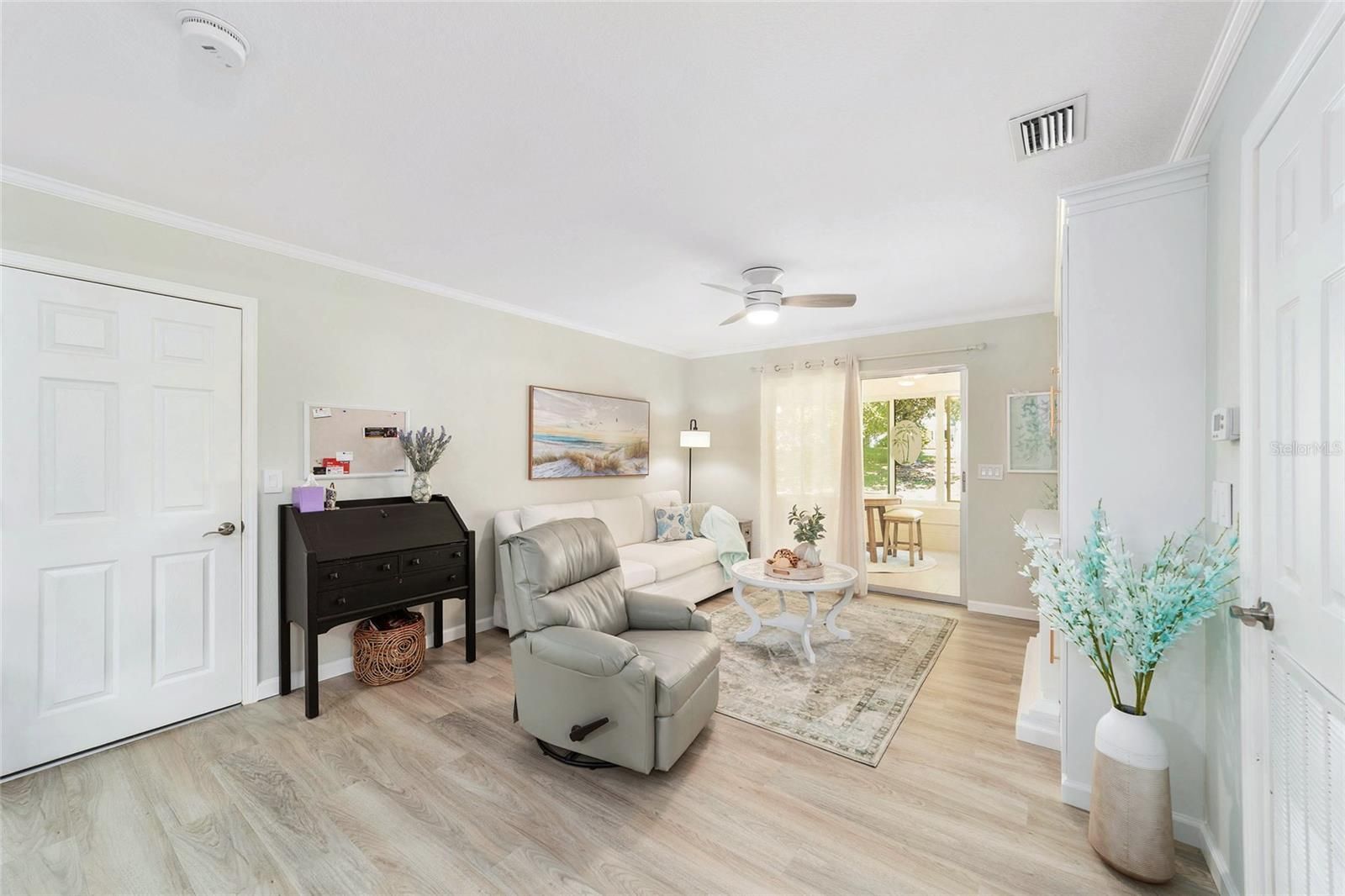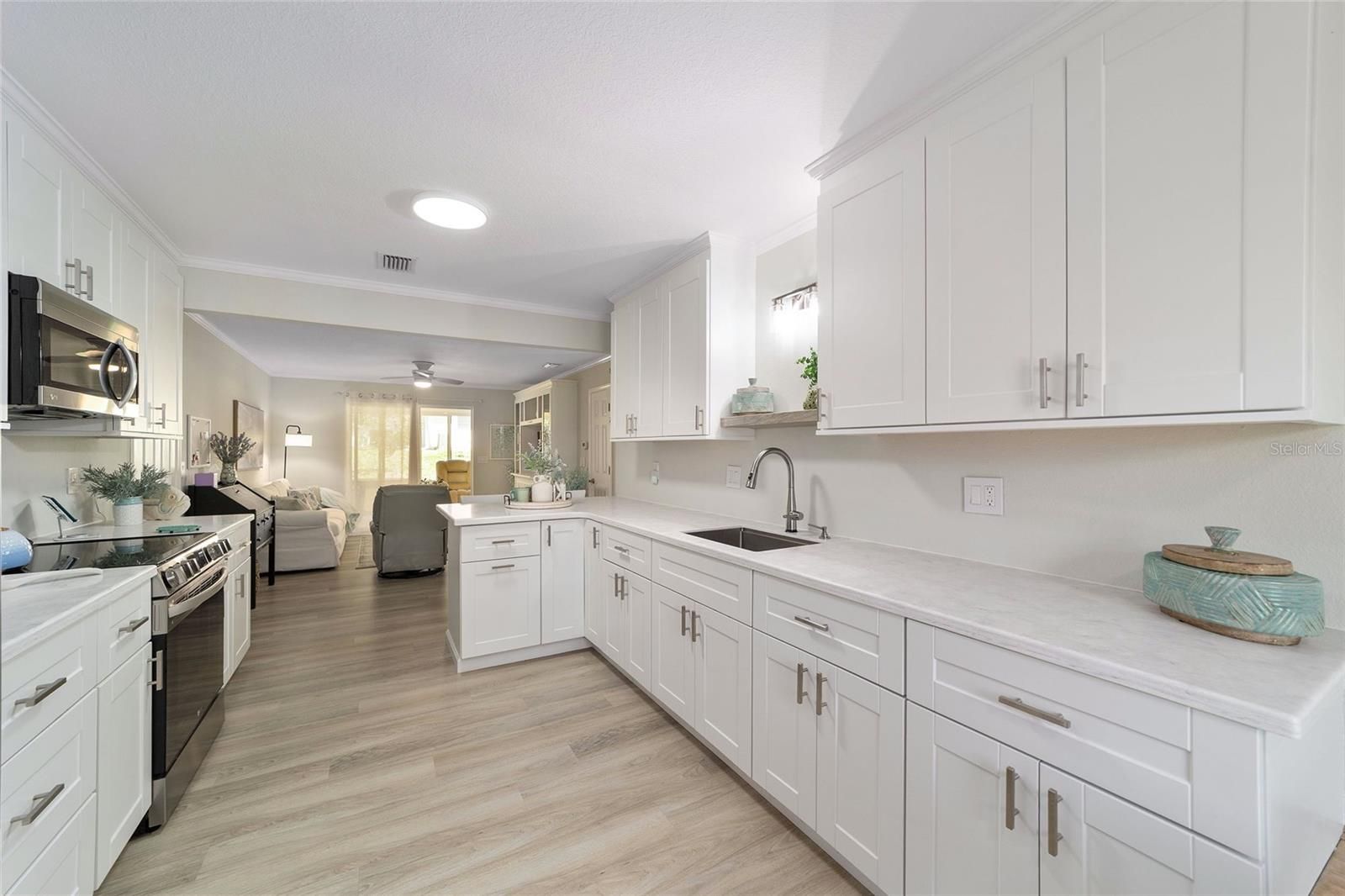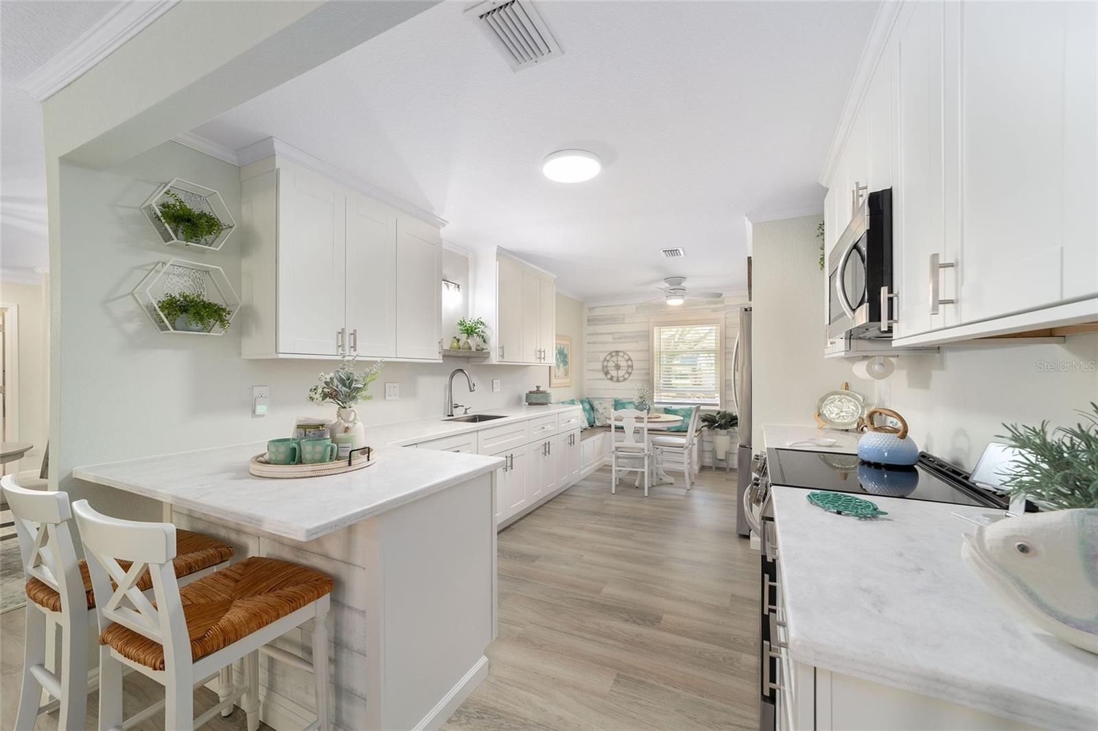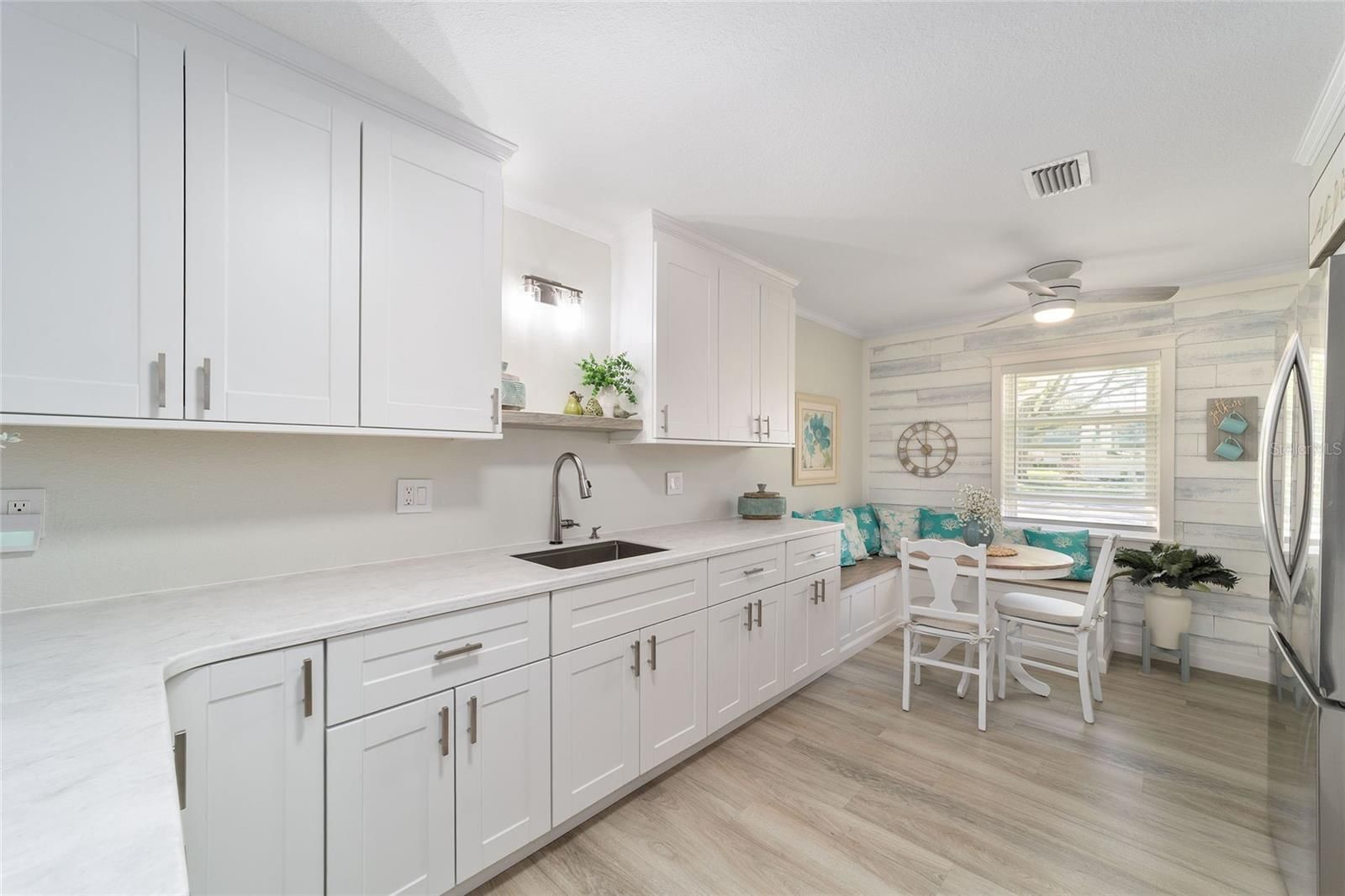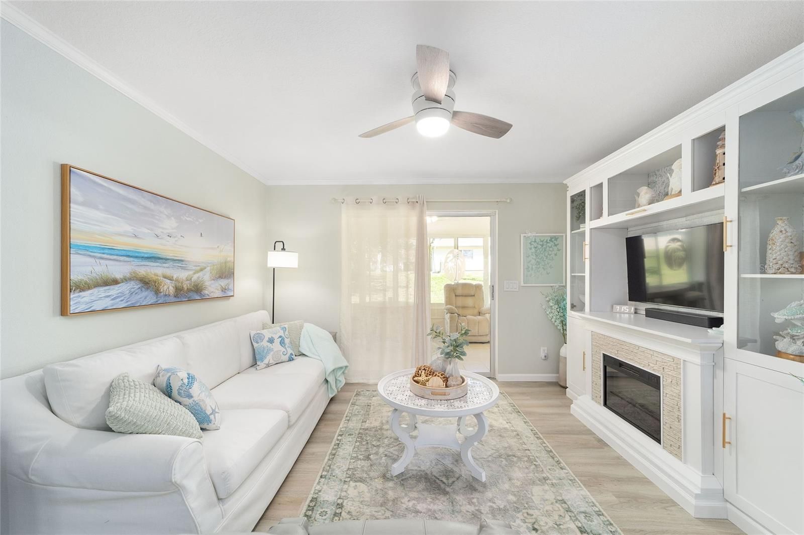 Completely remodeled rare end-unit Birmingham villa in the highly sought-after 55+ community of On Top of the World! This move-in ready 2-bedroom, 2 bath, 1 car garage home offers 1,369 sq ft and has been fully renovated. The interior features luxury vinyl plank flooring, crown molding, updated lighting, ceiling fans, and blinds throughout. Major updates include a recently updated HVAC system (2019) and a new water heater. The kitchen offers white cabinetry with crown molding, LG stainless appliances, pantry, a built-in coffee bar with wood accent wall, and an L-shaped seating area with a built-in bench and storage underneath. The primary suite includes a large walk-in closet with built-ins and an updated ensuite bath with a walk-in shower. Additional highlights include a den with built-ins and electric fireplace, enclosed sunroom with tile flooring and sliding windows, covered patio, gutters, pull-down attic stairs with winch, solar tube in garage, and a separate golf cart garage with a workbench. End villas with this level of renovation don't come around often, grab this one before it's gone and start enjoying the lifestyle you've been waiting for. Call to schedule your private showing today!