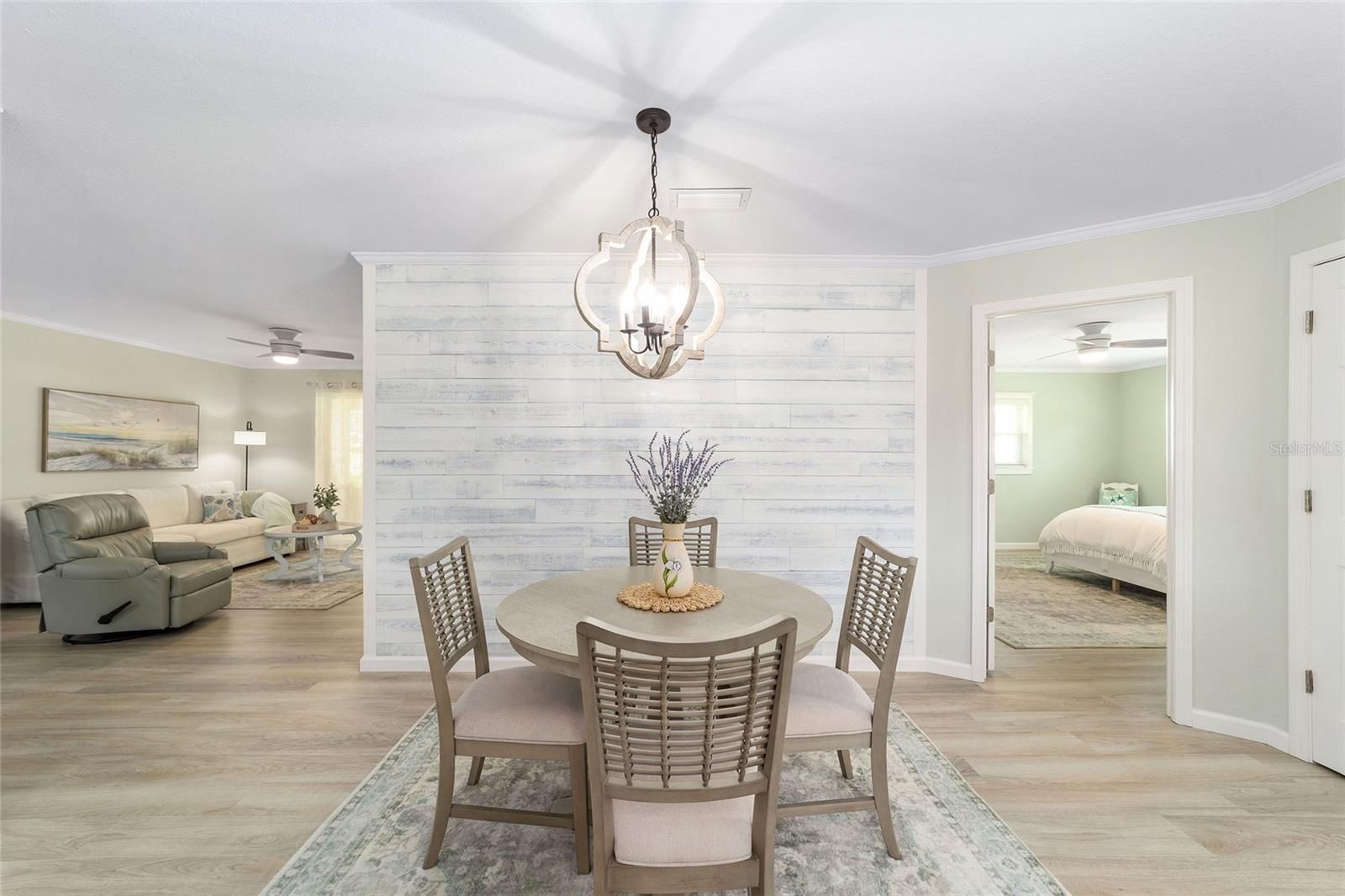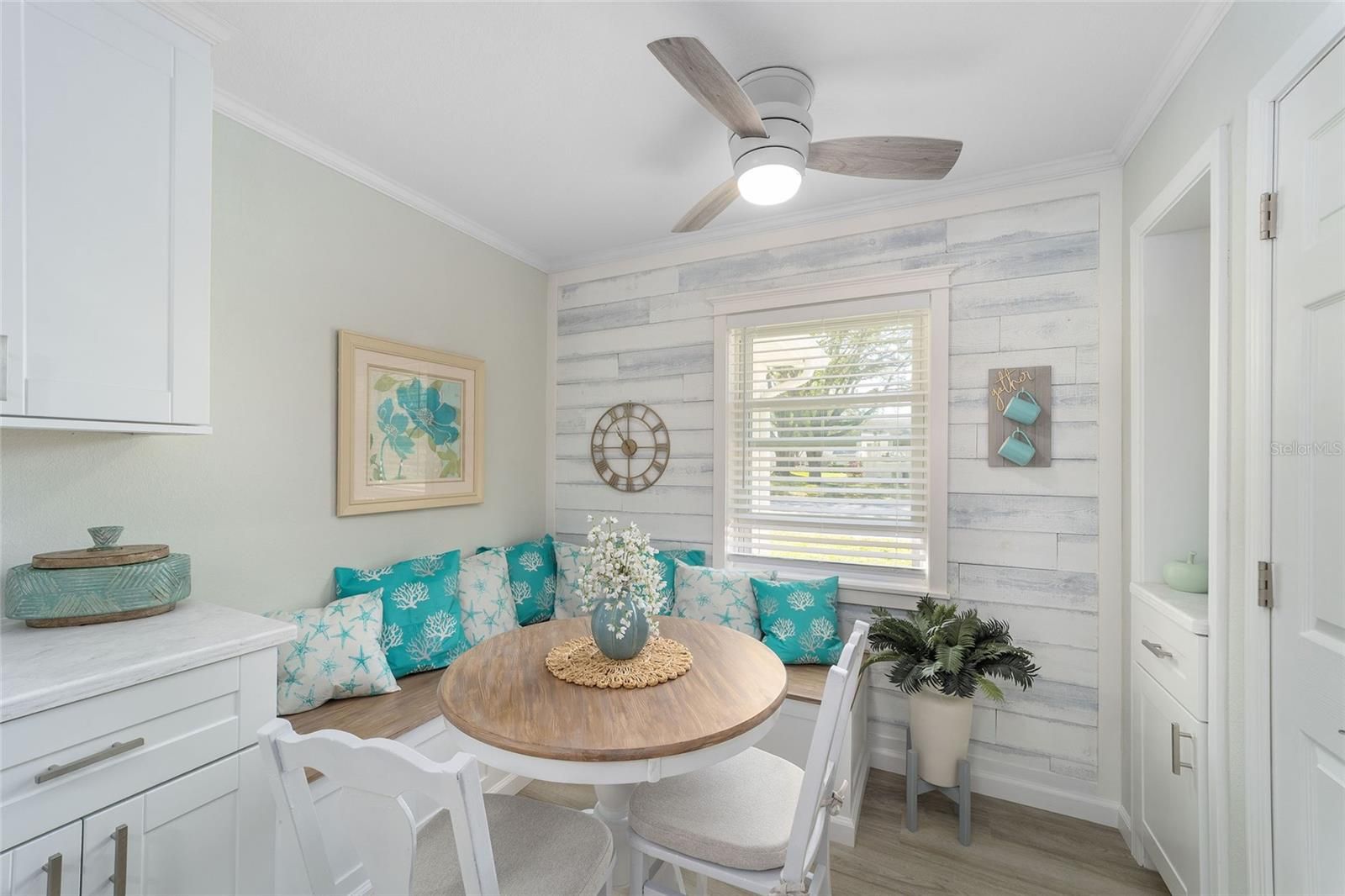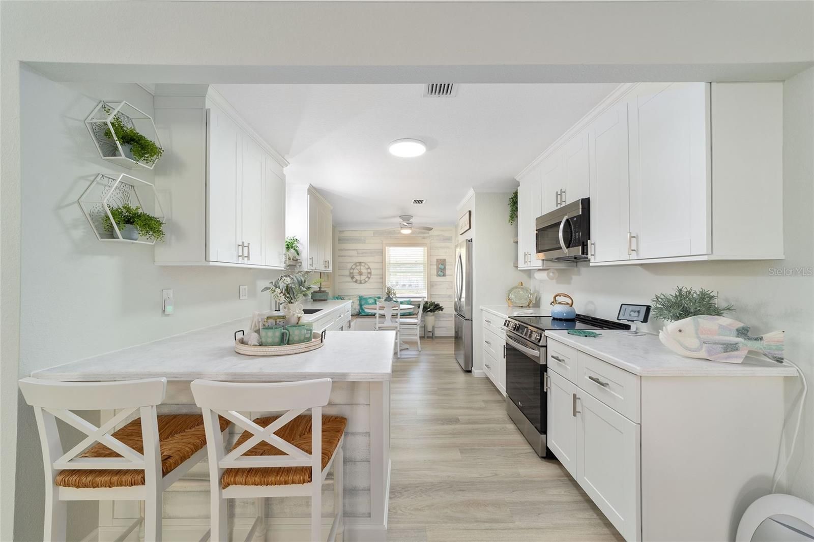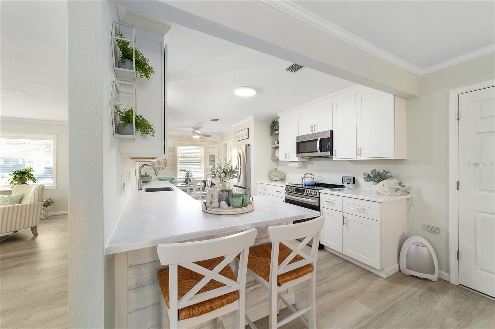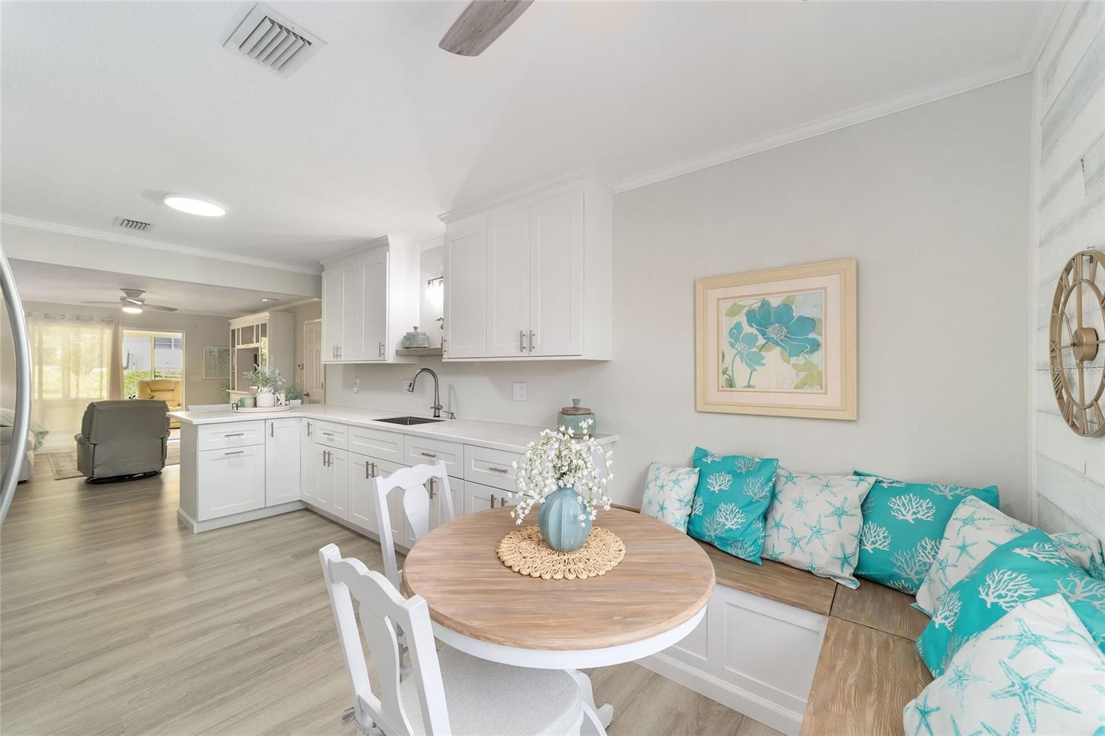 Completely remodeled rare end-unit Birmingham villa in the highly sought-after 55+ community of On Top of the World! This move-in ready 2-bedroom, 2 bath, 1 car garage home offers 1,369 sq ft and has been fully renovated. The interior features luxury vinyl plank flooring, crown molding, updated lighting, ceiling fans, and blinds throughout. Major updates include a recently updated HVAC system (2019) and a new water heater. The kitchen offers white cabinetry with crown molding, LG stainless appliances, pantry, a built-in coffee bar with wood accent wall, and an L-shaped seating area with a built-in bench and storage underneath. The primary suite includes a large walk-in closet with built-ins and an updated ensuite bath with a walk-in shower. Additional highlights include a den with built-ins and electric fireplace, enclosed sunroom with tile flooring and sliding windows, covered patio, gutters, pull-down attic stairs with winch, solar tube in garage, and a separate golf cart garage with a workbench. End villas with this level of renovation don't come around often, grab this one before it's gone and start enjoying the lifestyle you've been waiting for. Call to schedule your private showing today!