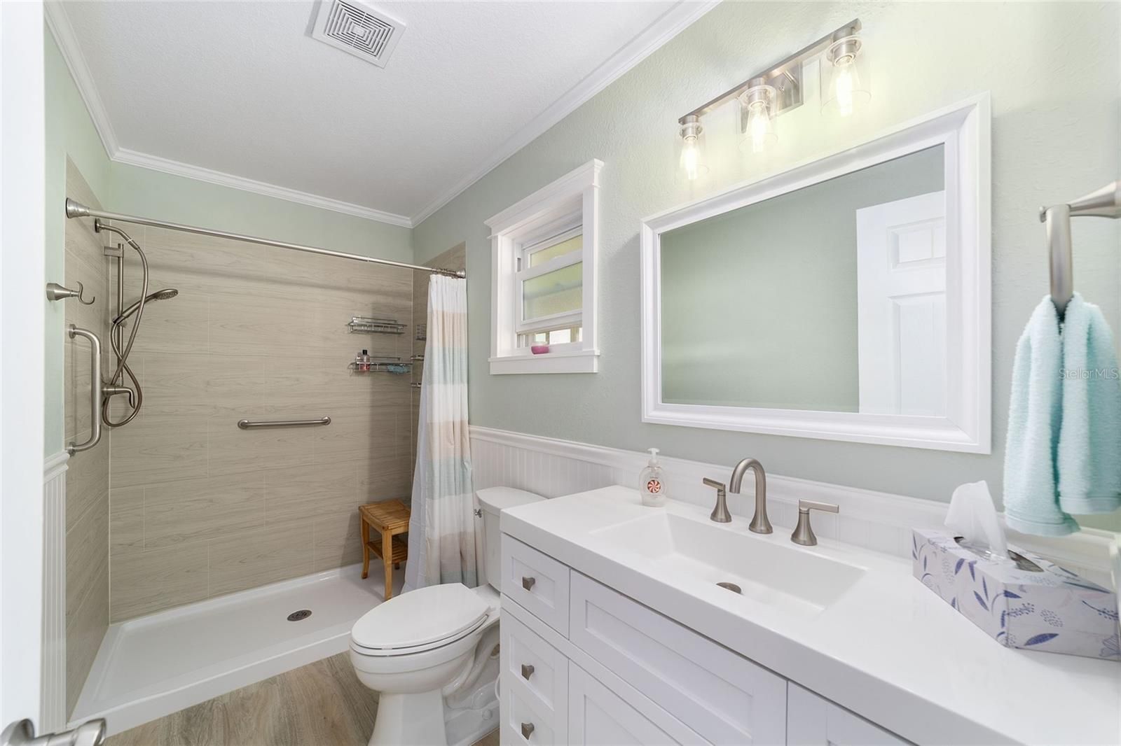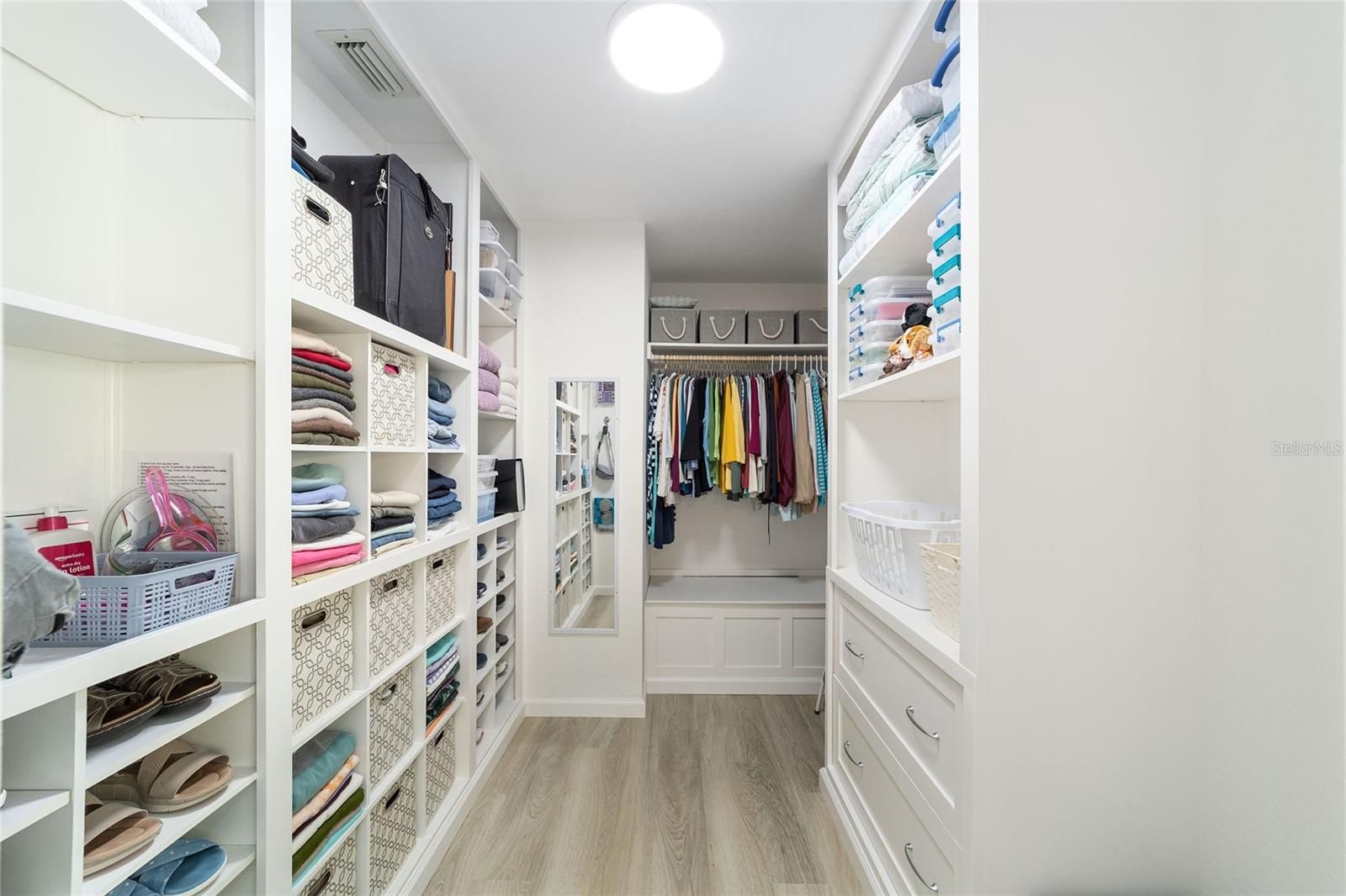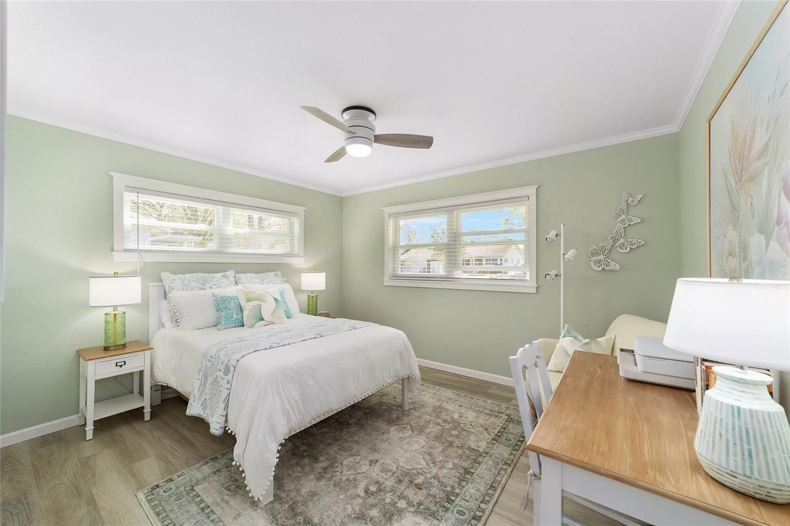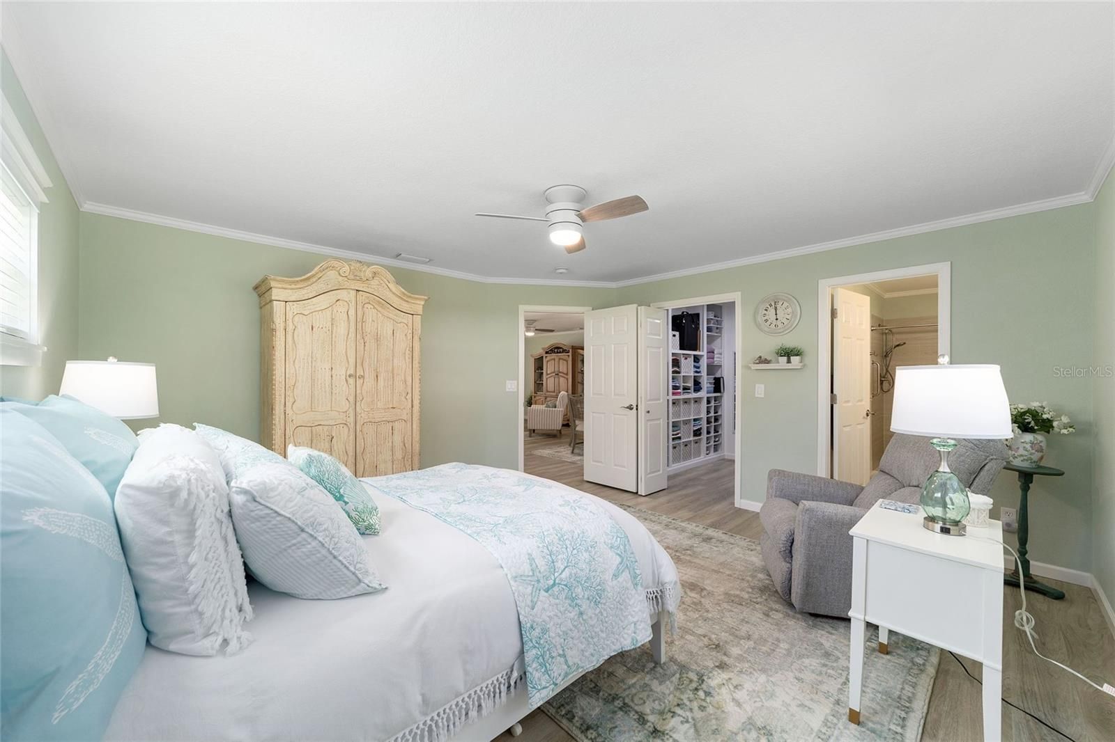 - Built-in Features, Ceiling Fan(s), Crown Molding, Eat-in Kitchen, Main Level Primary, Solid Surface Counters, Thermostat, Walk-In Closet(s), Window Treatments