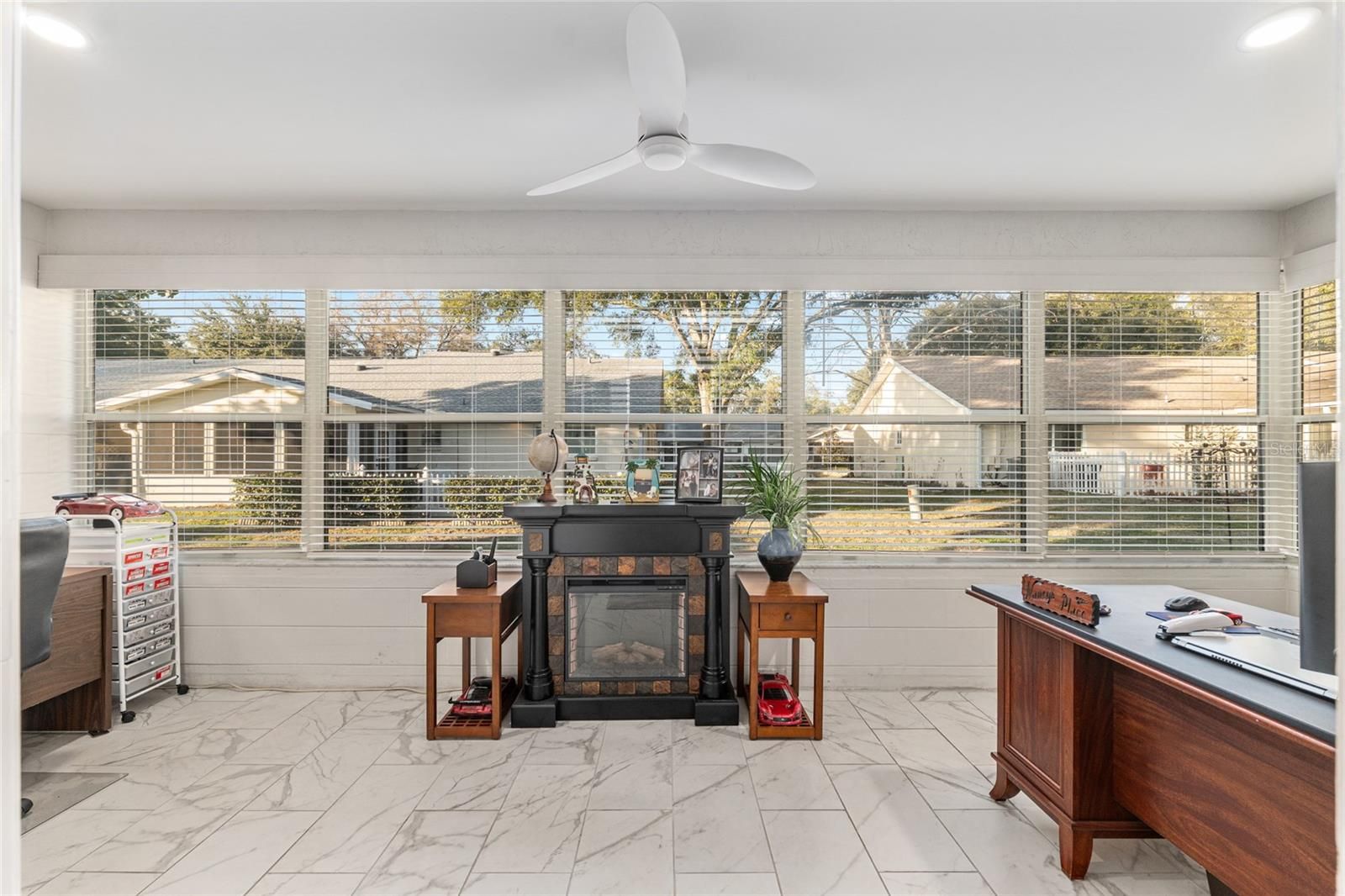 Well-maintained Bostonian model villa located in On Top of the World, a long-standing 55+ community offering resort-style amenities. This inviting home features a functional layout with a blend of recent updates and comfortable living spaces. The large kitchen offers ample cabinet space and a breakfast bar, ideal for everyday living and casual entertaining. The living area showcases new luxury vinyl plank flooring, creating a fresh, low-maintenance feel. Tile flooring in the bathrooms adds durability and easy care, while the bedroom is carpeted, providing a cozy retreat. The lanai is under heat and air with tile flooring, offering flexible year-round living space. Major updates include a roof replaced in 2018 and an AC system updated in 2017, providing added peace of mind. Enjoy the convenience of villa living with exterior maintenance included. On Top of the World offers a gated 55+ community, three golf courses, heated pools, two restaurants, and an active social calendar with live music and concerts at the Cultural Center. Golf-cart access to Publix, medical offices, coffee shops, and nearby shopping, plus close proximity to the World Equestrian Center, adds everyday convenience.