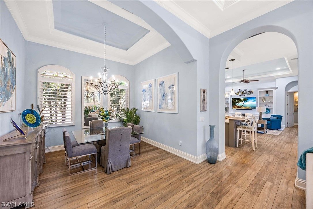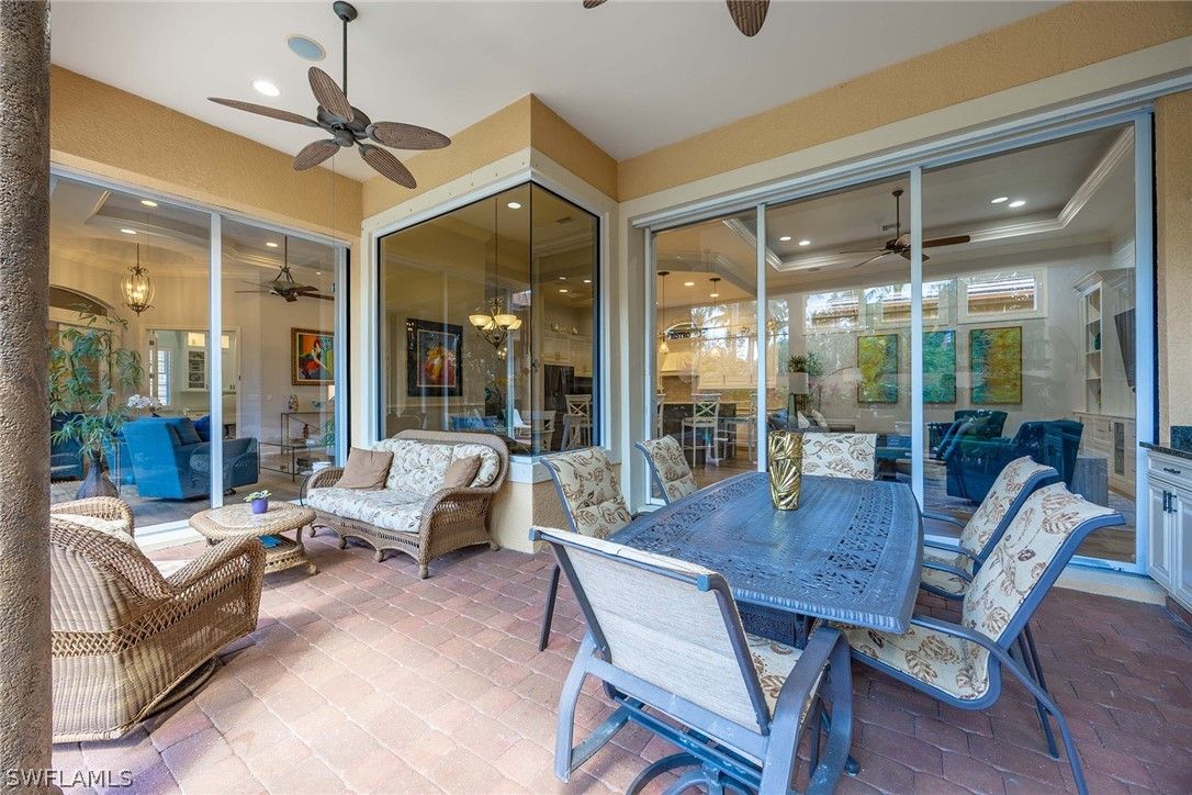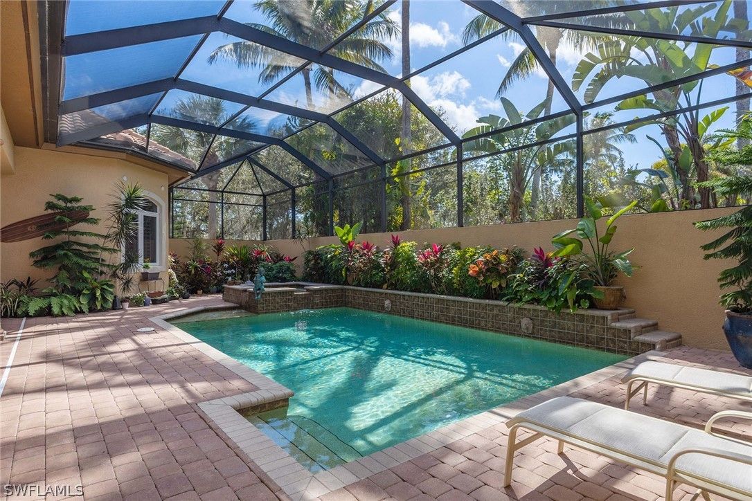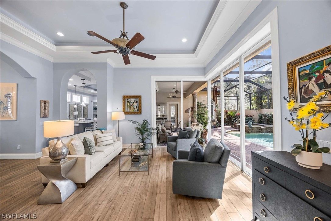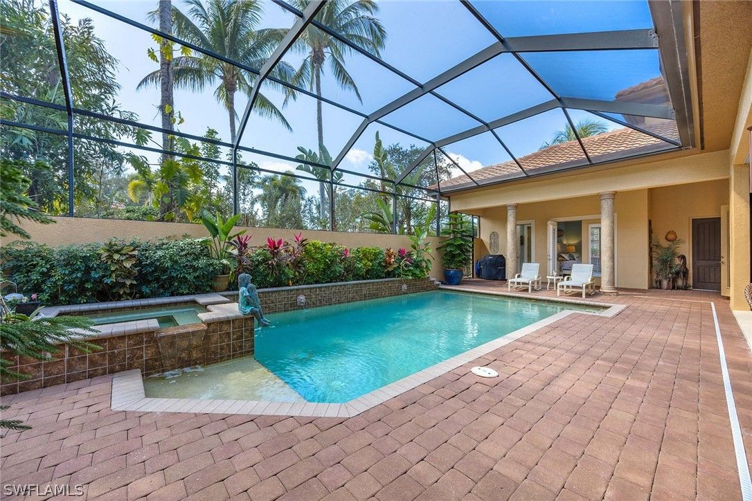 Located within the double-gated Majors enclave of Lely Resort, this meticulously maintained furnished Monterey model courtyard residence offers privacy, thoughtful upgrades and a flexible layout designed for entertaining. Positioned on a lushly landscaped homesite, the courtyard floor plan includes a detached cabana guest suite with a private entrance and kitchenette, providing comfortable accommodations for extended stays or multigenerational living. Interior features include 12-foot ceilings, crown molding, tray ceilings and luxury laminate plank flooring throughout. Custom plantation shutters and updated ceiling fixtures enhance the home’s refined presentation. A dedicated den features a custom-built cabinet system, offering integrated storage and workspace functionality. This versatile room is well-suited as a private home office, library or media room. The renovated kitchen showcases white and gray cabinetry, granite countertops, upgraded stainless steel appliances and a walk-in pantry. Oversized windows and 10-foot sliding glass doors open to an expansive lanai, creating seamless indoor and outdoor living. The outdoor wet bar, saltwater custom heated pool and spa support year-round entertaining. Additional improvements include a roof installed in 2018, new heating, ventilation and air conditioning systems, a new water heater, a three-car garage and a whole-home solar system which keeps electric costs minimal. Residents of The Majors enjoy immediate membership to The Players Club and Spa at Lely Resort, offering resort-style amenities, fitness facilities, dining options, tennis, pickle-ball and lagoon-style pools. The community is also home to three championship 18-hole golf courses.