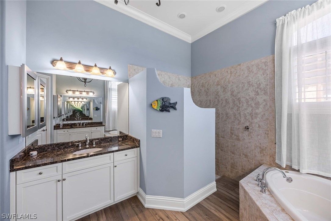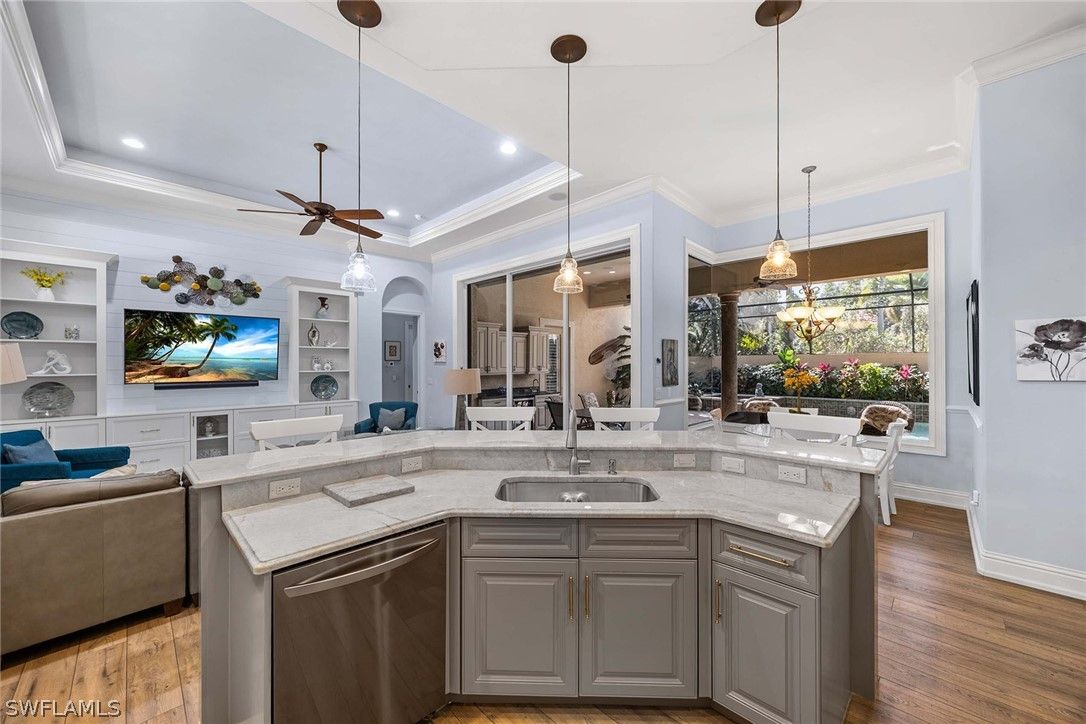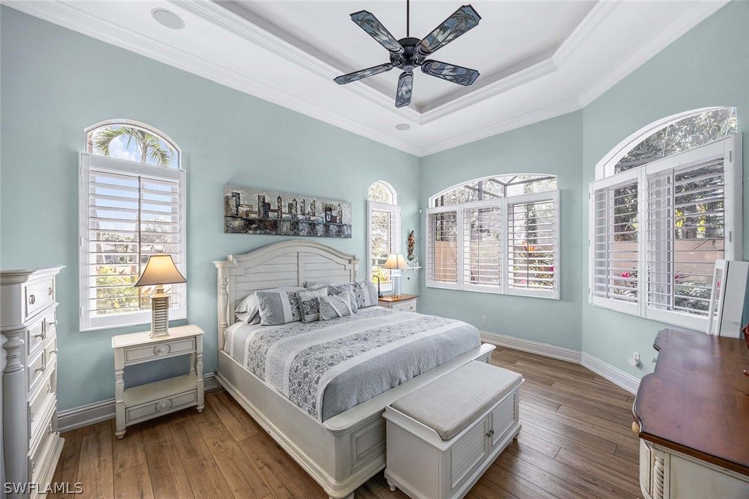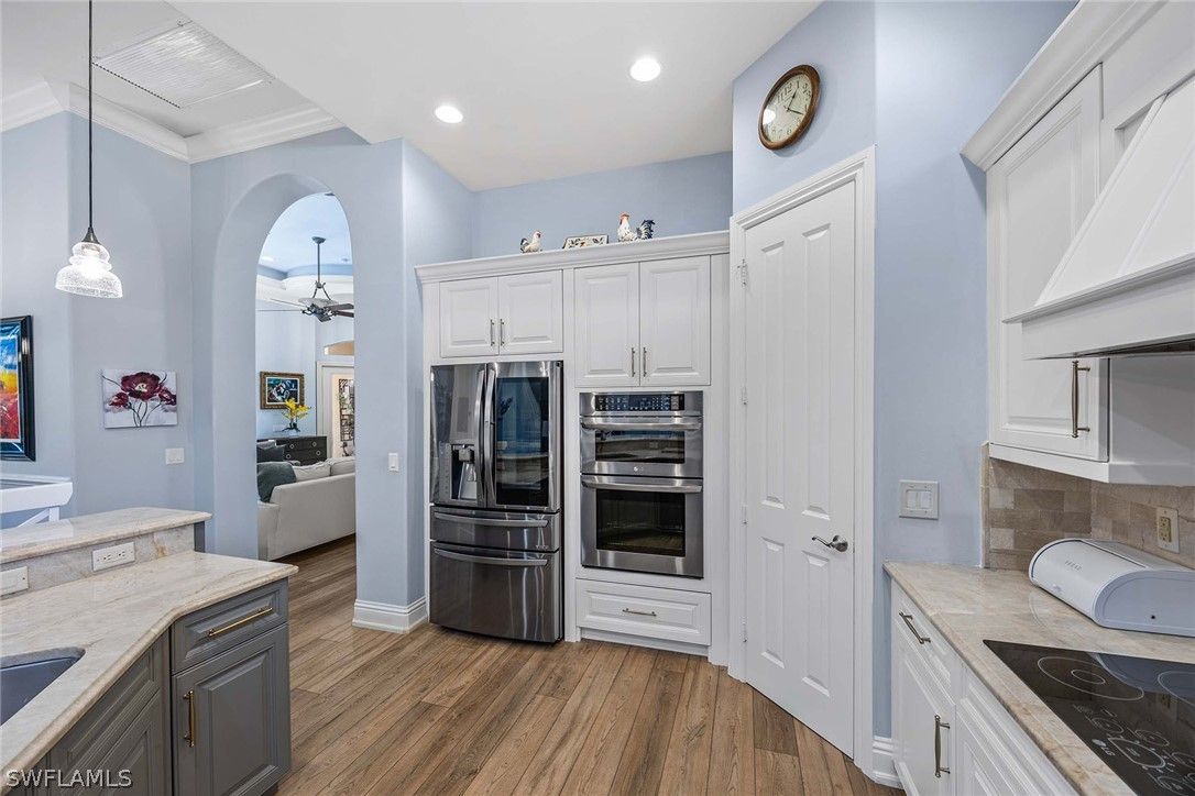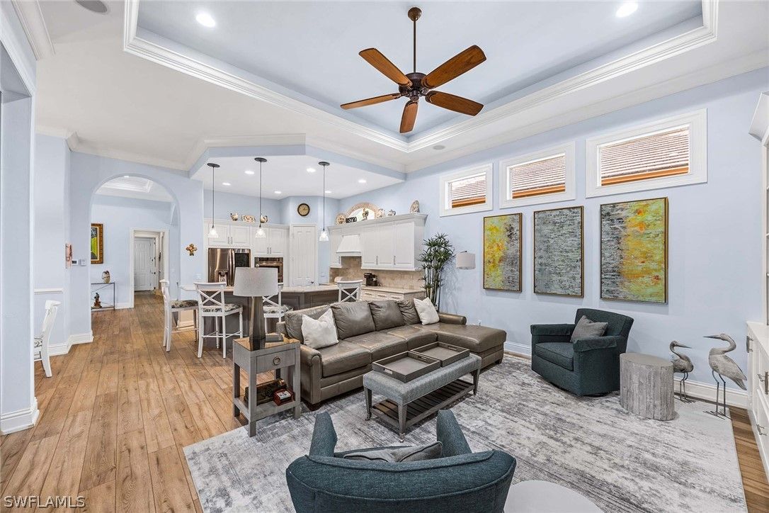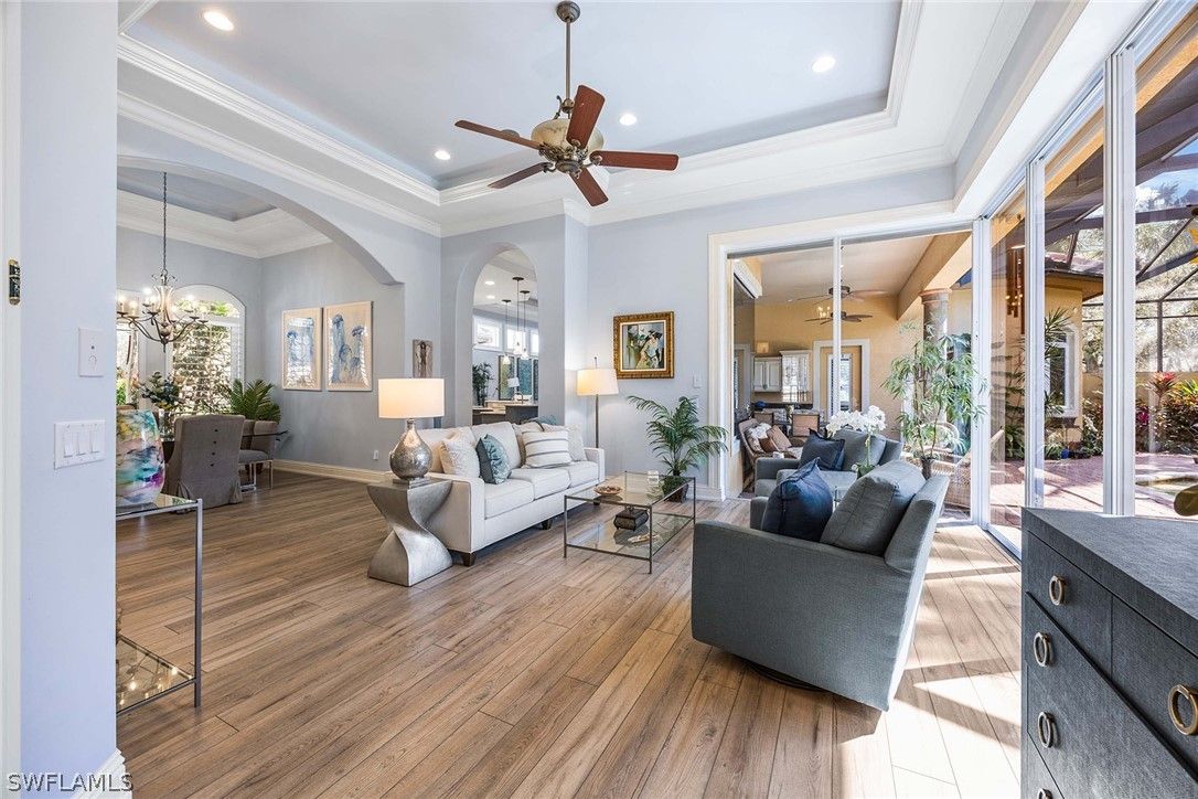 Located within the double-gated Majors enclave of Lely Resort, this meticulously maintained furnished Monterey model courtyard residence offers privacy, thoughtful upgrades and a flexible layout designed for entertaining. Positioned on a lushly landscaped homesite, the courtyard floor plan includes a detached cabana guest suite with a private entrance and kitchenette, providing comfortable accommodations for extended stays or multigenerational living. Interior features include 12-foot ceilings, crown molding, tray ceilings and luxury laminate plank flooring throughout. Custom plantation shutters and updated ceiling fixtures enhance the home’s refined presentation. A dedicated den features a custom-built cabinet system, offering integrated storage and workspace functionality. This versatile room is well-suited as a private home office, library or media room. The renovated kitchen showcases white and gray cabinetry, granite countertops, upgraded stainless steel appliances and a walk-in pantry. Oversized windows and 10-foot sliding glass doors open to an expansive lanai, creating seamless indoor and outdoor living. The outdoor wet bar, saltwater custom heated pool and spa support year-round entertaining. Additional improvements include a roof installed in 2018, new heating, ventilation and air conditioning systems, a new water heater, a three-car garage and a whole-home solar system which keeps electric costs minimal. Residents of The Majors enjoy immediate membership to The Players Club and Spa at Lely Resort, offering resort-style amenities, fitness facilities, dining options, tennis, pickle-ball and lagoon-style pools. The community is also home to three championship 18-hole golf courses.