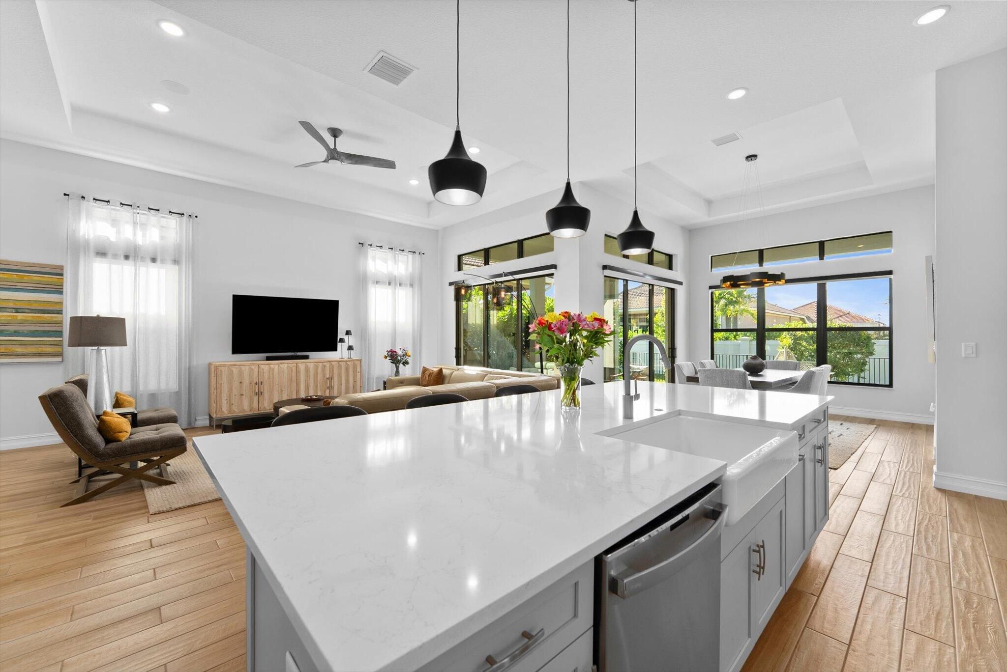 Explore this thoughtfully designed home in like-new condition. Featuring a 2023 Cerelia model with stylish upgrades, it is located in a vibrant 55+ community. Highlights include soaring 13' tray ceilings, porcelain tile flooring throughout, motorized shades, and an open-concept layout filled with natural light from abundant windows and sliders. The chef's kitchen offers upgraded appliances, ample cabinetry, quartz countertops, an oversized island, and a vented hood. Step out to the lanai with a gas bib ready for your grill, overlooking a fenced yard ideal for pets or visiting grandkids. The spacious garage accommodates two cars plus a golf cart. Enjoy resort-style living with a luxurious clubhouse, fitness center, cafe, tennis and pickleball courts, two pools, game rooms and more, all within a guard gated community.