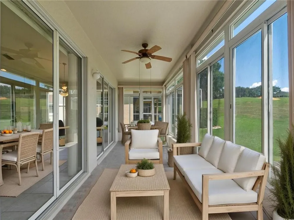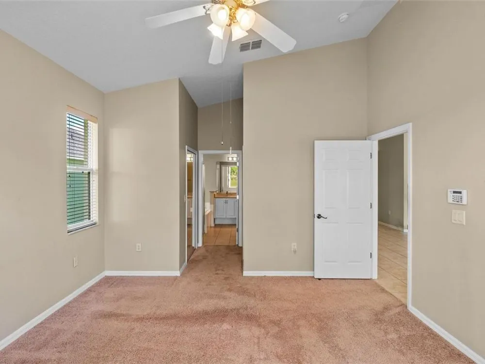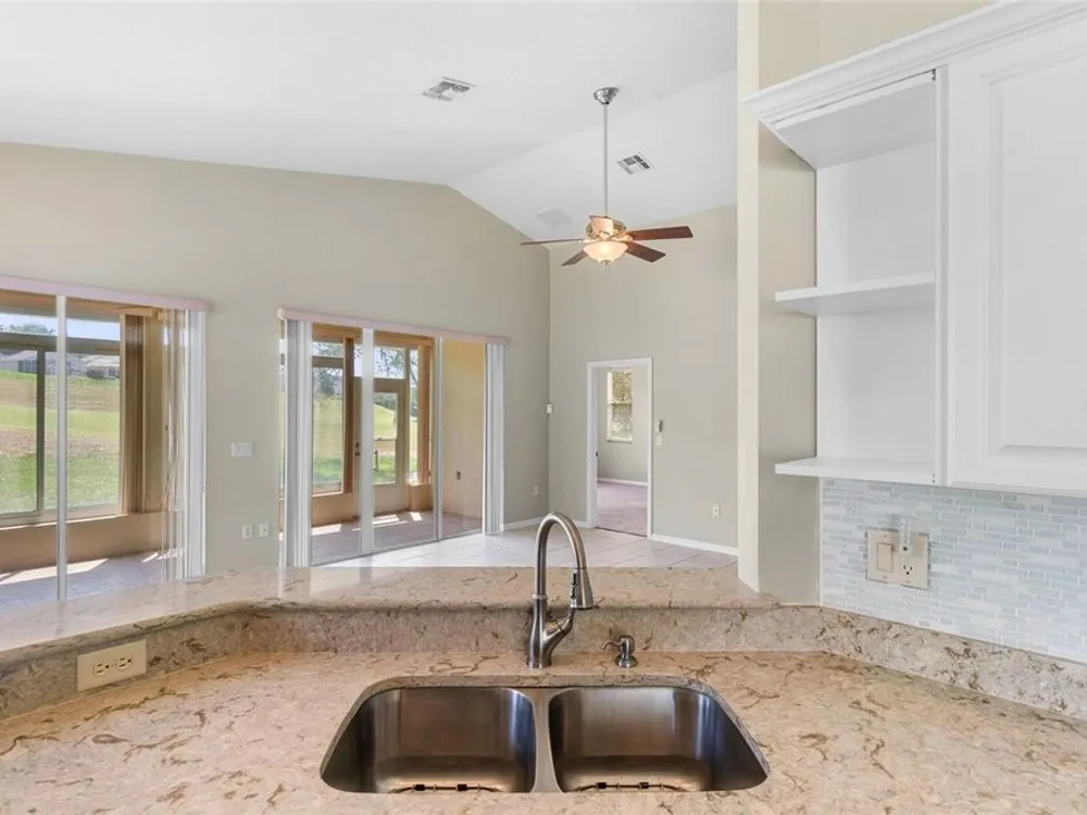 - Ceiling Fan(s), High Ceilings, Kitchen/Family Room Combo, Open Floorplan, Solid-Wood Cabinets, Split Bedrooms, Stone Counters, Thermostat, Walk-In Closet(s), Window Treatments