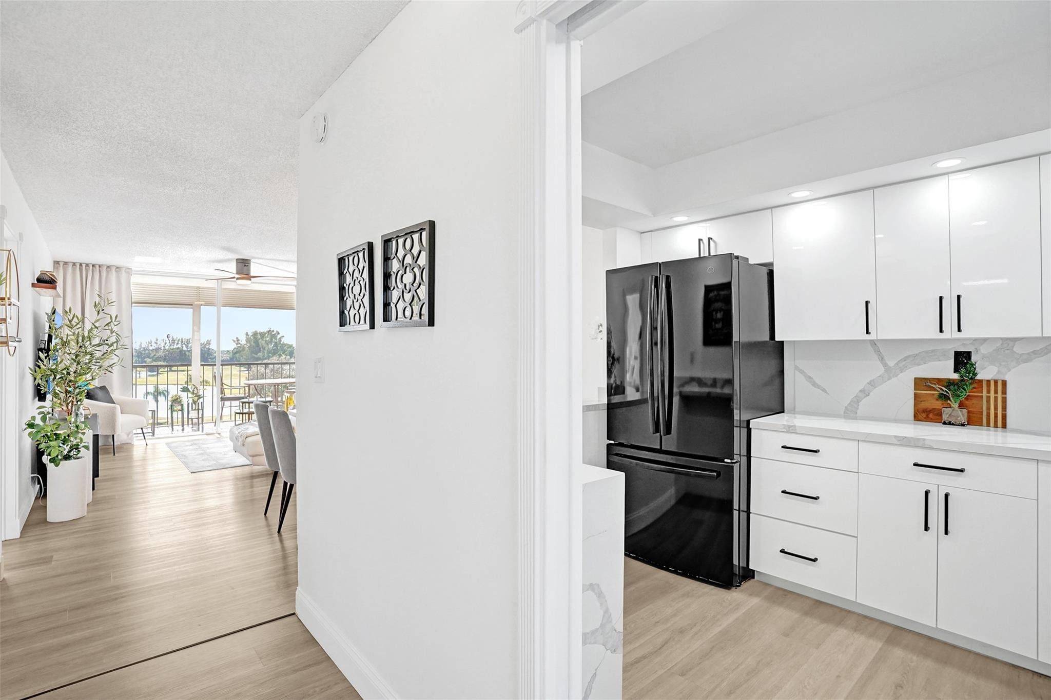 Stunningly remodeled 1 bed, 1.5 bath Penthouse condo in 55+ Hollybrook Golf & Tennis. Gourmet remodeled kitchen with new countertops, cabinetry, and top-of-the-line appliances, and water filtration system under sink and refridgerator. Updated bathroom, newer wood and ceramic floors throughout, and refreshed lighting. Impact glass in the bedroom for glare reduction and energy efficiency. Enjoy sweeping views of the pool, lake, golf course, and tennis courts. Plus, free community golf adds to the lifestyle. A bright, contemporary retreat in a premier 55+ community—schedule your tour today, and make this home your very own!