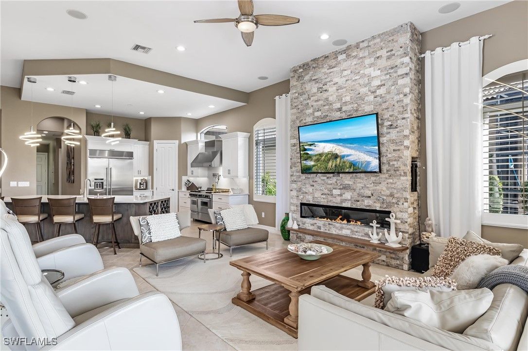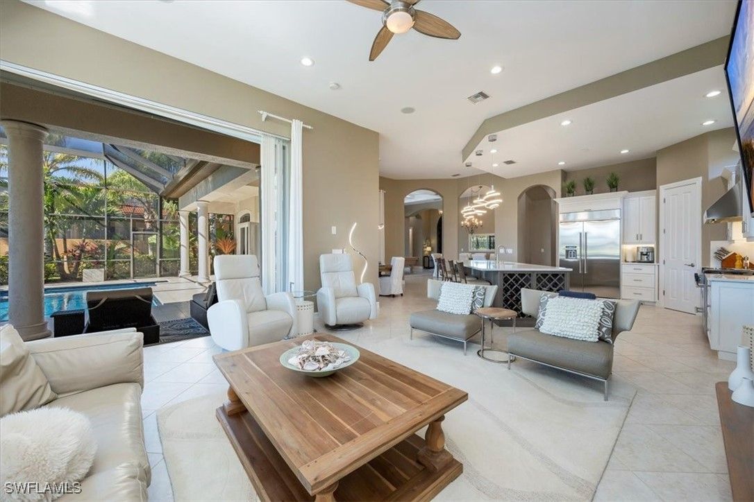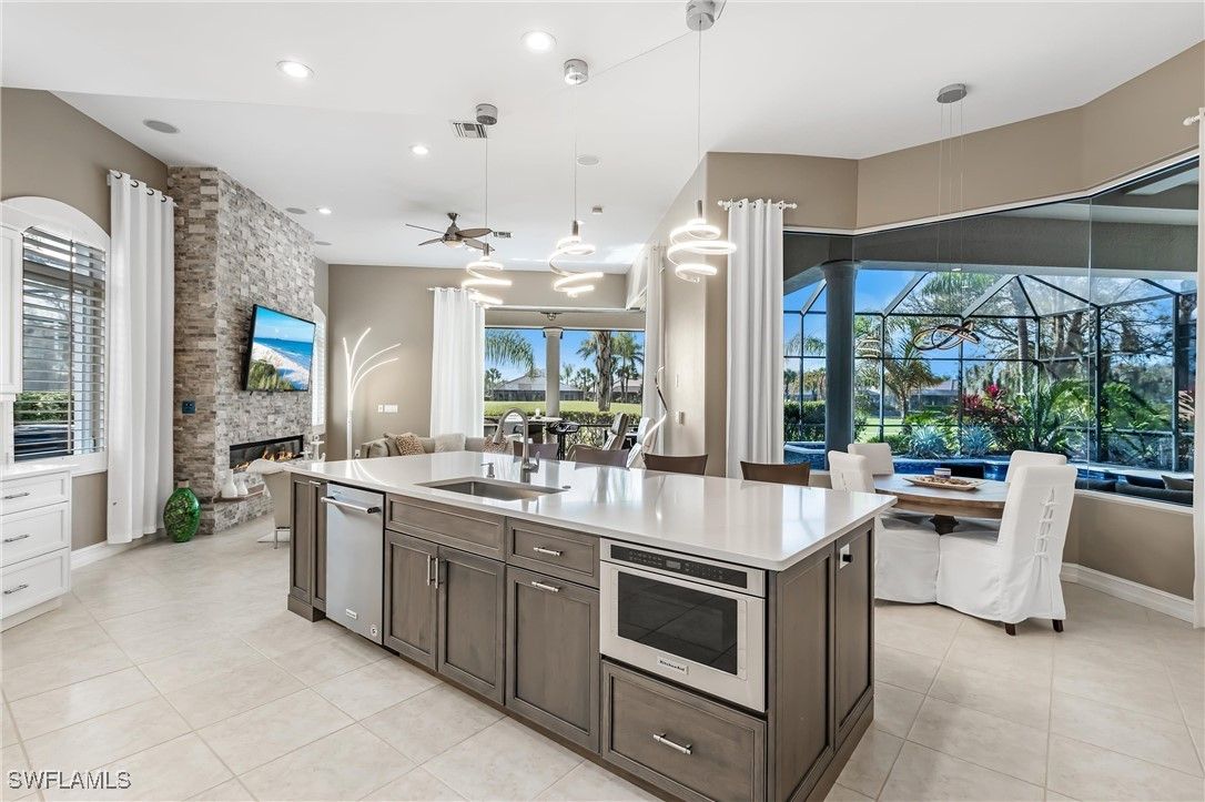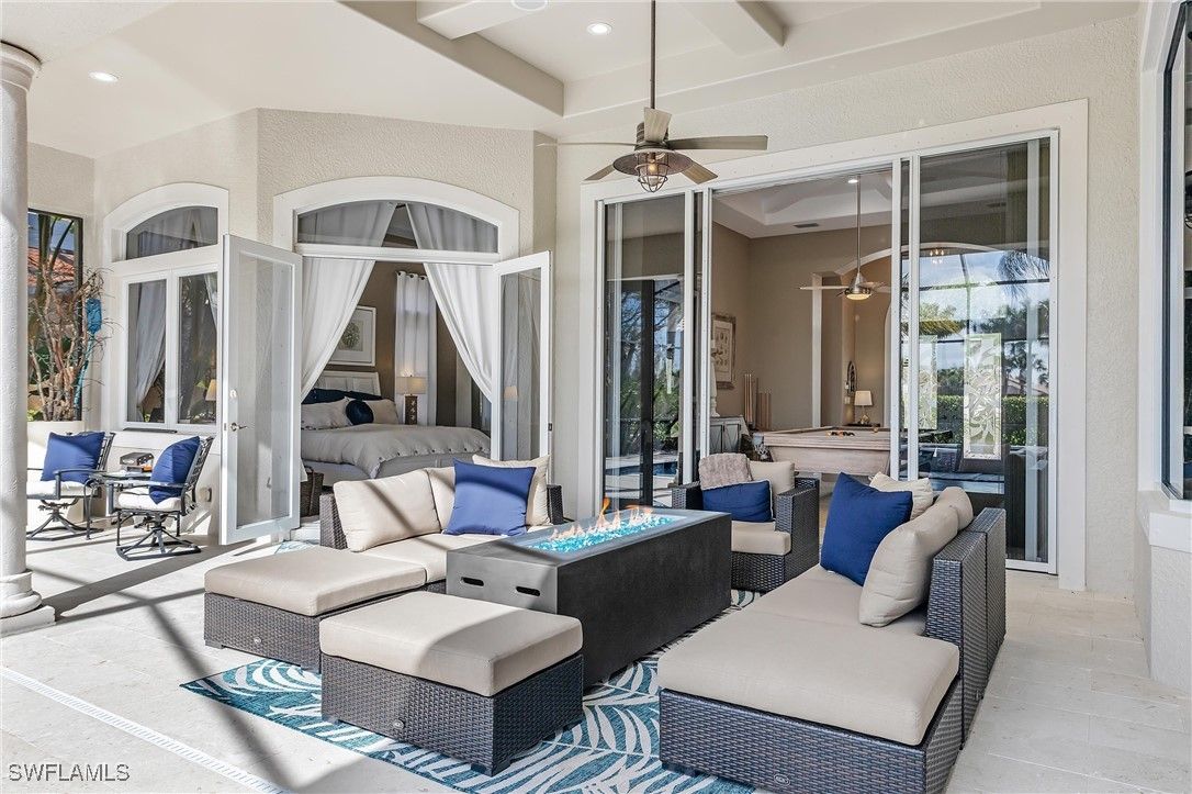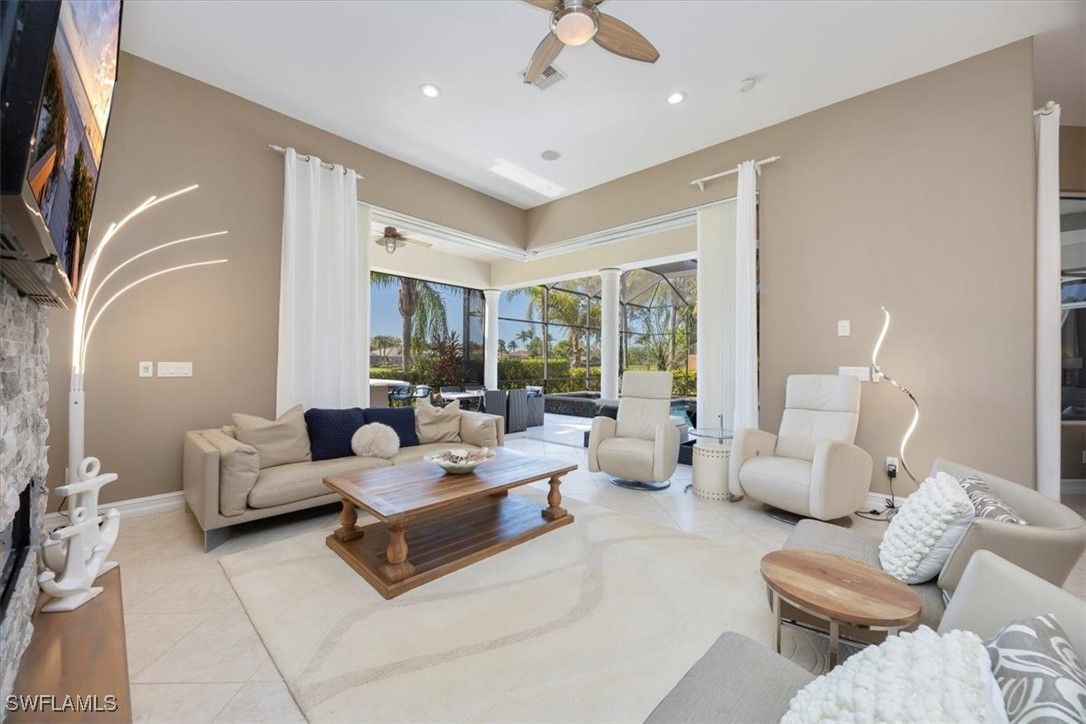 Experience unparalleled elegance and modern luxury in this meticulously updated residence, located within the prestigious double-gated enclave of The Majors at Lely Resort. Offering breathtaking south-facing golf course and lake views, this furnished 3-bedroom plus den, 2.5-bath home seamlessly blends sophistication, comfort, and resort-style living. The gourmet kitchen, fully renovated in 2022, is a chef’s dream, featuring gas cooking, custom cabinetry, Quartz countertops, and premium appliances. A spacious breakfast bar provides additional seating, while the sunlit breakfast nook is the perfect place to enjoy morning coffee with serene views. The family room is a true showstopper, highlighted by a striking stone accent wall with a built-in gas fireplace, creating a warm yet refined ambiance. The expansive primary suite serves as a private retreat, with French doors leading to the lanai. The elegant primary bath offers a spa-like experience, featuring a walk-in shower, separate soaking tub, and dual vanities for ultimate relaxation. Designed for seamless indoor-outdoor living with zero corner sliding doors, the resort-style lanai and pool area underwent a complete transformation in 2022. Take a refreshing swim or unwind in the heated saltwater pool and spa. On cooler evenings, relax by the firepit while the ambient pool lighting enhances the tranquil atmosphere. The expansive screened lanai offers multiple lounging and dining areas overlooking the picturesque golf course. An outdoor kitchen, fully equipped with a built-in gas grill, beverage refrigerator, and granite countertops, makes entertaining effortless. The spacious 3-car garage includes an air-conditioned storage space (2022), providing optimal convenience for preserving vehicles, golf clubs, and household items. Thoughtfully maintained, this home offers numerous recent upgrades, including a new front door (2024), new washer and dryer (2024), new A/C (2025), water heater (2020), and a newer roof (2021), ensuring peace of mind for years to come. Enjoy immediate membership to the exclusive Players Club & Spa, featuring resort-style pools, fine dining, a state-of-the-art fitness center, tennis, pickleball, and a luxurious spa. Golf enthusiasts will appreciate access to three championship golf courses, making this the ultimate Naples lifestyle retreat. This extraordinary home presents a rare opportunity to experience the finest in luxury living at Lely Resort. No waitlist Golf Membership!