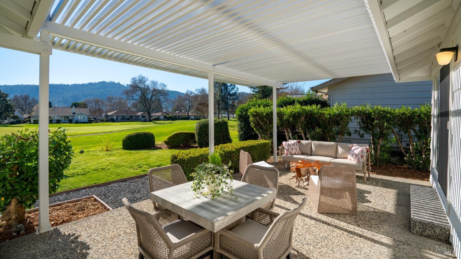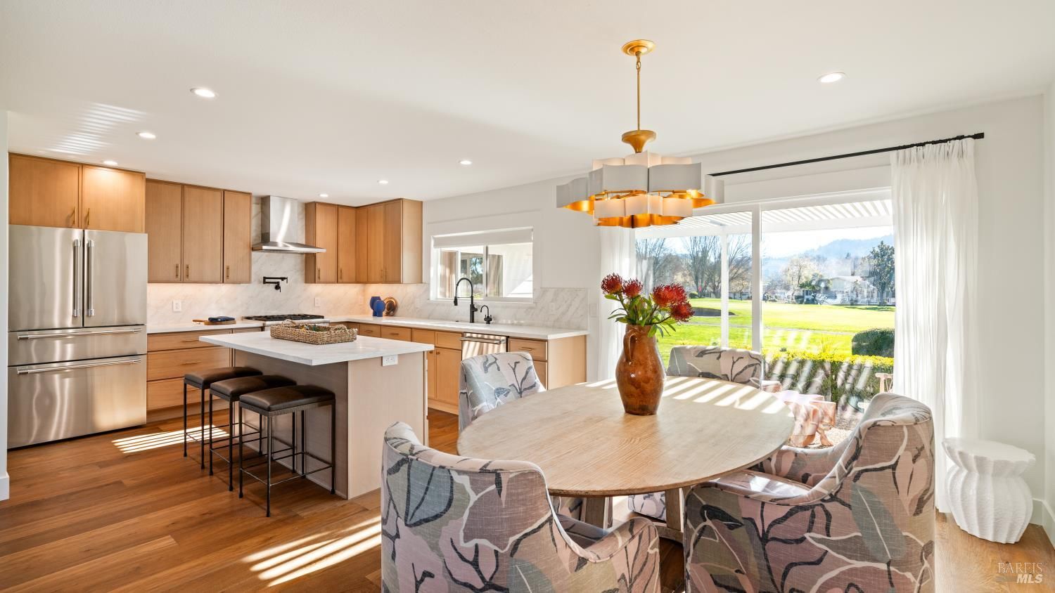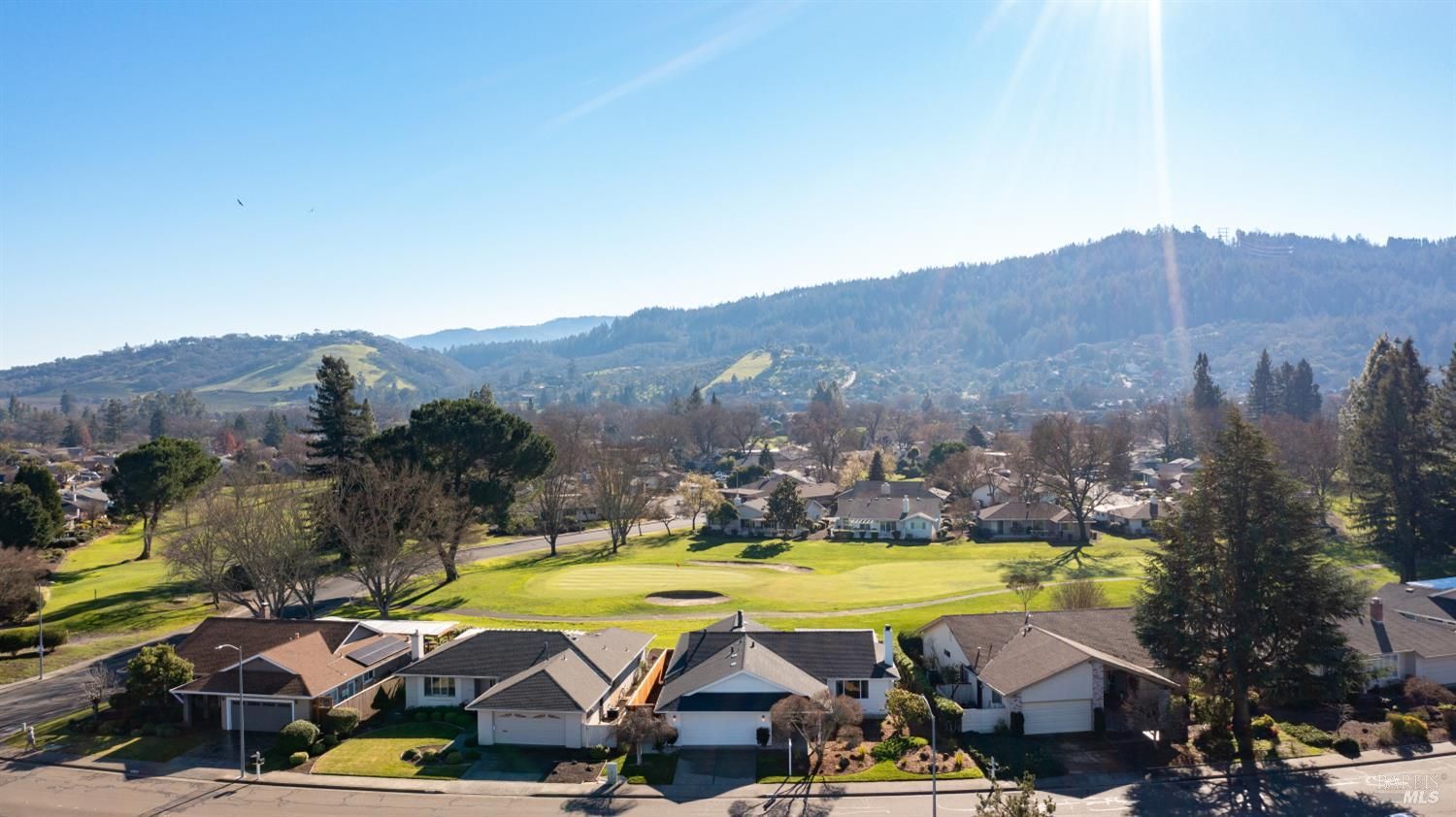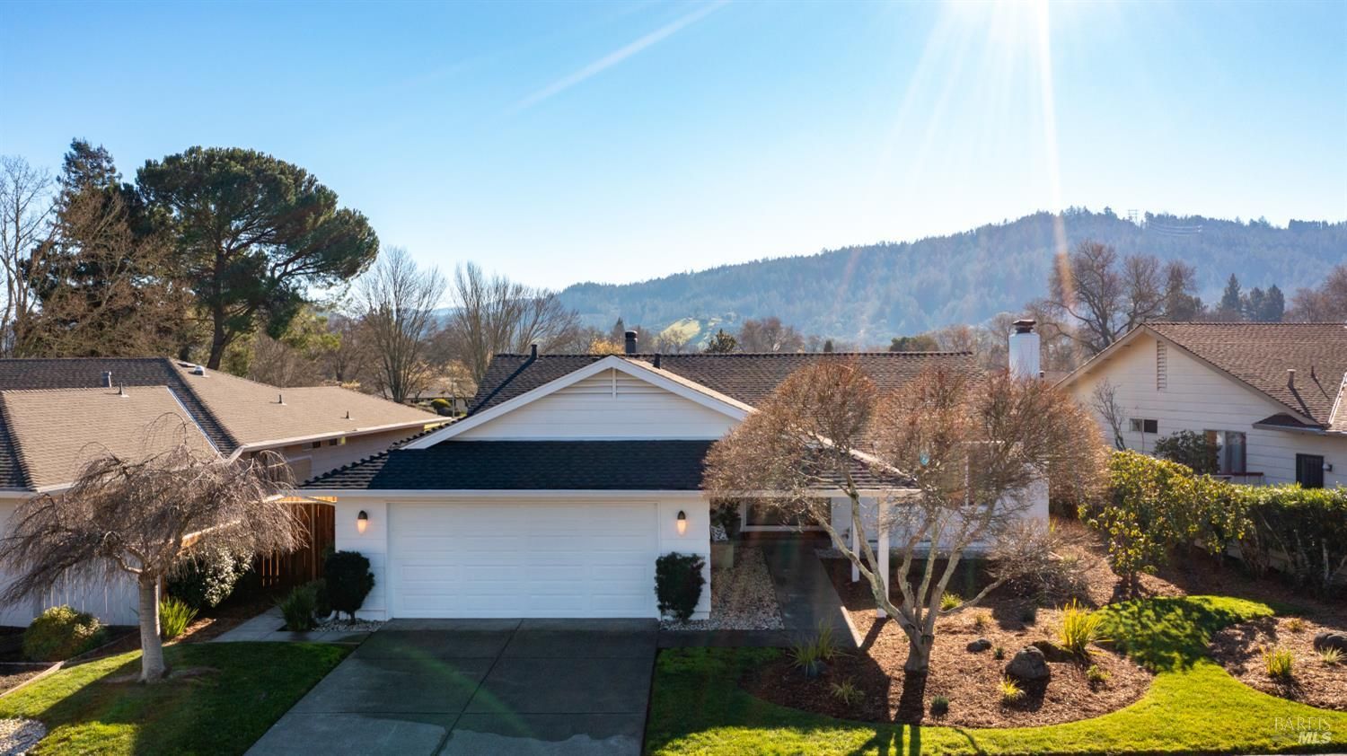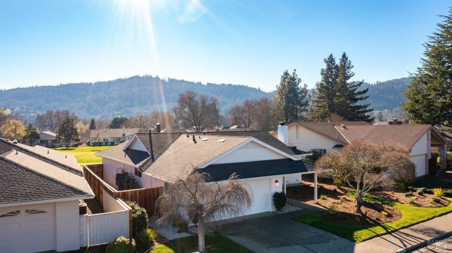 An exceptional opportunity to own a superbly renovated Oakmont home! This stunning 3-bedroom, 2-bathroom residence spans 1,860 square feet and offers breathtaking mountain views from its location on the golf course. Completely reimagined, it features custom wood kitchen cabinetry, top-of-the-line Thermador appliances, a convenient pot filler, elegant quartz countertops, a spacious island with a built-in drawer microwave, and a stylish bar area. The home boasts hardwood floors, new doors, windows, and window coverings, a new roof, upgraded air conditioning and heating systems, an epoxy-coated garage floor, and modern designer and recessed LED lighting throughout. The open-concept kitchen flows seamlessly into the dining and living areas, highlighted by a beautiful fireplace. The third bedroom is beautifully styled as a home office, also with a fireplace and a sliding door to the back patio. The meticulously maintained property includes a charming covered backyard patio perfect for sunset views and wildlife watching, along with a freshly landscaped yard with updated irrigation. Don't miss out on this extraordinary gem! Oakmont is a vibrant 55+ active adult community offering swimming, hiking, tennis, pickleball, golf, and more, nestled in the heart of Sonoma County's renowned Wine Country.