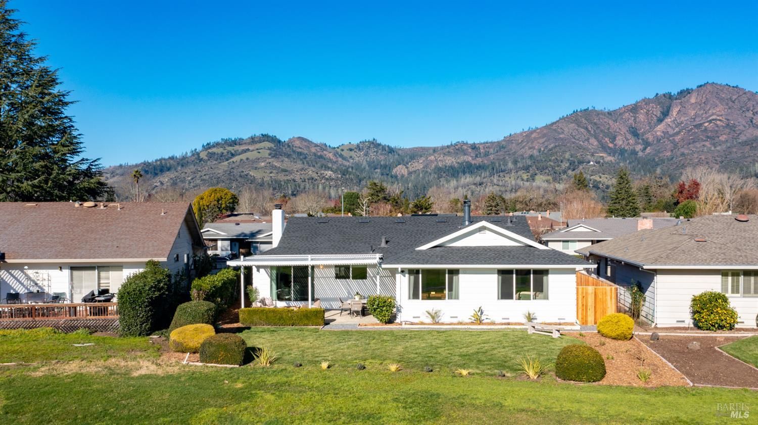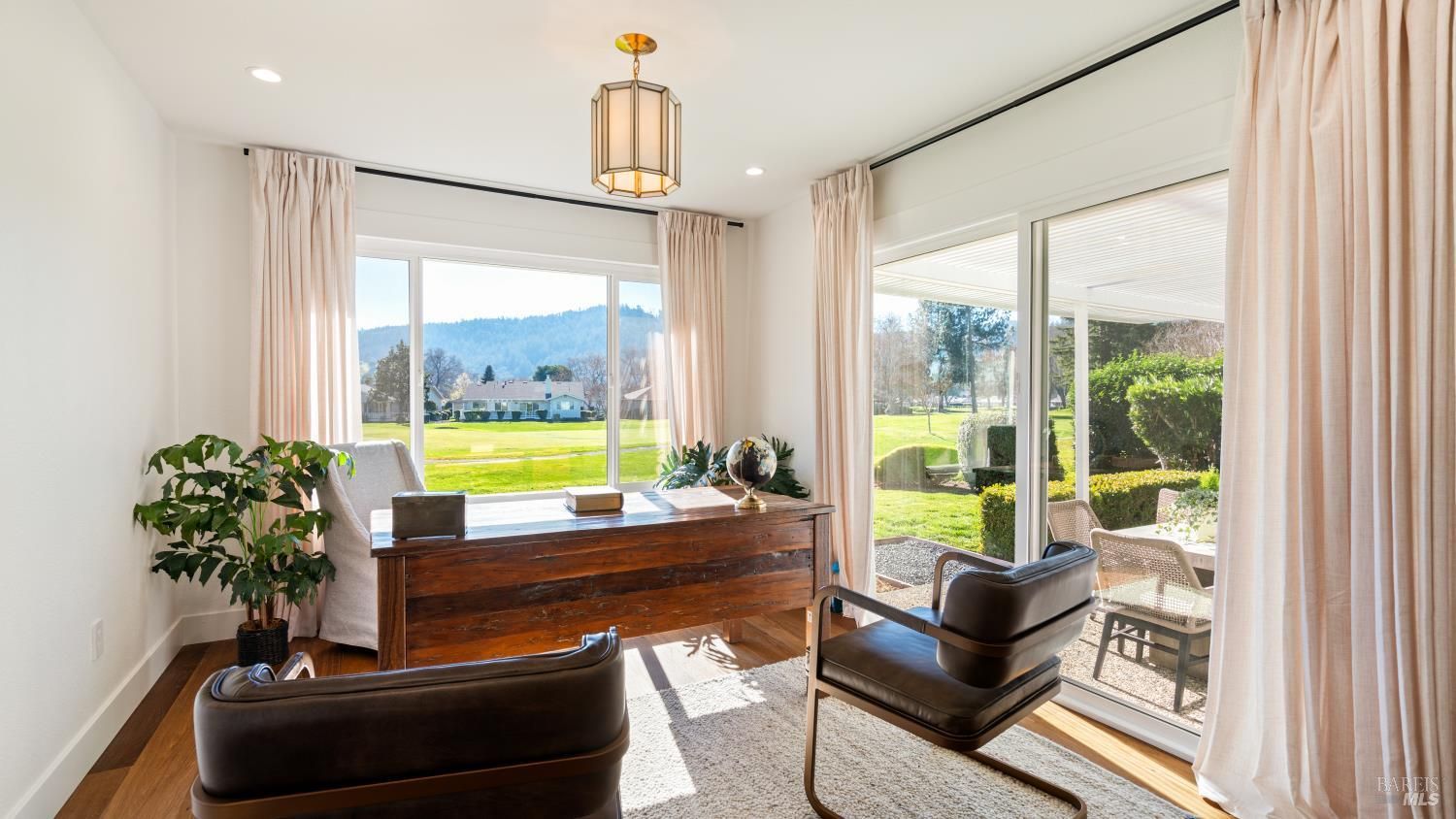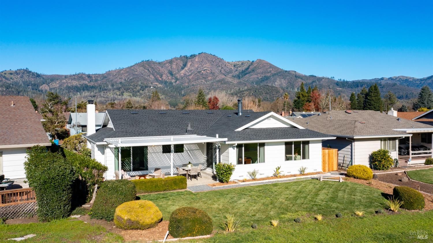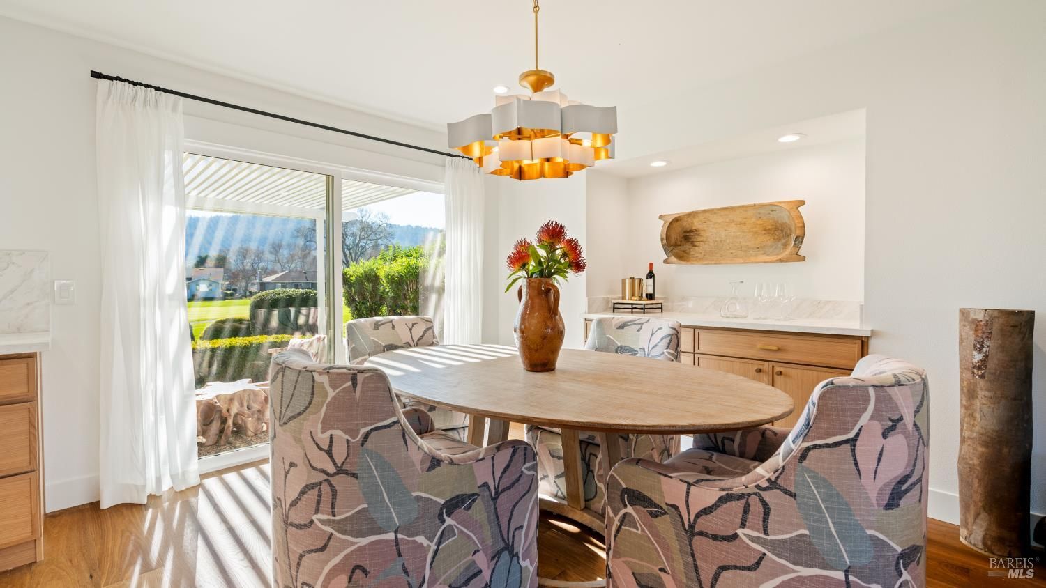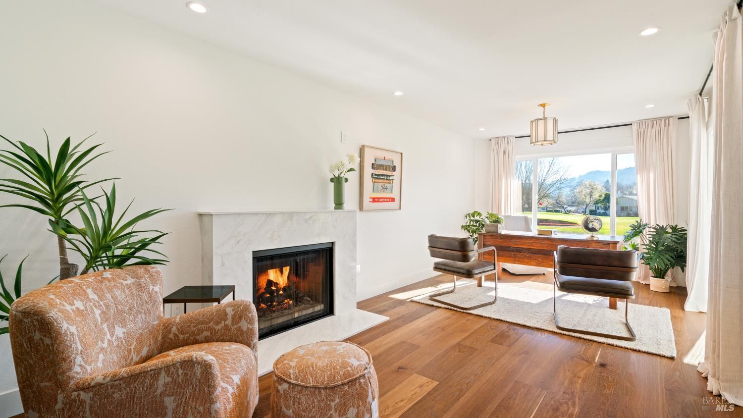 An exceptional opportunity to own a superbly renovated Oakmont home! This stunning 3-bedroom, 2-bathroom residence spans 1,860 square feet and offers breathtaking mountain views from its location on the golf course. Completely reimagined, it features custom wood kitchen cabinetry, top-of-the-line Thermador appliances, a convenient pot filler, elegant quartz countertops, a spacious island with a built-in drawer microwave, and a stylish bar area. The home boasts hardwood floors, new doors, windows, and window coverings, a new roof, upgraded air conditioning and heating systems, an epoxy-coated garage floor, and modern designer and recessed LED lighting throughout. The open-concept kitchen flows seamlessly into the dining and living areas, highlighted by a beautiful fireplace. The third bedroom is beautifully styled as a home office, also with a fireplace and a sliding door to the back patio. The meticulously maintained property includes a charming covered backyard patio perfect for sunset views and wildlife watching, along with a freshly landscaped yard with updated irrigation. Don't miss out on this extraordinary gem! Oakmont is a vibrant 55+ active adult community offering swimming, hiking, tennis, pickleball, golf, and more, nestled in the heart of Sonoma County's renowned Wine Country.