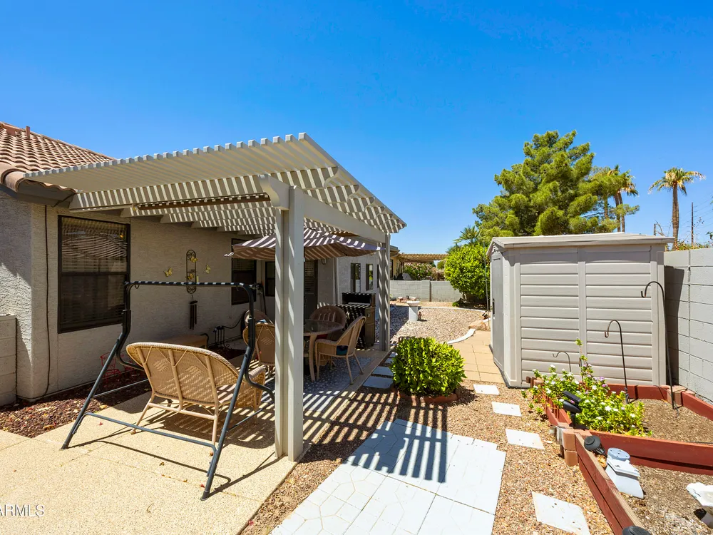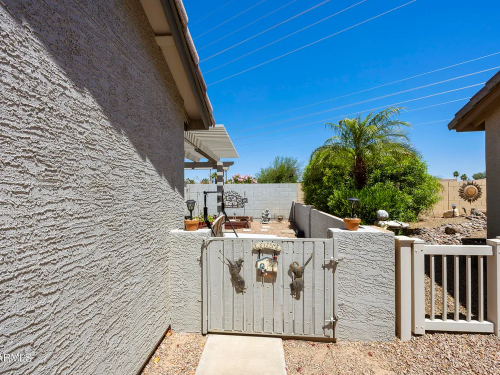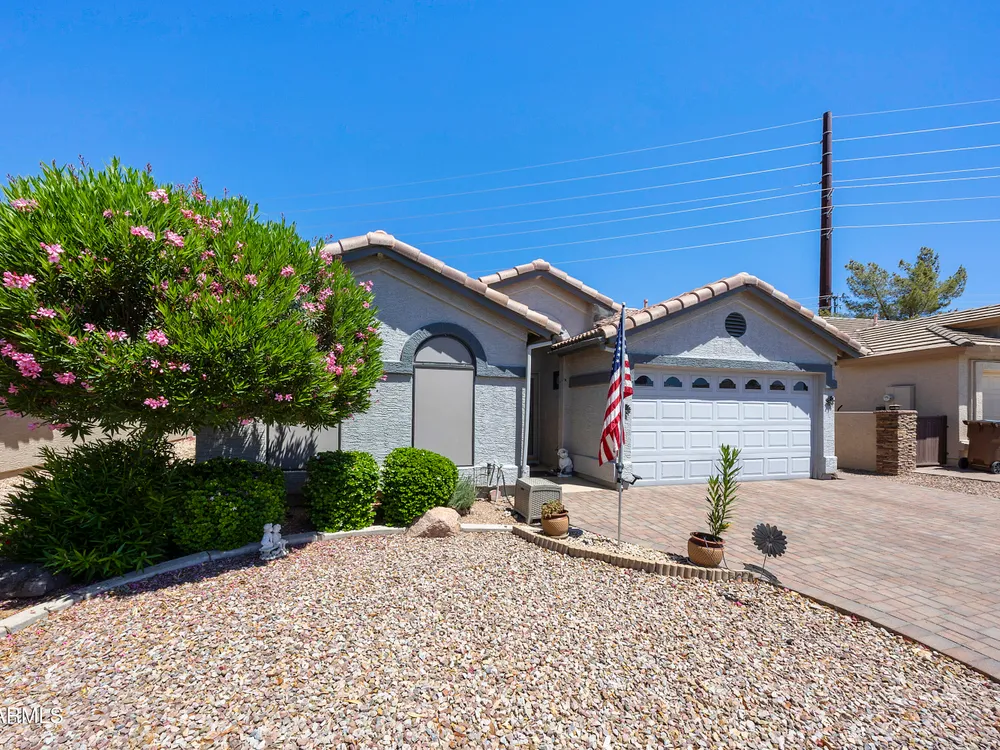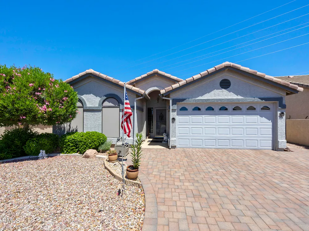 Charming 2BR, 2BA home in the very active adult community of Sun Lakes Country Club at Sun Lakes. Entertainer's kitchen w/granite counters, oak cabinets, newer SS appliances and breakfast bar. Cozy Great Room with dining area off kitchen and access to the enclosed, roomy AZ room with skylights, lots of windows, AC unit and two exits to the backyard. Pergola covered epoxied patio for that Arizona outdoor living. Primary suite with large walk-in closet and private ¾ bath with walk-in shower. Spare bedroom and bath are split from the primary for maximum guest privacy. 1.5 car garage, fruit trees, walled-in back yard, steps from the fishing pond. This one is move-in ready. Come enjoy the amenities of Sun Lakes Country Club with pools, tennis, golf, pickleball, restaurants and countless clubs.