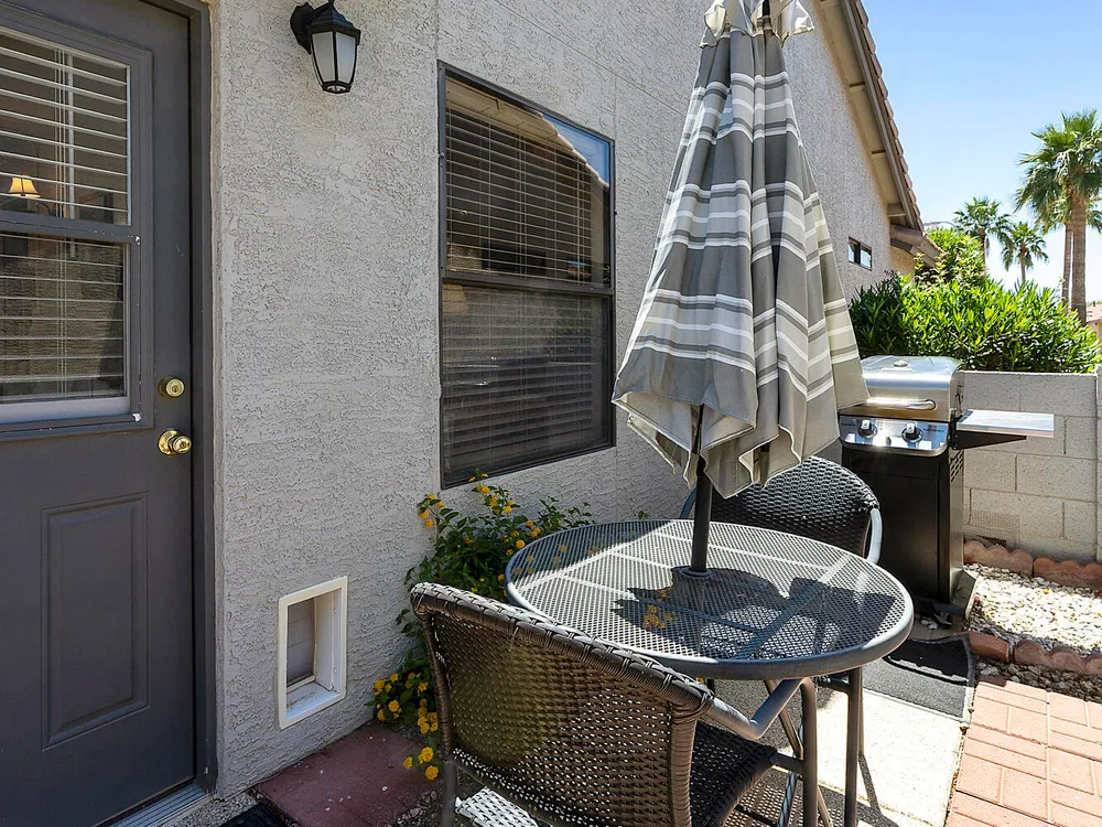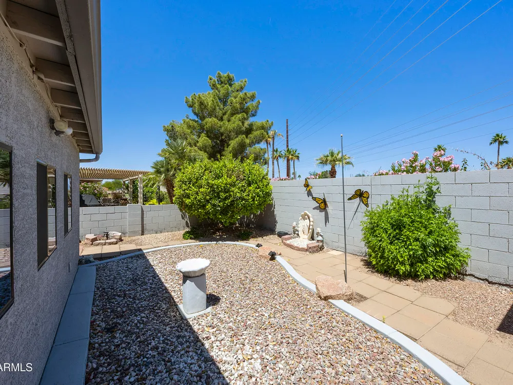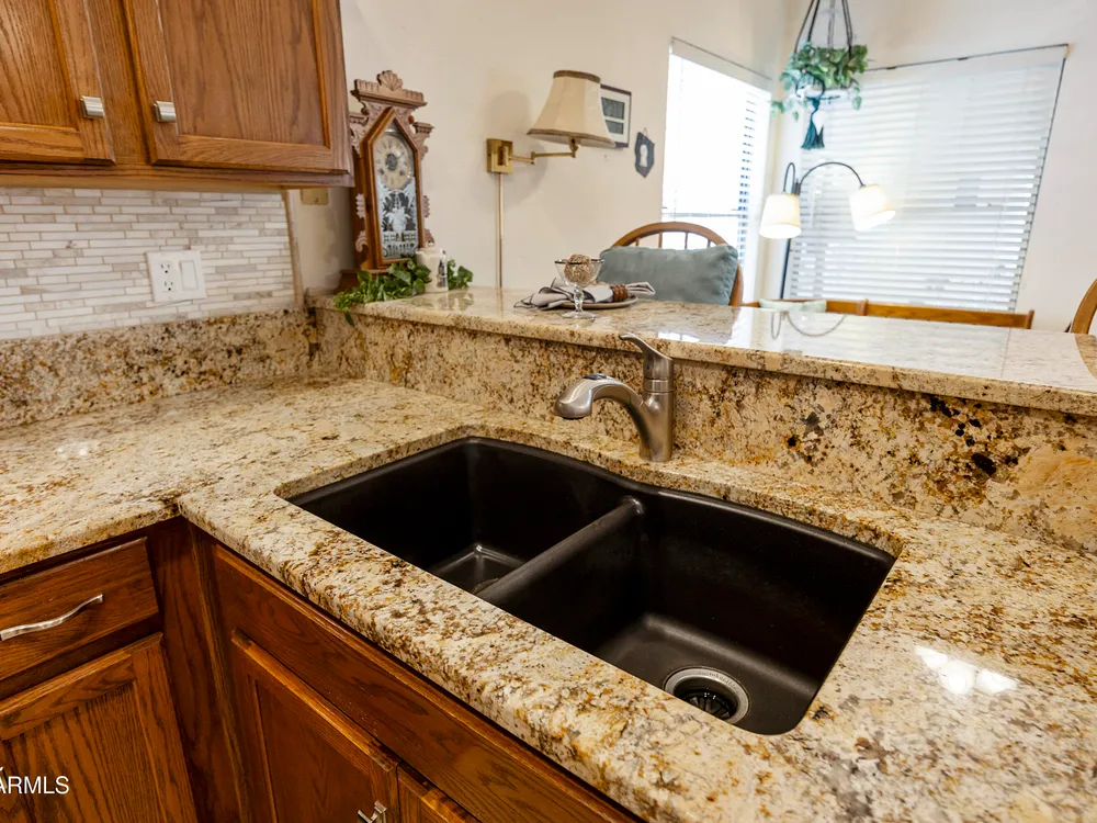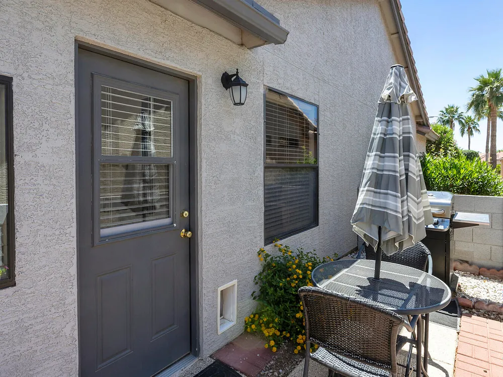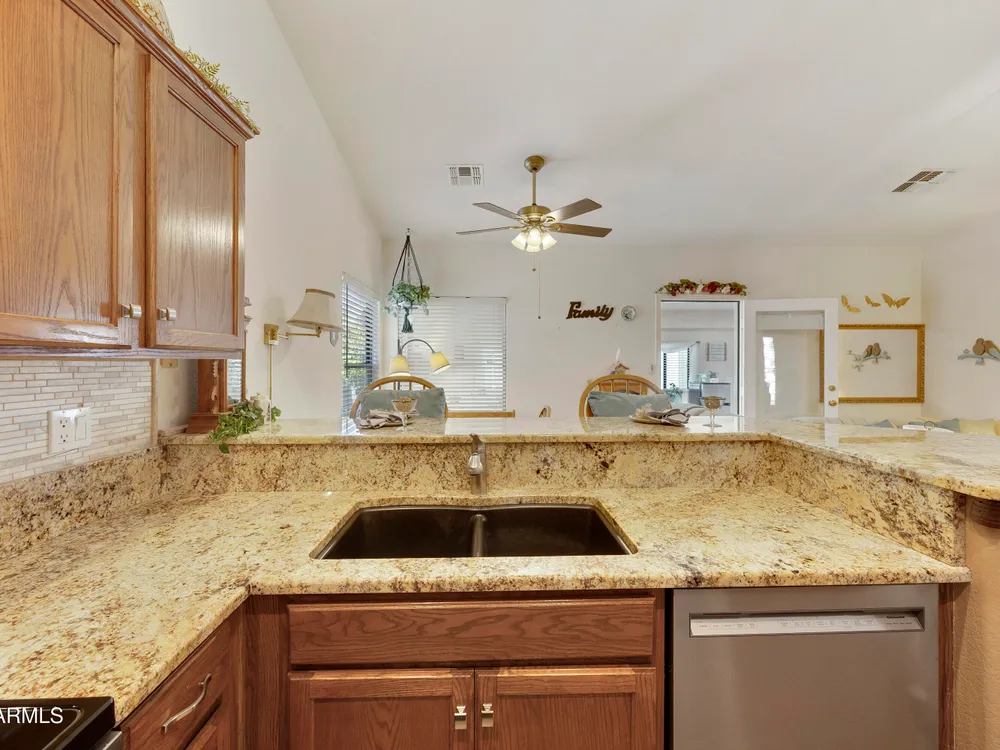 Charming 2BR, 2BA home in the very active adult community of Sun Lakes Country Club at Sun Lakes. Entertainer's kitchen w/granite counters, oak cabinets, newer SS appliances and breakfast bar. Cozy Great Room with dining area off kitchen and access to the enclosed, roomy AZ room with skylights, lots of windows, AC unit and two exits to the backyard. Pergola covered epoxied patio for that Arizona outdoor living. Primary suite with large walk-in closet and private ¾ bath with walk-in shower. Spare bedroom and bath are split from the primary for maximum guest privacy. 1.5 car garage, fruit trees, walled-in back yard, steps from the fishing pond. This one is move-in ready. Come enjoy the amenities of Sun Lakes Country Club with pools, tennis, golf, pickleball, restaurants and countless clubs.