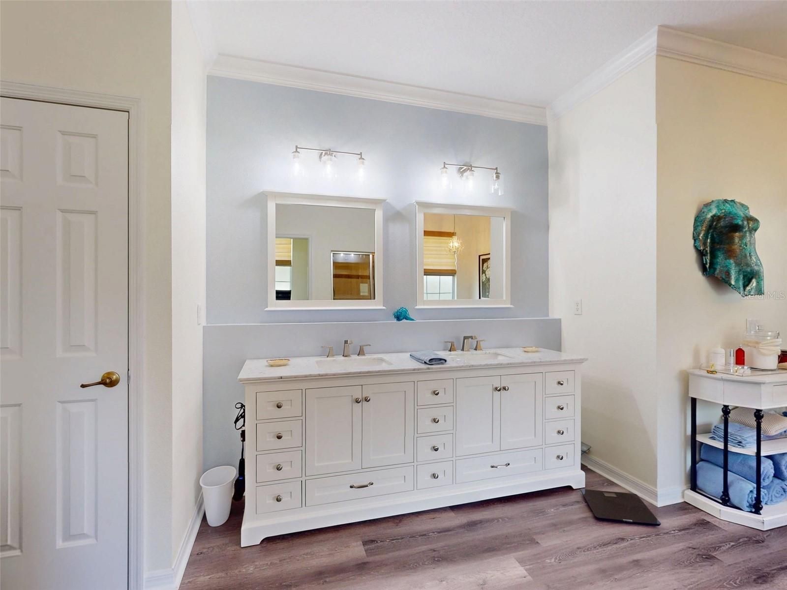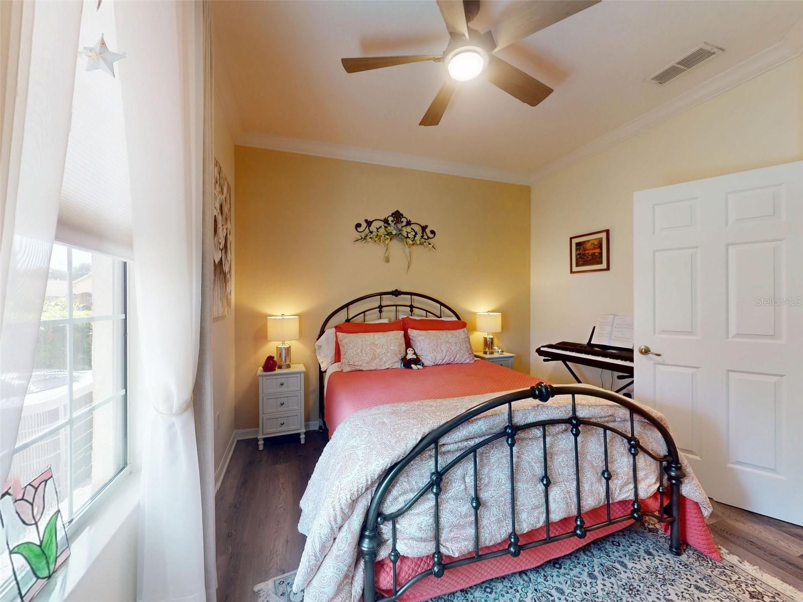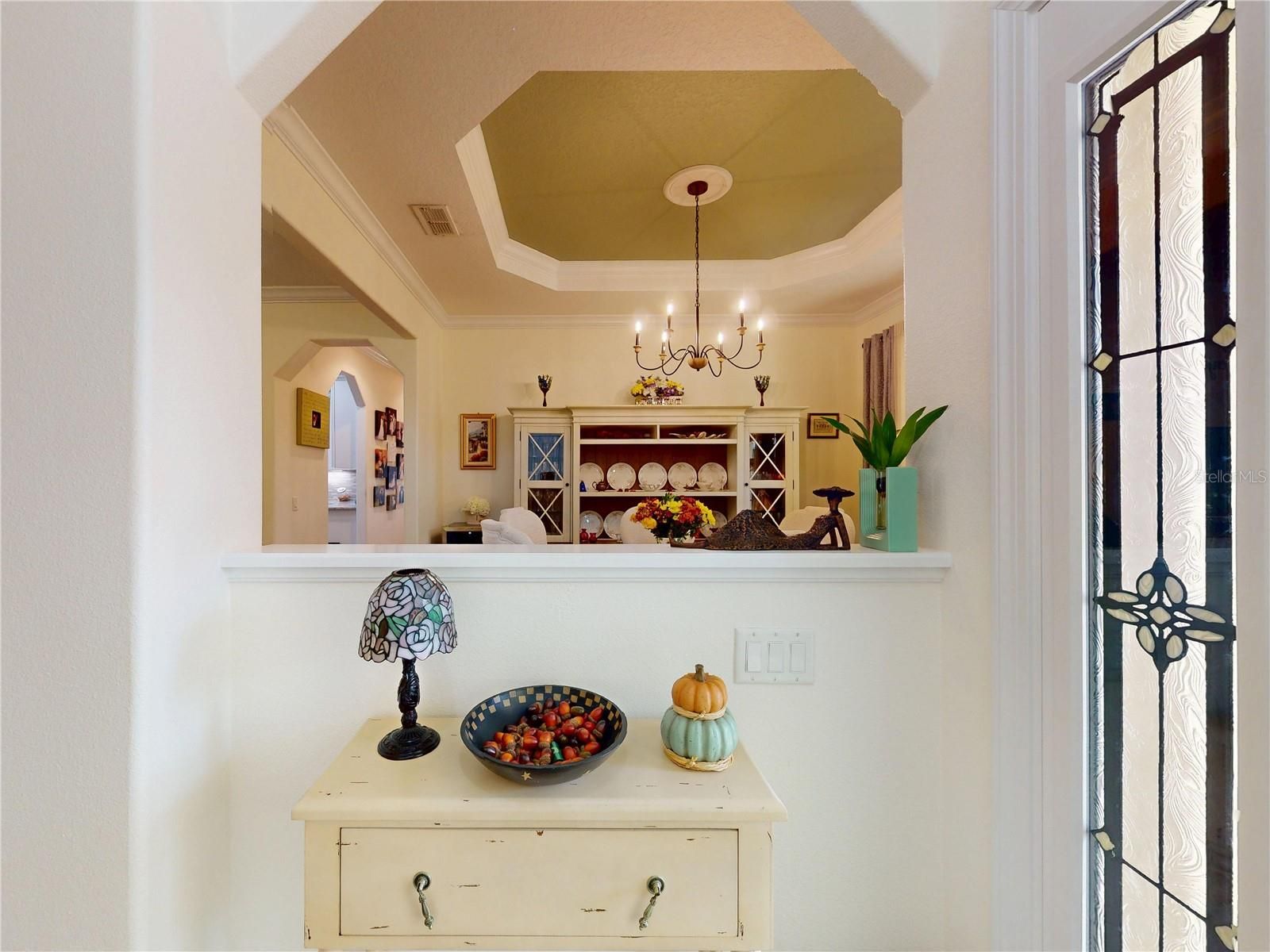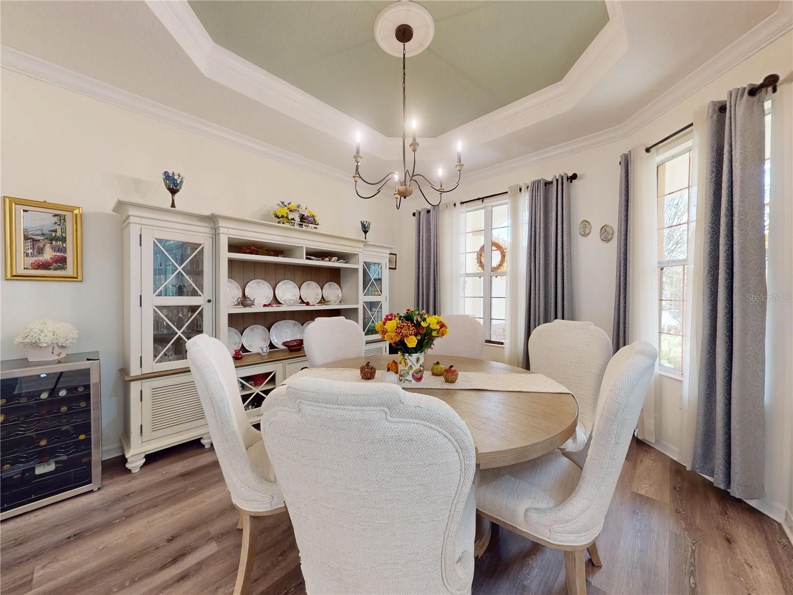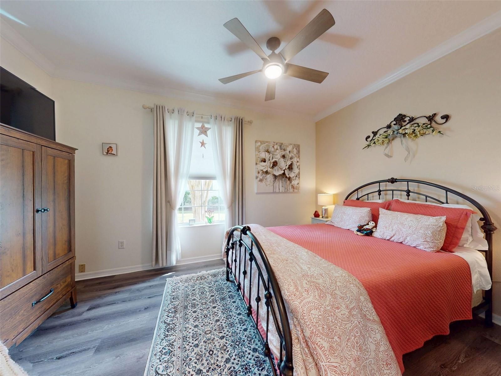 - Ceiling Fan(s), Crown Molding, Eat-in Kitchen, High Ceilings, Open Floorplan, Main Level Primary, Solid-Wood Cabinets, Split Bedrooms, Stone Counters, Thermostat, Tray Ceiling(s), Walk-In Closet(s), Window Treatments