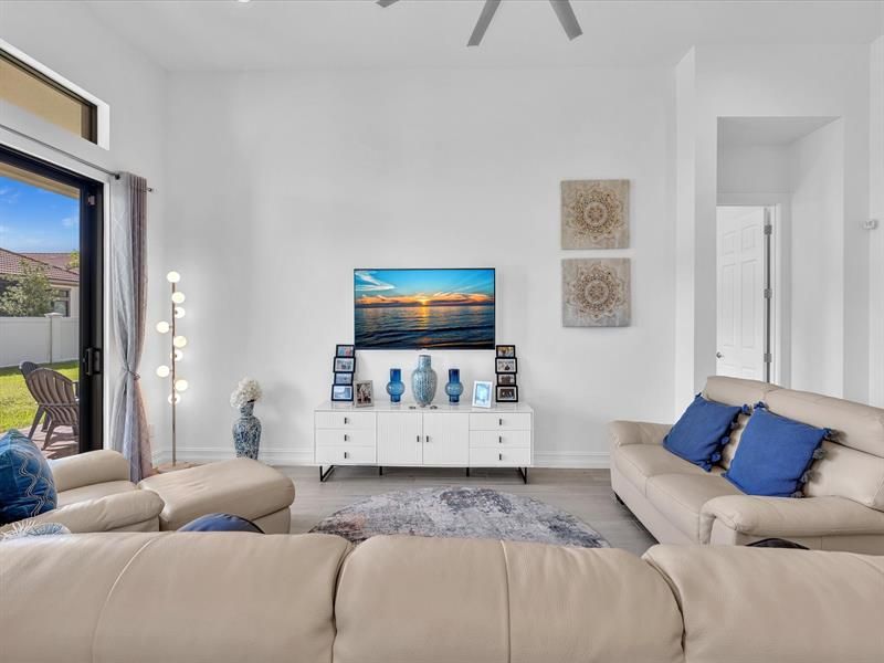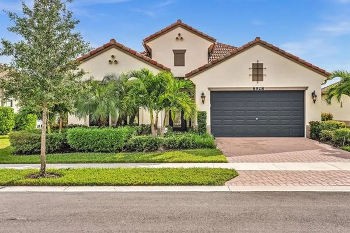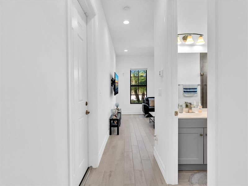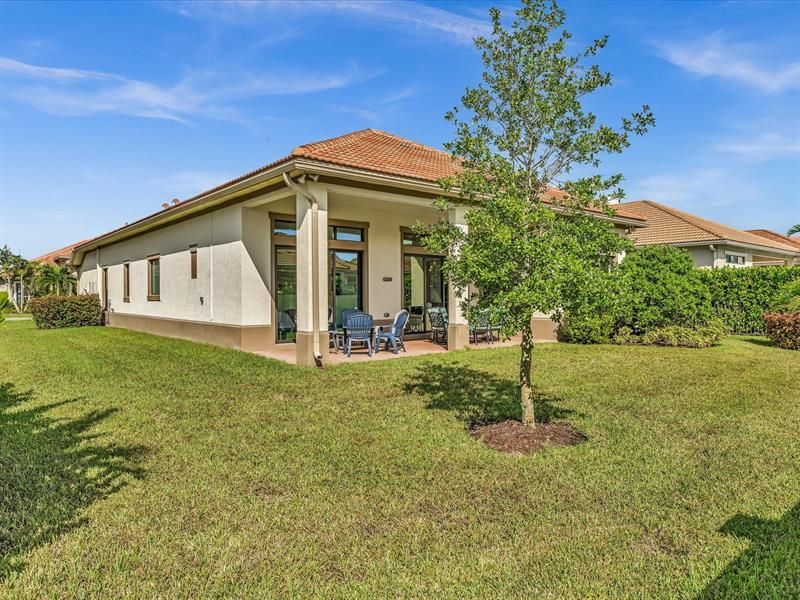 Great Scott! Vera Extra Suite model. Resort style living. 2607sq ft on a 70’x125’ lot w/rear privacy wall. 3BR & 3.5BA open floorplan. Private entry suite w/bedroom, living room, walk-in closet & laundry,perfect for college kids, parents & guests. The flex room serves as an office/study. Upgraded washer & dryer & laundry sink w/cabinets. Gorgeous main living, dining & kitchen area w/upgraded appliances & large island. Master bedroom w/sitting area. Master bath has dual vanities with separate shower & tub, walk-in closet. Plank style porcelain tile throughout. Impact windows & doors. Monitored alarm system. Window treatments & 5 wall mounted TVs included. 24hr guard gate. Clubhouse & amenities include: resort style pool, hot tub, separate lap pool, tennis & pickleball courts, fitness center
