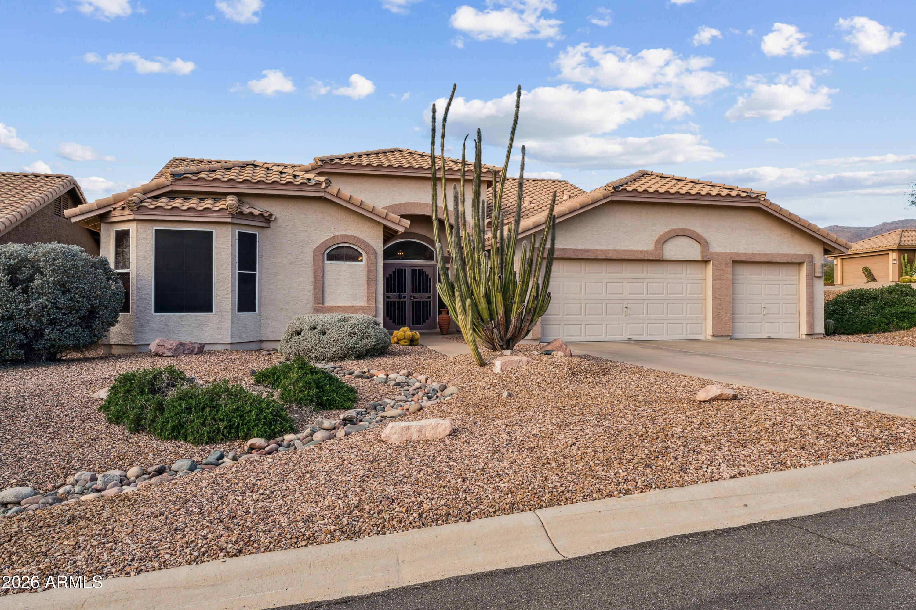 Original owner home situated on a large corner lot of nearly 10,000 sq. ft. This 3-bedroom, 2.5-bath residence features a spacious 3-car garage with ample storage, an extra-large laundry room, hard-piped irrigation system. Enjoy mountain views from the large, covered patio. The backyard backs to a wash, offering exceptional privacy. Home is being sold partially furnished. Experience the best of active adult living with top-notch community amenities, public golf, and on-site dining, all nestled at the base of the majestic Superstition Mountains. More pictures coming.