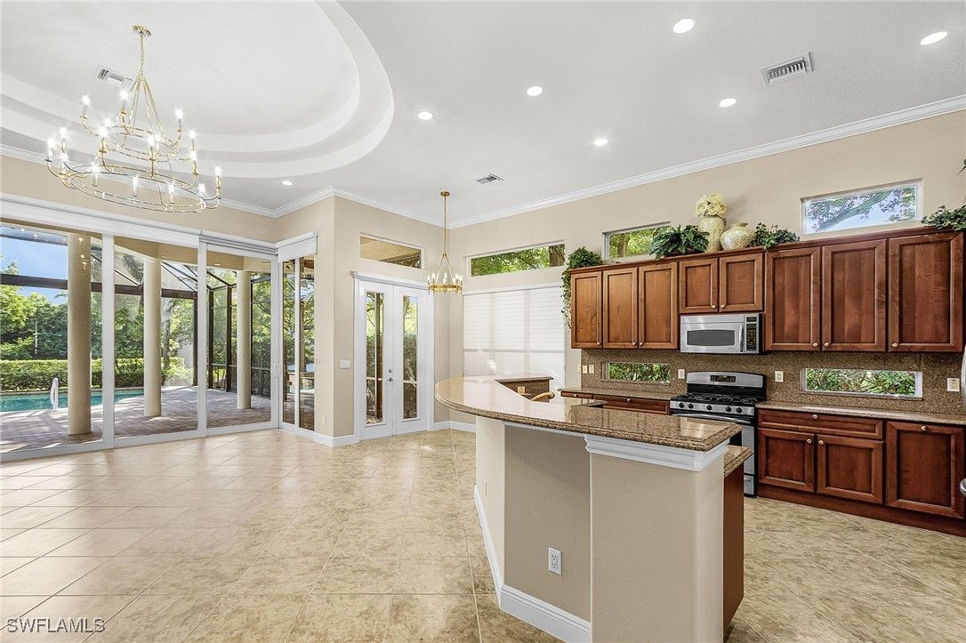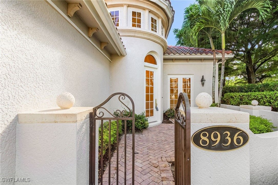 PRIVACY. PRIVACY. PRIVACY.PERHAPS THE MOST PRIVATE SETTING IN FIDDLER’S CREEK. TRANQUIL POOL AND WATER VIEWS. THIS HOME IS IN THE CRANBERRY CROSSING NEIGHBORHOOD. This home features the primrose floor plan with three bedrooms and 2 full baths, and two car garage. Enter through a gated courtyard entrance. The lanai includes covered space as well as picture window screen enclosure for wide open views. The pool includes a newer pool heater as well as spa which are controlled by Aqualink. Formal dining area off the turreted foyer. Arched hallway leads to the open family room and kitchen area with a spacious kitchen and breakfast area. Wooden cabinets, center island with raised counter and all stainless-steel appliances and gas range complete this functional kitchen layout. Large sliders lead to the lanai with indoor-outdoor living. Tray ceilings, 13’ ceilings and crown molding throughout as well as custom Hunter-Douglas silhouette shades make this home ready for you to move in. The owner’s suite with bay window is spacious and bright with en-suite bath complete with walk in shower and soaker tub, plus double granite top vanities and large walk-in closet. Luxurious designer grade carpeting completes this private retreat. The additional two guest rooms open off the front hallway separating the guest are from the owner’s suit. One has upgraded carpet and the other enjoys hardwood flooring. There is a spacious shared bath with tiled shower with glass enclosure. All in all this is perfect house for your forever home or you paradise get-away.