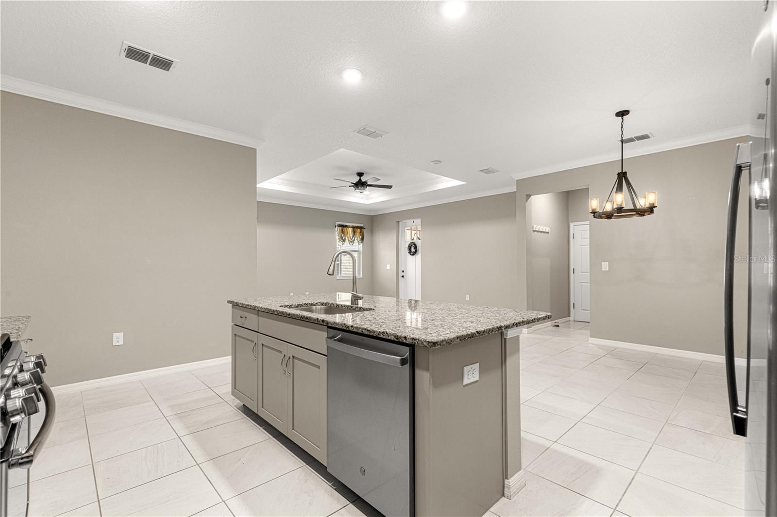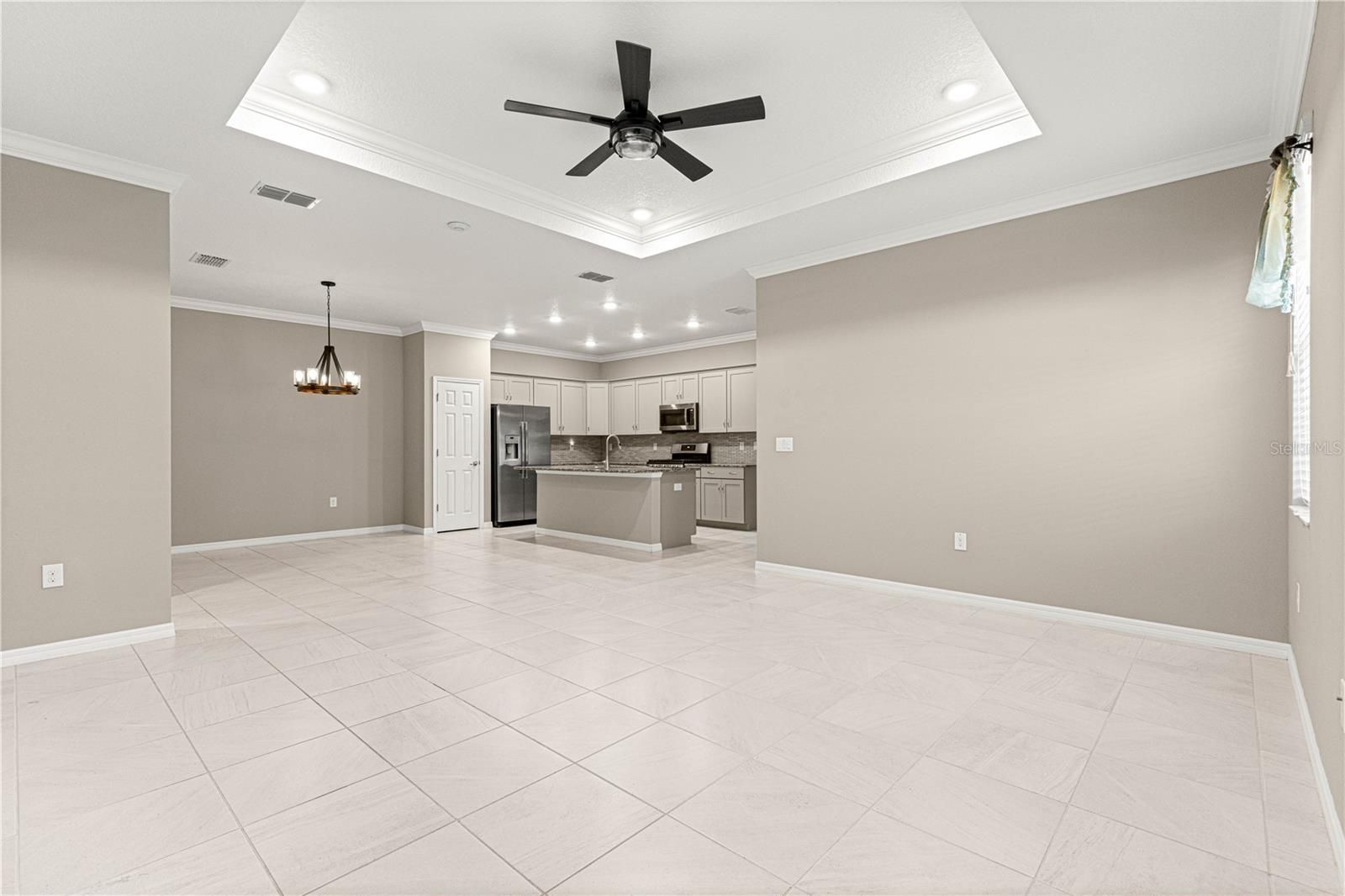 - Ceiling Fan(s), Eat-in Kitchen, Kitchen/Family Room Combo, Open Floorplan, Solid Surface Counters, Tray Ceiling(s), Walk-In Closet(s), Window Treatments