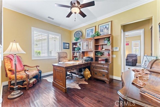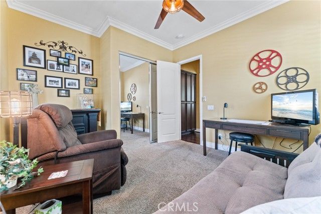 Refined Ground Floor Single-Level Living in Trilogy at Glen Ivy Welcome to an exceptional opportunity in the coveted 55+ enclave of Trilogy at Glen Ivy, where timeless elegance meets resort-style living. Nestled at the base of the Cleveland National Forest and surrounded by the lush fairways of the Glen Ivy Golf Course, this rare San Juan model offers a seamless blend of natural serenity and sophisticated design. Located on the ground level with no interior steps, this thoughtfully designed San Juan model features two bedrooms, two full baths, and a flexible den—ideal as a private study, media lounge, or elegant guest quarters. From the moment you enter through the dramatic rotunda foyer, you'll be drawn into a space that is both welcoming and architecturally distinct. The open-concept layout offers an effortless flow between the great room, dining area, and gourmet kitchen—perfect for hosting or relaxing in style. Designer finishes throughout the home are warm, refined, and inviting, setting a tone of casual luxury and comfort. Large windows frame serene views of the meadow and distant hills, creating a tranquil, ever-changing natural backdrop. The primary suite is a true retreat, complete with a coffered ceiling, spa-inspired walk-in shower, and a generously sized dressing room-style closet. Tucked away from the main living areas, it offers a quiet sanctuary with a boutique hotel feel. Outside, the expansive covered patio provides the perfect extension of the living space—ideal for morning coffee, evening cocktails, or intimate dinners beneath the stars. The tandem garage adds versatility, offering space for two vehicles or a combination of car, golf cart, and additional storage. The location is both peaceful and practical, just a short stroll from the community’s world-class amenities, including: Indoor lap pool and resort-style outdoor pool with cabanas State-of-the-art fitness and wellness center Full-service spa and salon Tennis and pickleball courts Social clubs, cultural events, and live performances at the private amphitheater This is more than a home—it’s a lifestyle defined by elegance, ease, and the joy of connection. Welcome to Trilogy at Glen Ivy. Elevated living for those who’ve earned it.