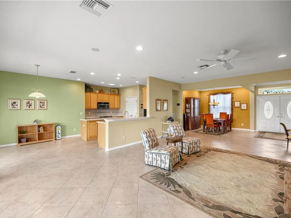 - Ceiling Fan(s), Eat-in Kitchen, High Ceilings, Kitchen/Family Room Combo, Living/Dining Room, Split Bedrooms, Thermostat