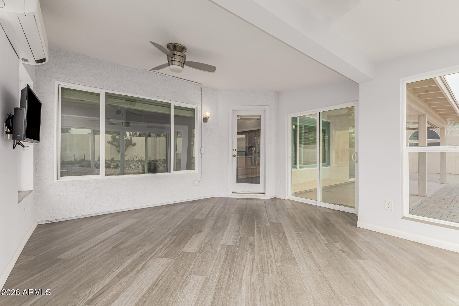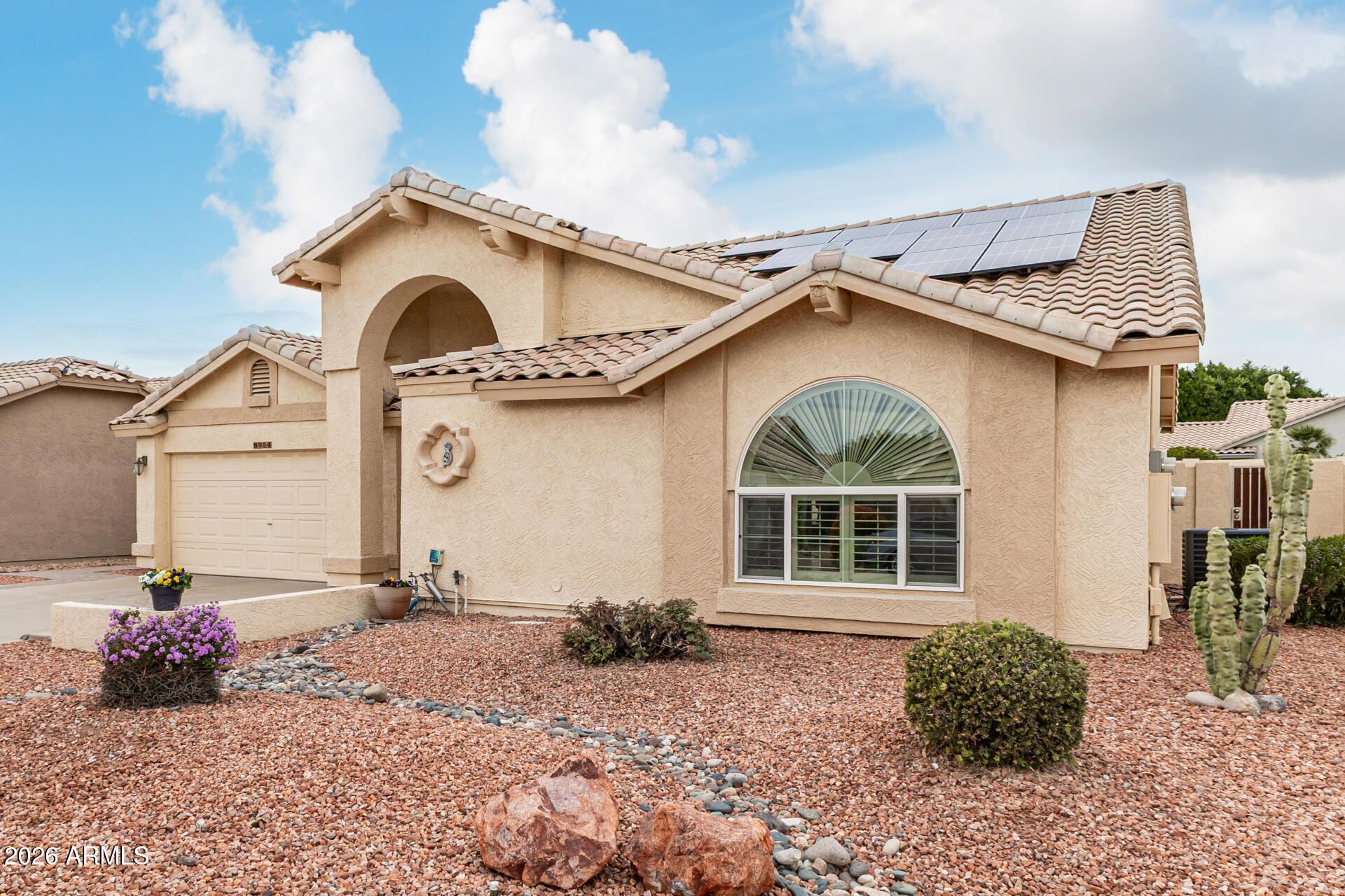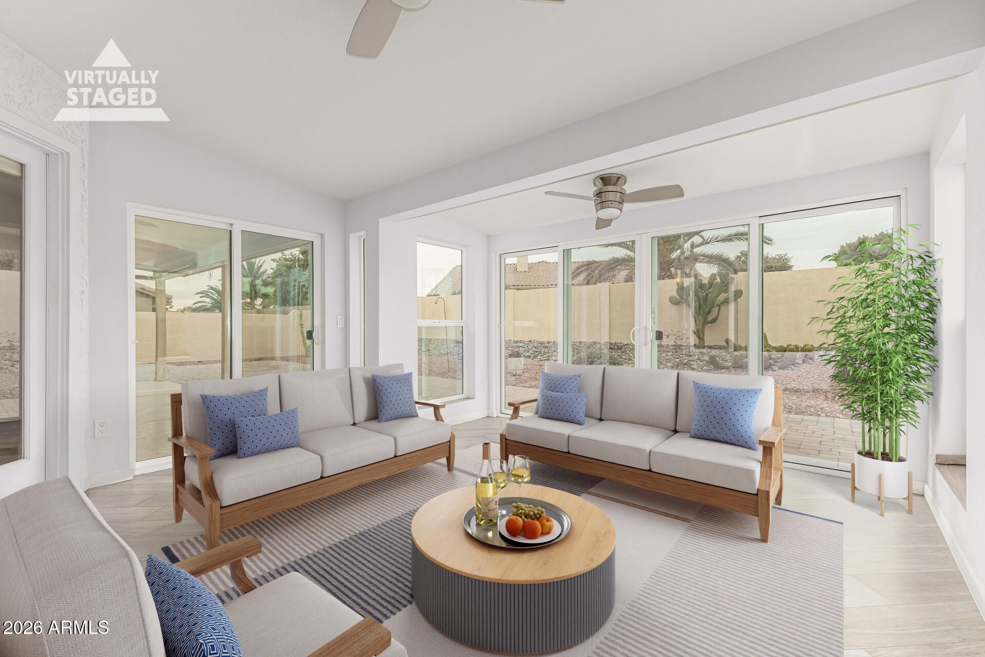 Located in the sought-after 55+ Westbrook Village, this beautifully maintained home offers an ideal AZ lifestyle focused on comfort, convenience, and low-maintenance living. The split floor plan features 2 private primary suites, perfect for hosting guests or flexible living arrangements. A standout feature is the approx. 200 sq ft enclosed patio with its own heating and cooling via a mini-split system (approx. 6 yrs. old), creating a true year-round indoor-outdoor living space ideal for enjoying AZ mild winters and warmer summers. The home is filled with abundant natural light and enhanced by many upgraded windows, while the kitchen and bathrooms have updated countertops. The primary bathroom includes a spacious, updated, walk-in shower. Major systems have been thoughtfully updated including a newer AC (approx. 6 yr.), water heater (approx. 4 yr.), and roof (approx. 8 yr). Leased solar panels (approx. 5 yr) help reduce monthly electric costs. Ideally located near dining, shopping, and medical offices, this home is part of an active adult community known for its outstanding amenities, social opportunities, and relaxed desert lifestyle. Washer, dryer, and refrigerator are included, making this home move-in ready.