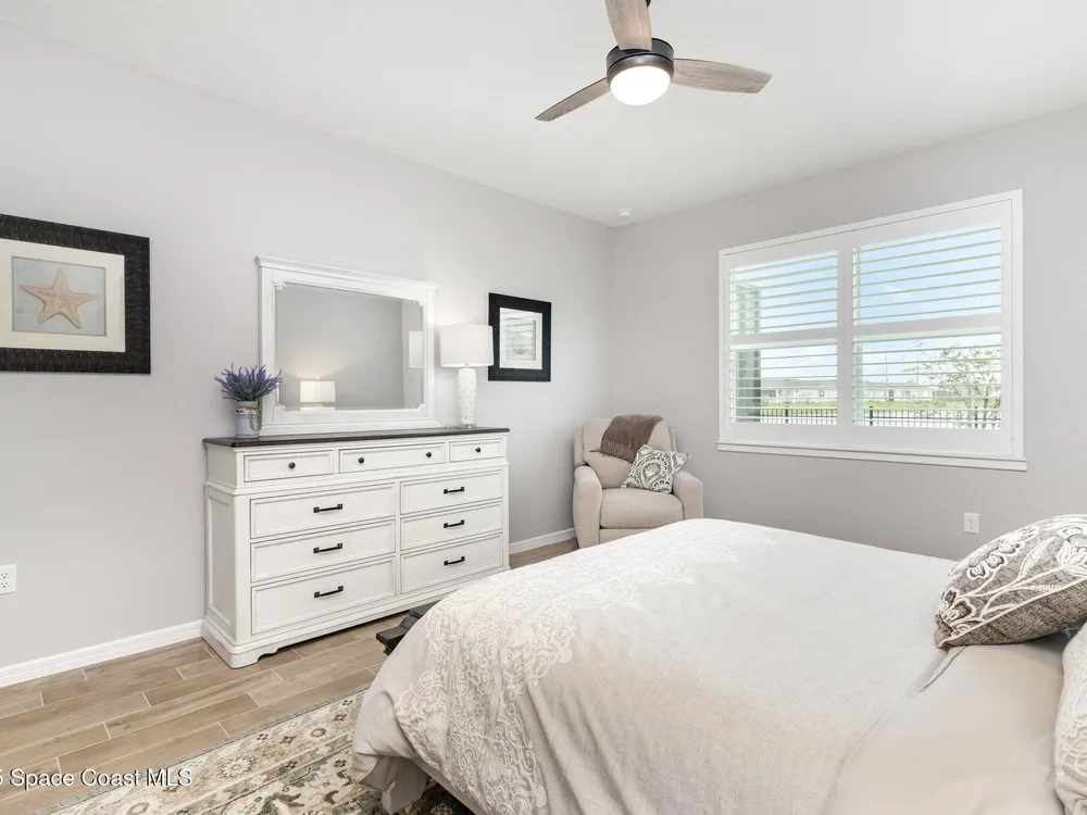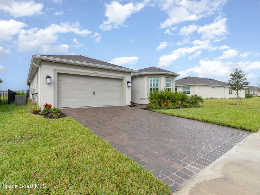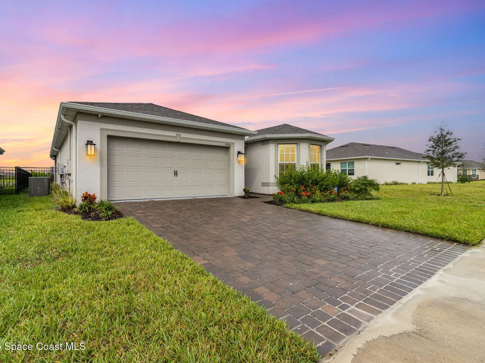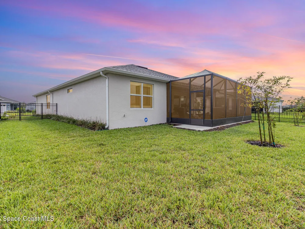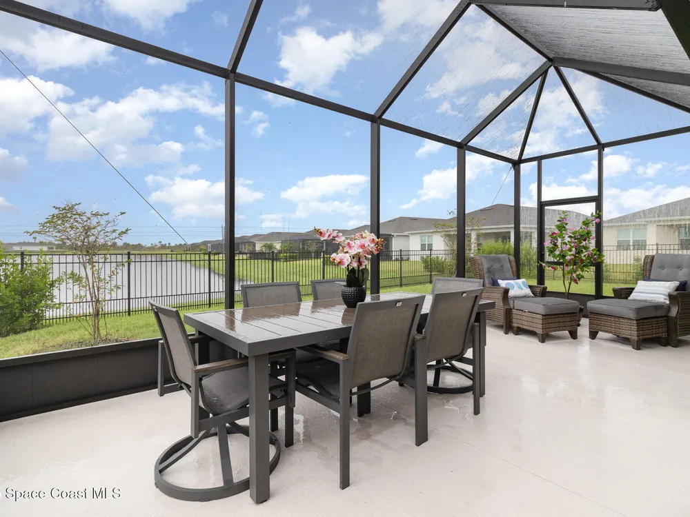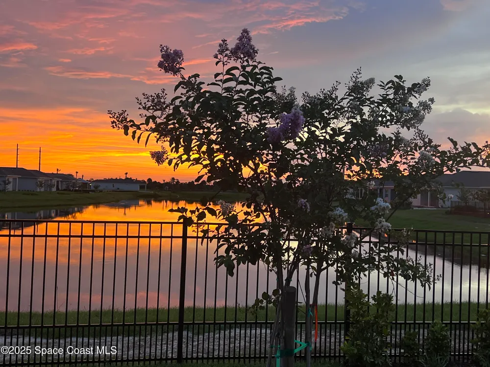 This stunning lakefront, oversized premium lot, 2Bed/2Bath + enclosed Flex room perfect for an extra guest bedroom or office. This is a Del Webb Palmary model with amazing sunset and water views and is ready to move in & start enjoying life in an active resort-style community. Entertaining is easy with a large open concept gathering room with tray ceiling, kitchen with large island, and cafe. There is an extended screened lanai, electric hurricane impact screens, fenced yard with puppy picket, plantation shutters, designer window treatments & lighting fixtures. The 2-car garage was extended by 4ft & has epoxy flooring, upgraded laundry room has both upper and lower cabinets and a sink, built-in HMC outside laundry room. Cameras and security system are installed. Chef's kitchen has upgrades such as quartz countertops, stainless steel Whirlpool appliances, wood hood, upgraded sink/faucet, backsplash, under-cabinet lighting and so much more. Other upgrades include ceramic tile flooring, This 55+ Del Webb at Viera community features amenities you will love. Also included with your amenities is a membership to the Duran Golf Course. The 30,000 (under roof) Sq. Ft. Clubhouse Clubhouse with waterfront view and incredible sunsets is under construction and is expected to open early 2026. This Resort Style Clubhouse will have a Zero-Entry Pool w/ Sun shelf, Onsite Tavern & Grille, Outdoor Spa, Fire-pits, Lawn Events, Arts and Crafts Center, Mahjong, Yoga, Zumba, a diverse range of clubs, monthly events, dog park and so much more. Our Manned Gated community is only a few miles to the Viera Hospital, the Viera Regional Park, the Viera Shopping Area/Town Center, the Brevard Zoo, the Shops at Lake Andrew, Costo and a diverse array of dining and entertainment options.
