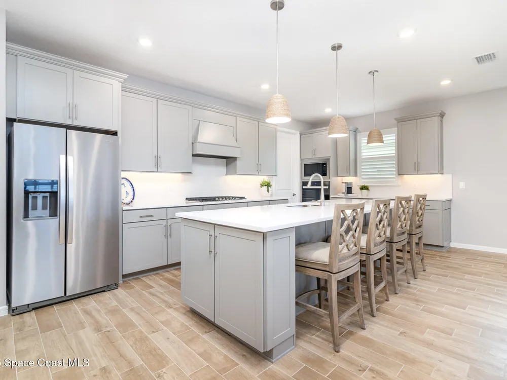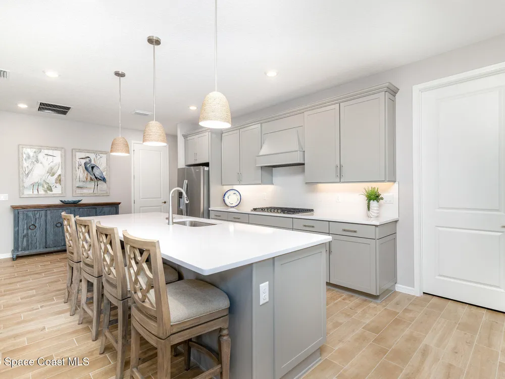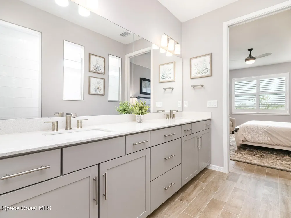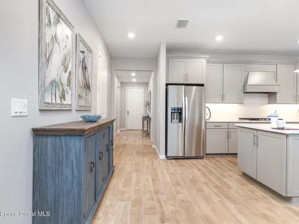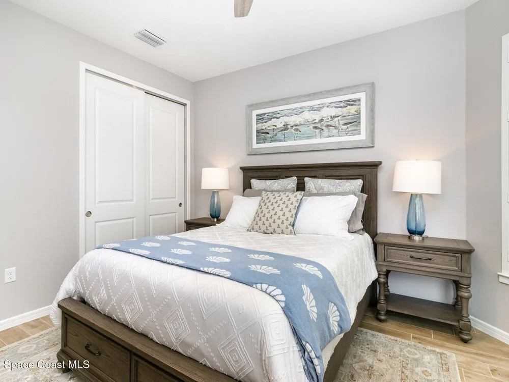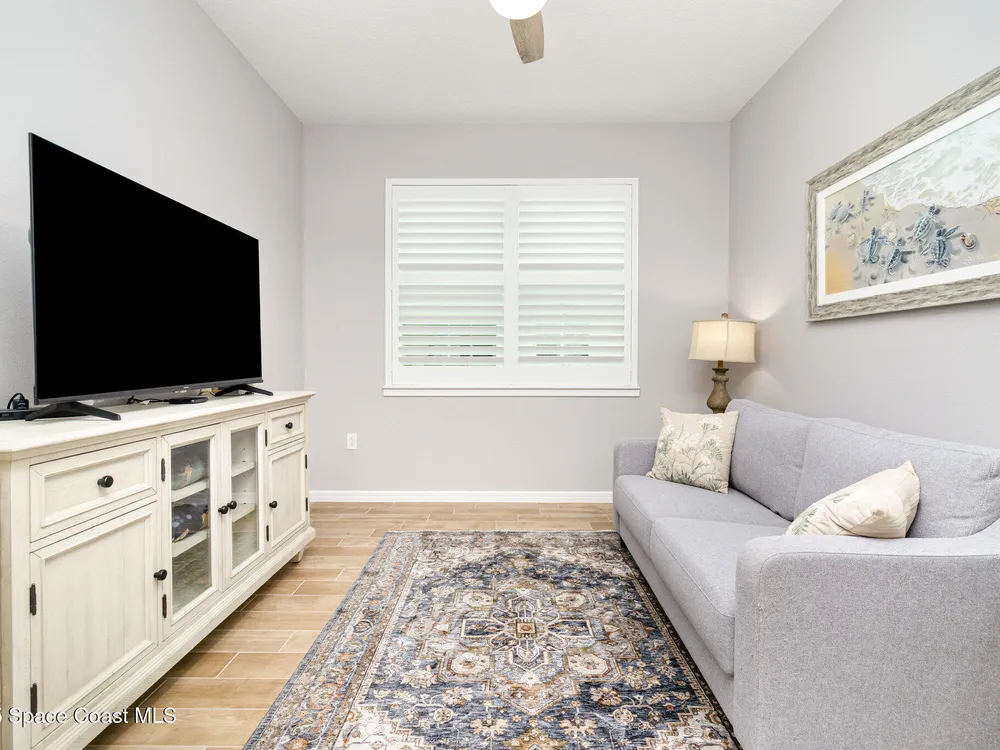 This stunning lakefront, oversized premium lot, 2Bed/2Bath + enclosed Flex room perfect for an extra guest bedroom or office. This is a Del Webb Palmary model with amazing sunset and water views and is ready to move in & start enjoying life in an active resort-style community. Entertaining is easy with a large open concept gathering room with tray ceiling, kitchen with large island, and cafe. There is an extended screened lanai, electric hurricane impact screens, fenced yard with puppy picket, plantation shutters, designer window treatments & lighting fixtures. The 2-car garage was extended by 4ft & has epoxy flooring, upgraded laundry room has both upper and lower cabinets and a sink, built-in HMC outside laundry room. Cameras and security system are installed. Chef's kitchen has upgrades such as quartz countertops, stainless steel Whirlpool appliances, wood hood, upgraded sink/faucet, backsplash, under-cabinet lighting and so much more. Other upgrades include ceramic tile flooring, This 55+ Del Webb at Viera community features amenities you will love. Also included with your amenities is a membership to the Duran Golf Course. The 30,000 (under roof) Sq. Ft. Clubhouse Clubhouse with waterfront view and incredible sunsets is under construction and is expected to open early 2026. This Resort Style Clubhouse will have a Zero-Entry Pool w/ Sun shelf, Onsite Tavern & Grille, Outdoor Spa, Fire-pits, Lawn Events, Arts and Crafts Center, Mahjong, Yoga, Zumba, a diverse range of clubs, monthly events, dog park and so much more. Our Manned Gated community is only a few miles to the Viera Hospital, the Viera Regional Park, the Viera Shopping Area/Town Center, the Brevard Zoo, the Shops at Lake Andrew, Costo and a diverse array of dining and entertainment options.