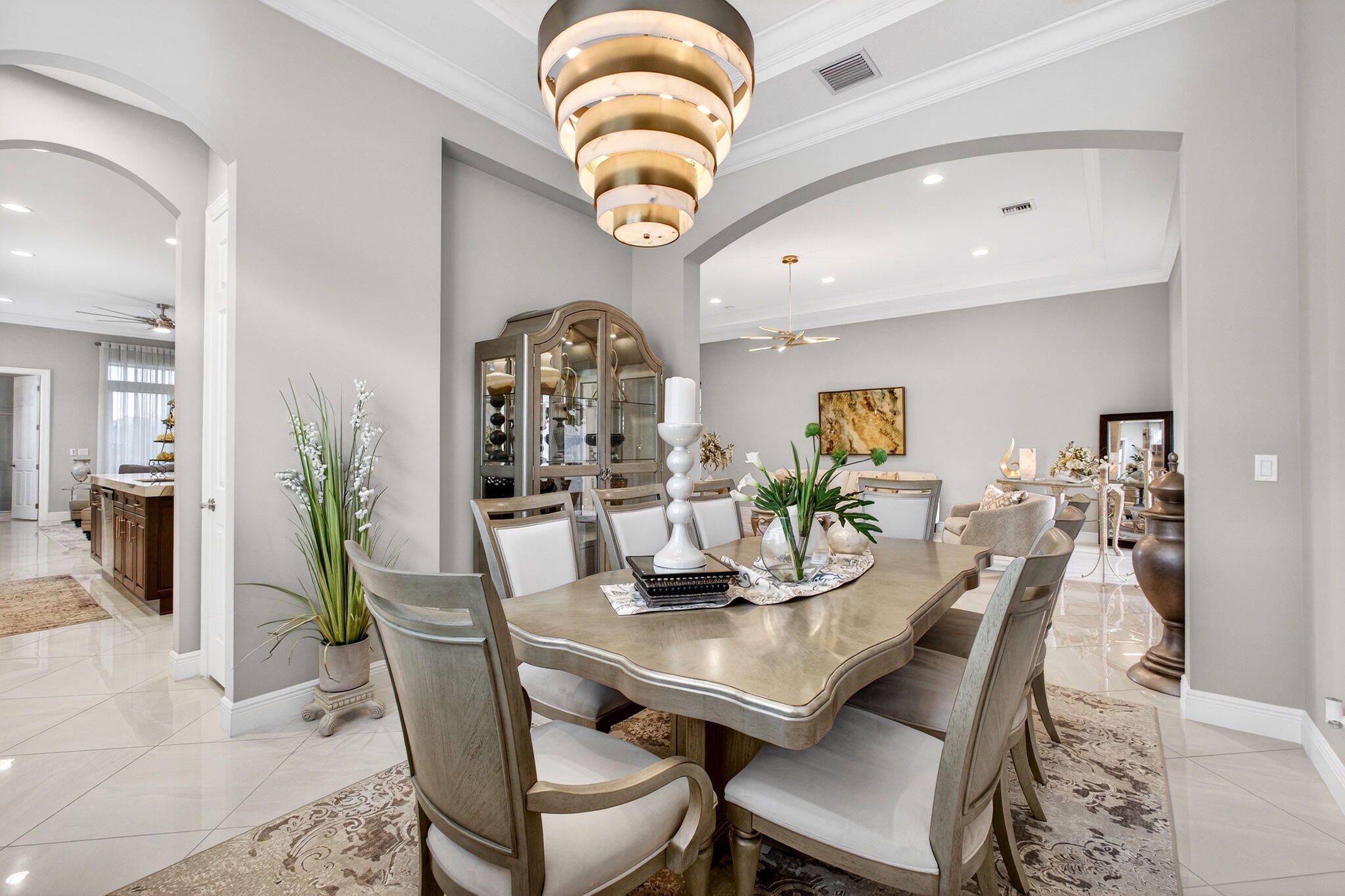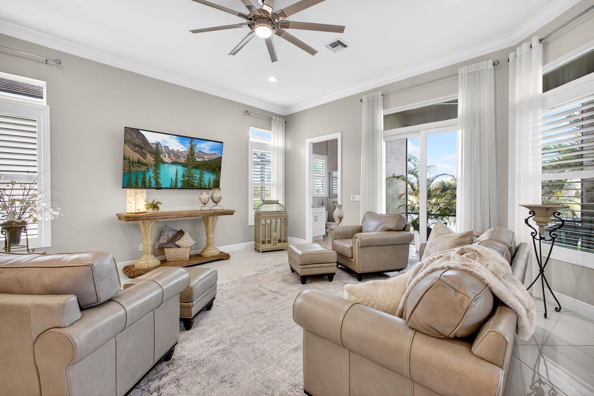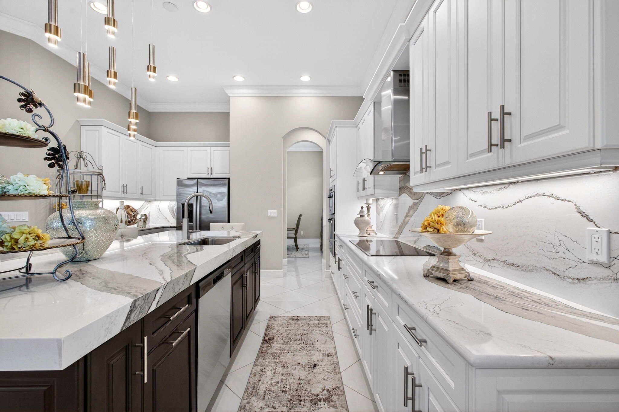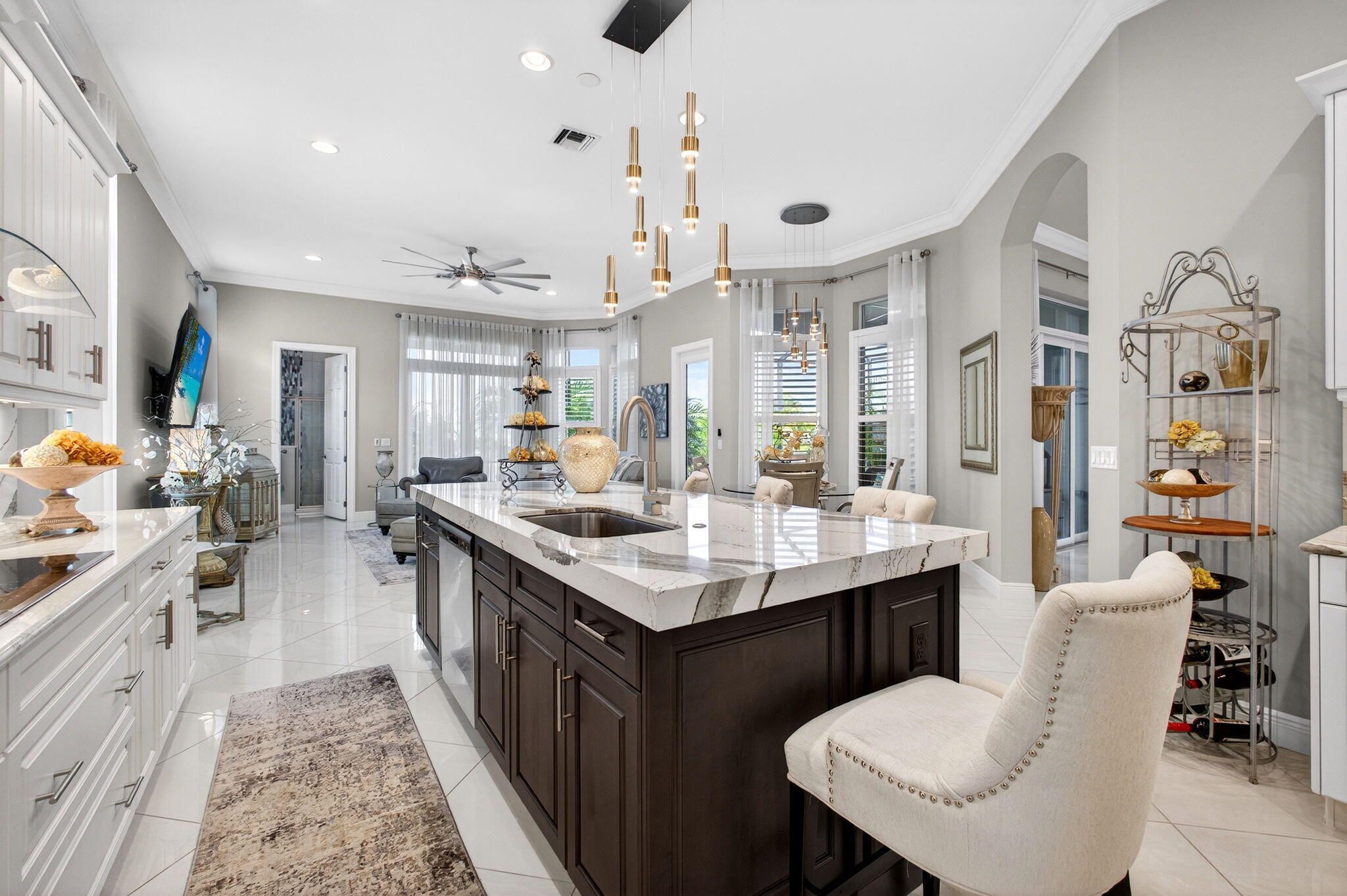 Welcome to an exceptional Collina model residence within Cresswind at PGA Verano, a premier 55+ community offering refined living and outstanding amenities. This home delivers 3,244 square feet of thoughtfully designed living space and was built with nearly every available builder upgrade, creating a level of quality, finish, and detail that would be difficult and time-consuming to replicate today. The arrival is polished and inviting, framed by a decorative entry gate and lush, custom landscaping. Inside, diagonal-set tile flooring, crown molding throughout, tray ceilings, and architectural detailing create a clean, elegant atmosphere. The kitchen is a true showpiece, featuring quartz countertops, an oversized island, upgraded soft-close cabinetry, designer backsplash, built-in wall The kitchen is a true showpiece, featuring quartz countertops, an oversized island, upgraded soft-close cabinetry, designer backsplash, built-in wall oven, electric cooktop, glass canopy hood, and a full stainless appliance packageperfect for both entertaining and everyday living. The primary suite offers a spa-inspired retreat with upgraded quartz vanities, frameless glass shower, and floor-to-ceiling tile. Guest accommodations are equally well-appointed, including a cabana bath with direct indoor-outdoor access. Outdoor living is exceptional, highlighted by an expanded, screened-in lanai offering rare privacy and a tranquil, zen-like setting surrounded by mature landscaping. Impact windows and doors, upgraded laundry room, enhanced lighting, full gutter system, and meticulous craftsmanship complete the offering. Residents enjoy access to the Club Talavera resort-style pools, fitness and wellness facilities, tennis, pickleball, and a vibrant calendar of social and dining events. Best of all, this highly upgraded home is immediately availableoffering the opportunity to enjoy luxury living now, without the extended wait of new construction. A rare, offering in Cresswind at PGA Verano.