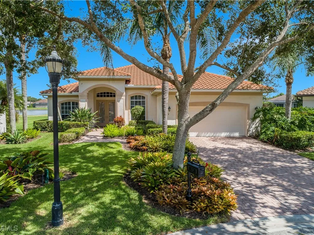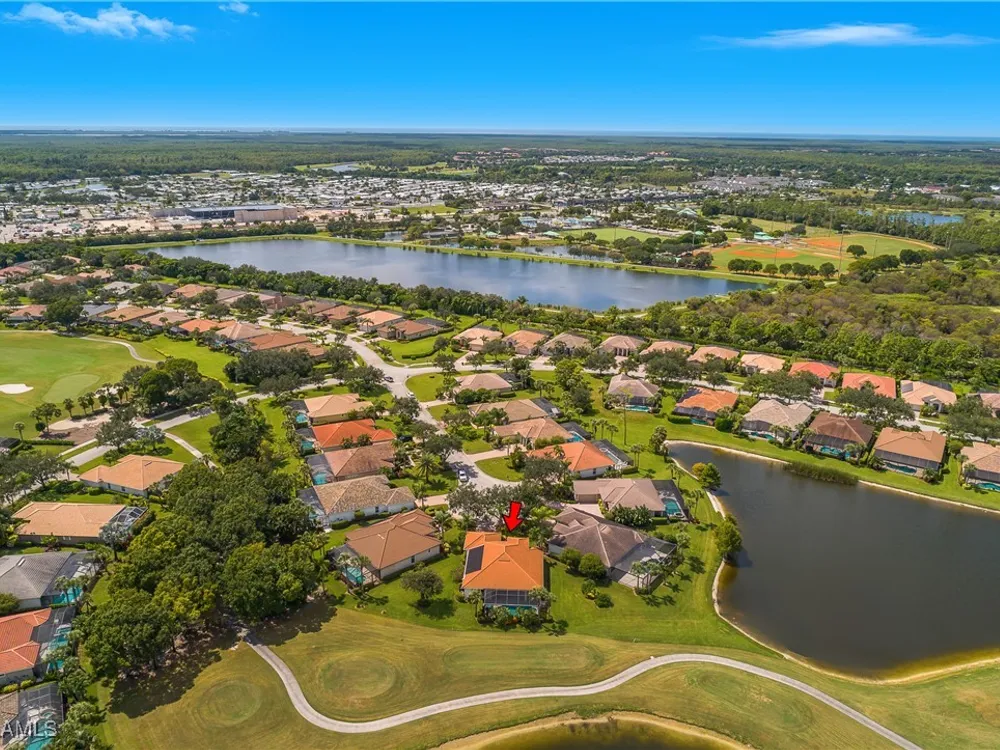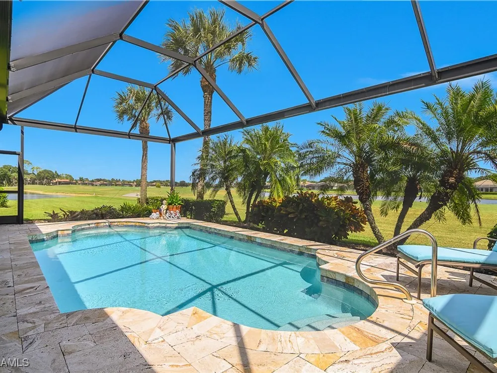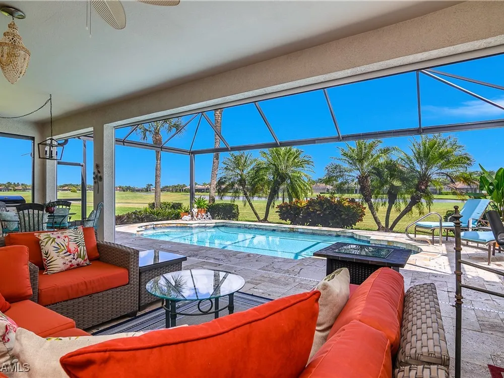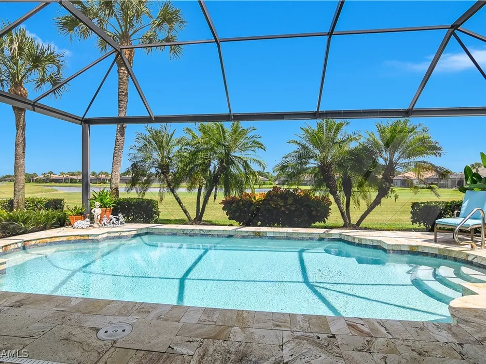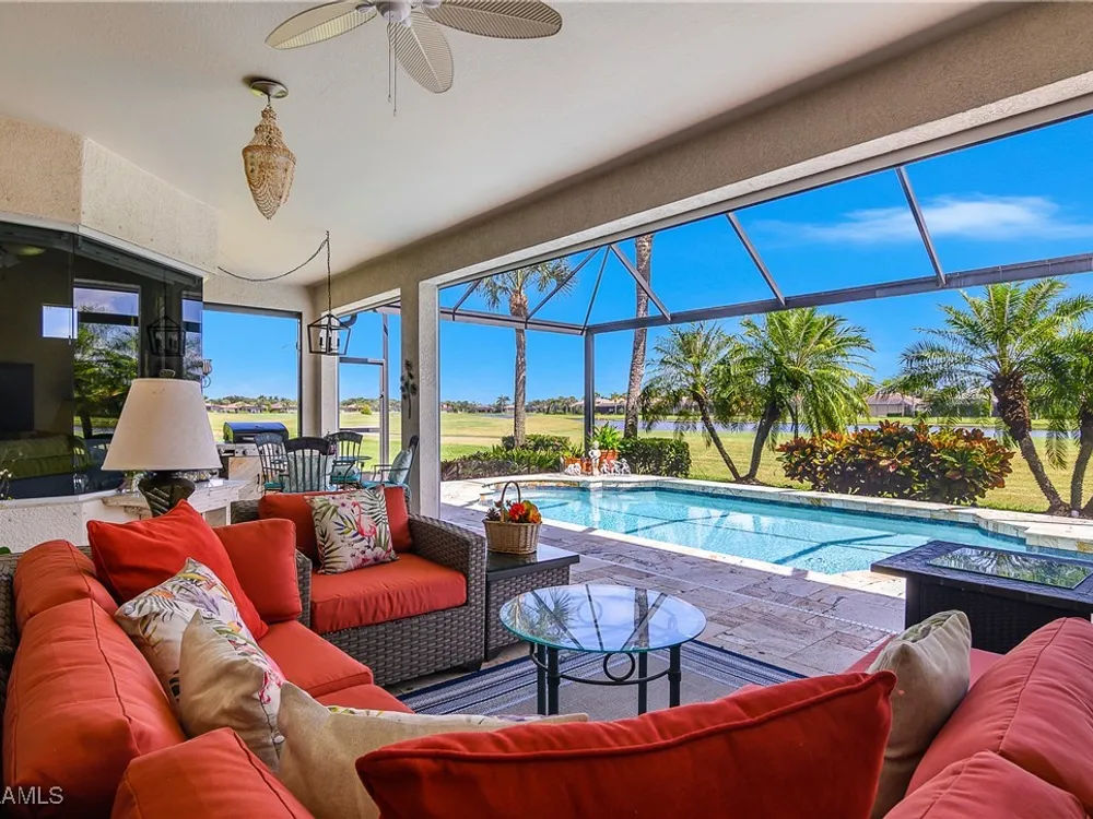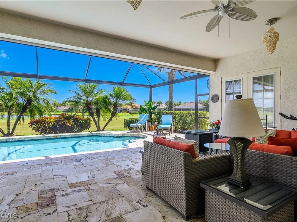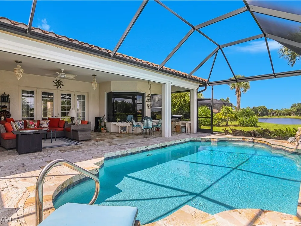 Outstanding lake view from this home located at the end of a cul-de-sac. Fabulous privacy with this 2 bedroom plus a den home. Foyer leads to large living room (great room) with marble framed fireplace and elegant dining room. Kitchen has stainless appliances, highly upgraded cabinets and quartz counters. Elegant master bedroom with walk-in closet and a custom designed ladies make-up area. Master bath has updated shower and dual sinks. Both master bed and bath have new hurricane windows installed in 2024. Split bedrooms allow for privacy in the guest bedroom and bath. Lovely pool has panoramic screen done in 2022. Lanai has hurricane screens put in by Storm Smart 2023. Pool is heated by solar and electric. High end AC replaced in 2025. New roof 2022. Two car garage with new spring board. Mustang Island is a gated community for homeowner security. The Players Club and Spa resort style amenities are included with this home. The Club offers three pools, tennis, pickle ball, bocce, spa, a complete fitness center, and a full social calendar. Lely Resort offers the perfect balance of leisure and recreation.