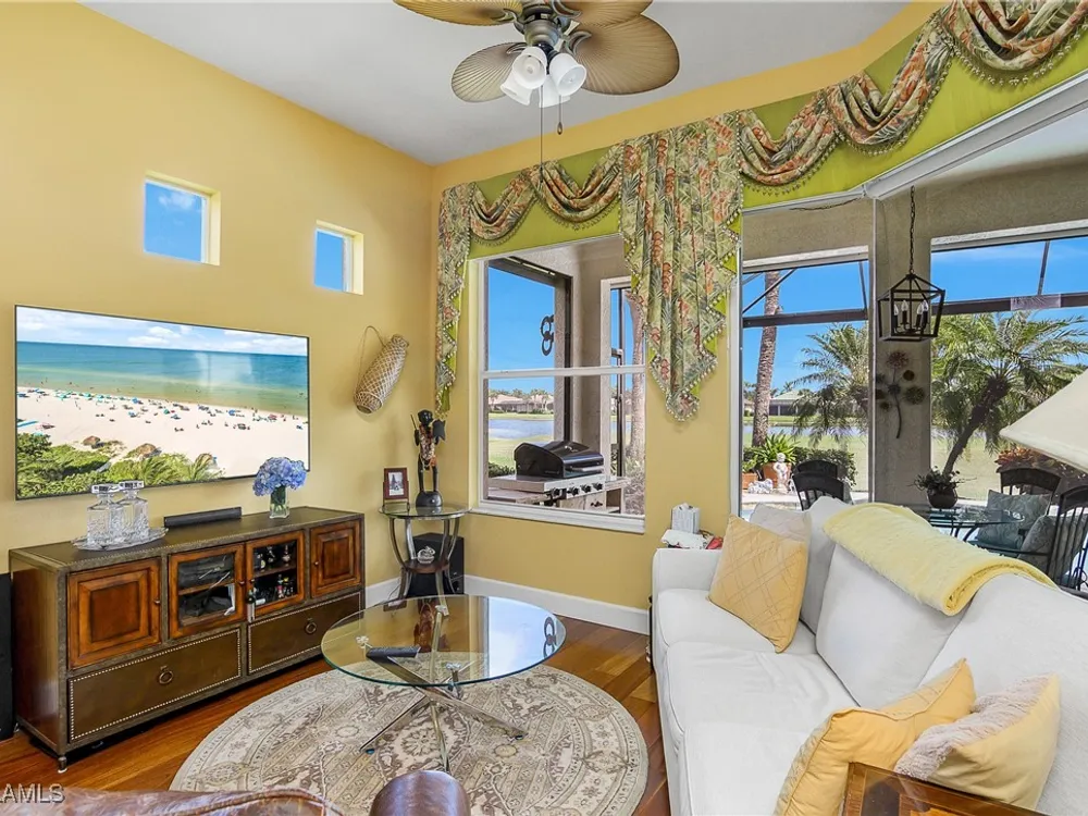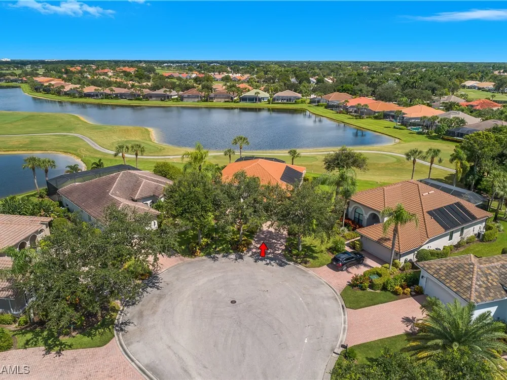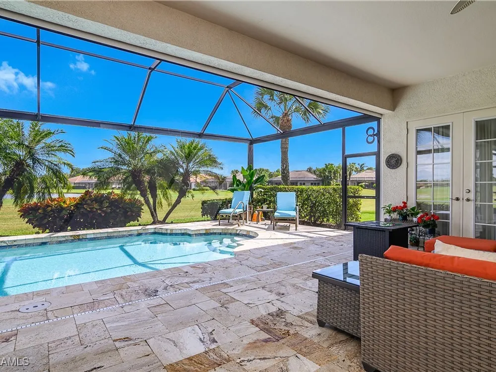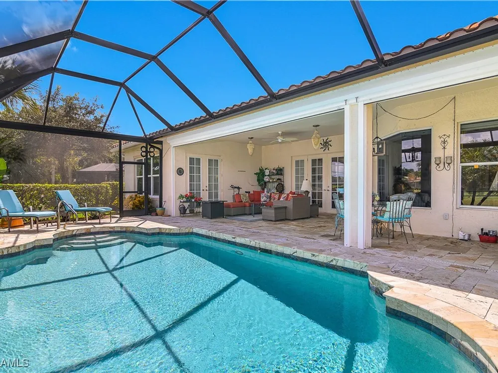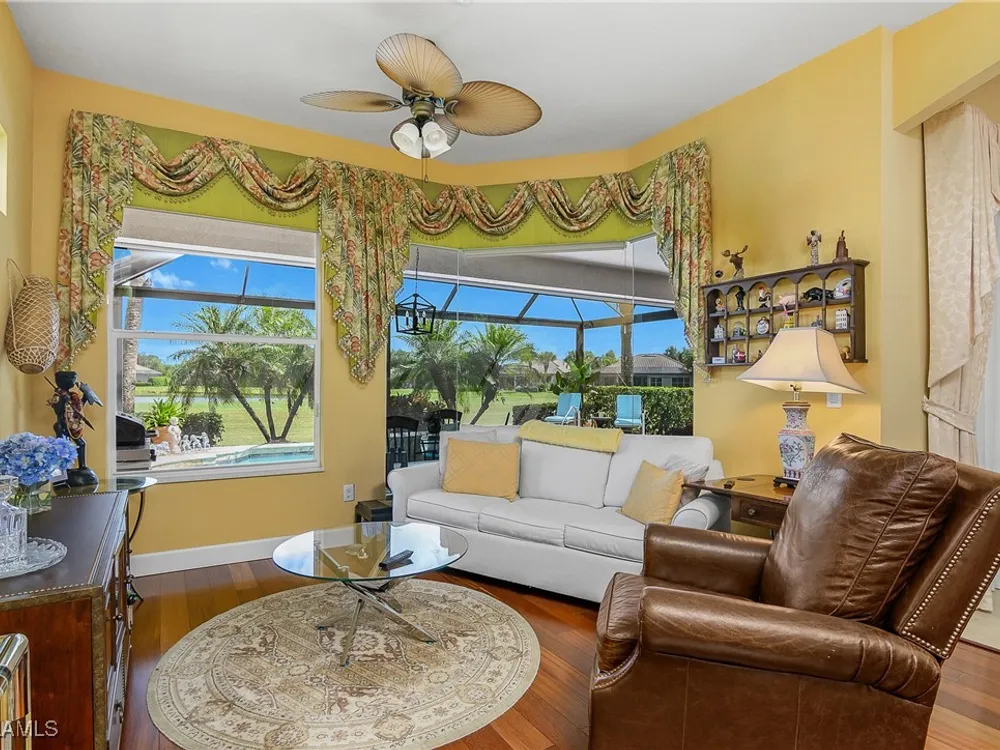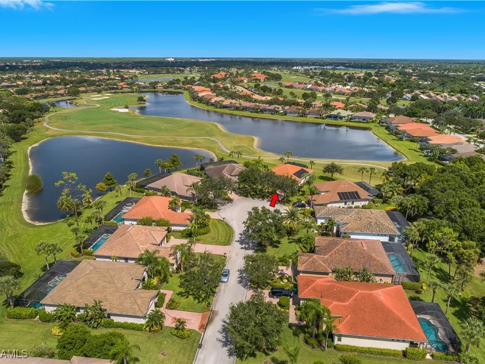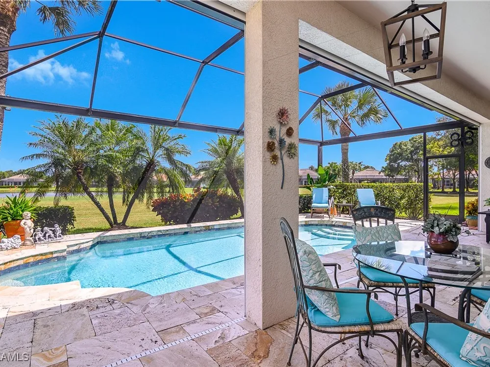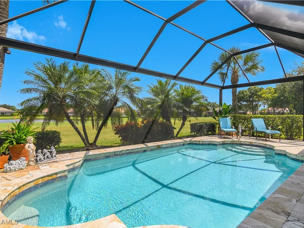 Outstanding lake view from this home located at the end of a cul-de-sac. Fabulous privacy with this 2 bedroom plus a den home. Foyer leads to large living room (great room) with marble framed fireplace and elegant dining room. Kitchen has stainless appliances, highly upgraded cabinets and quartz counters. Elegant master bedroom with walk-in closet and a custom designed ladies make-up area. Master bath has updated shower and dual sinks. Both master bed and bath have new hurricane windows installed in 2024. Split bedrooms allow for privacy in the guest bedroom and bath. Lovely pool has panoramic screen done in 2022. Lanai has hurricane screens put in by Storm Smart 2023. Pool is heated by solar and electric. High end AC replaced in 2025. New roof 2022. Two car garage with new spring board. Mustang Island is a gated community for homeowner security. The Players Club and Spa resort style amenities are included with this home. The Club offers three pools, tennis, pickle ball, bocce, spa, a complete fitness center, and a full social calendar. Lely Resort offers the perfect balance of leisure and recreation.