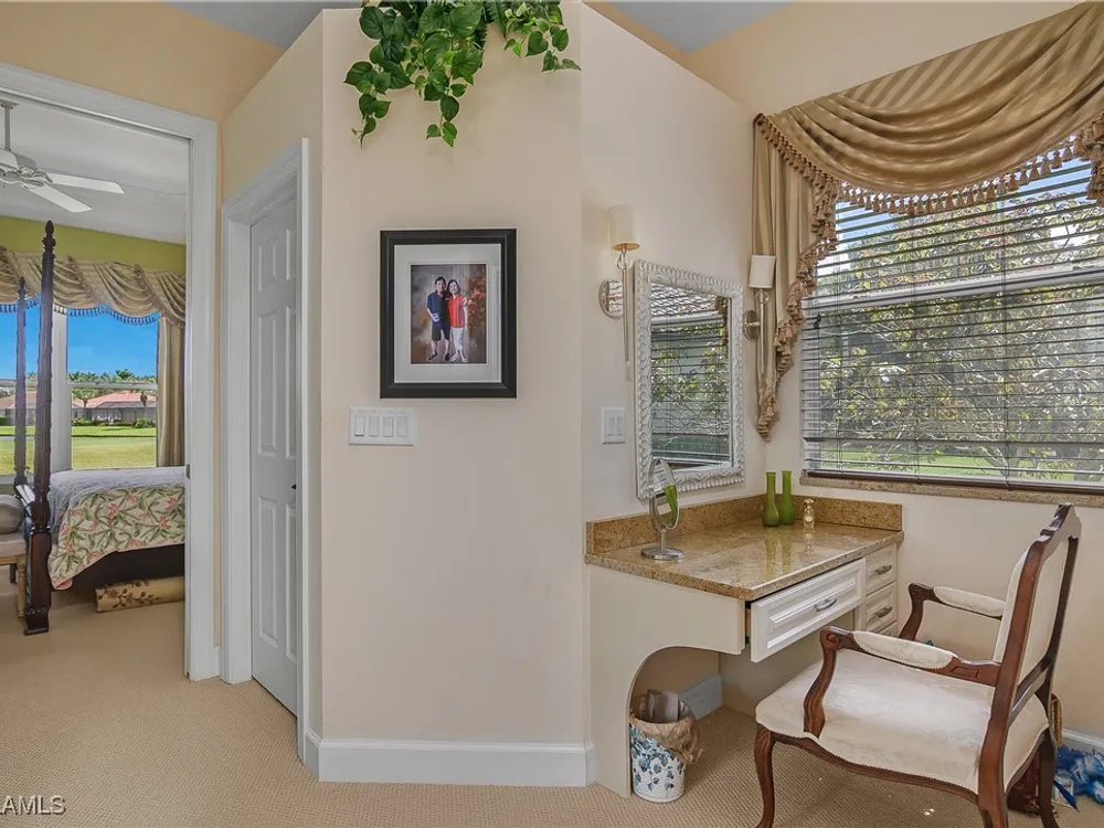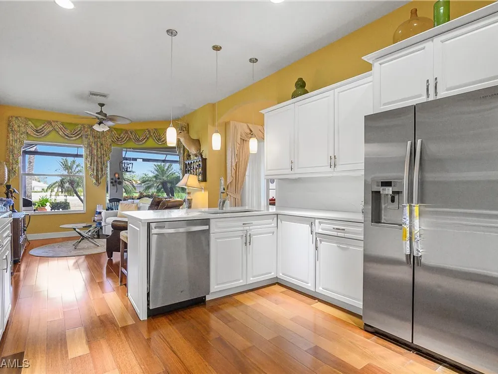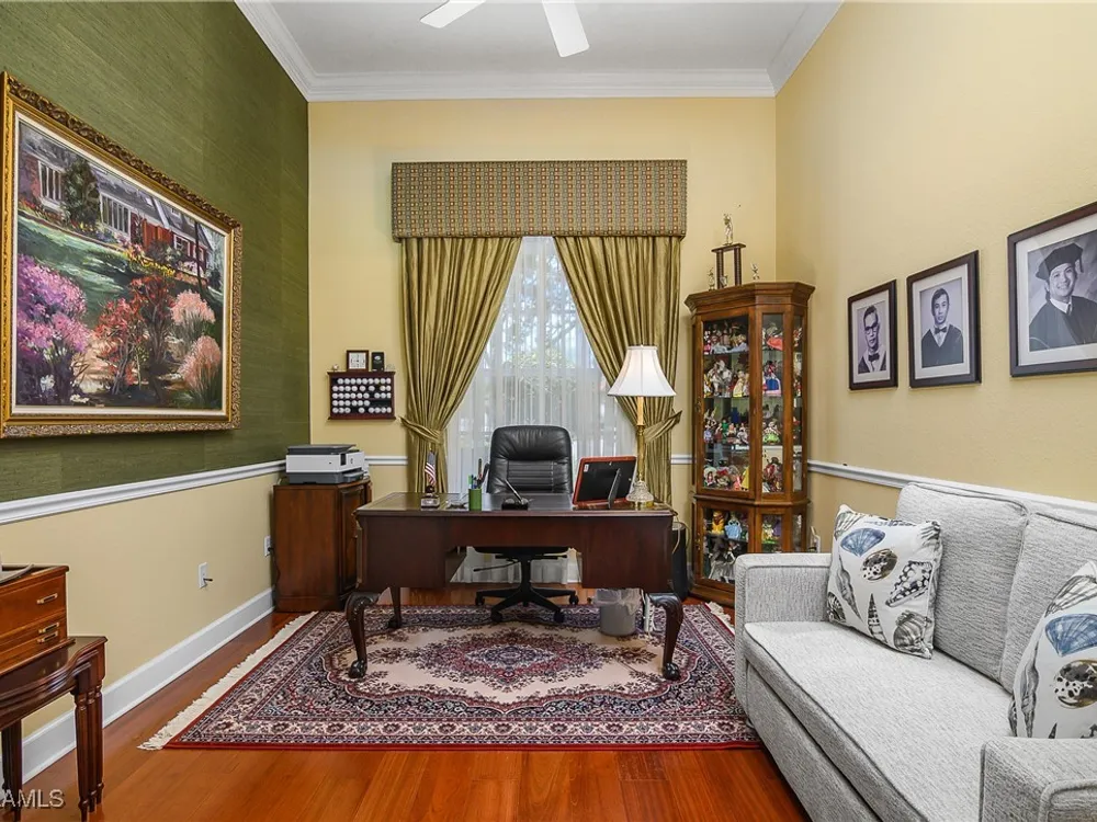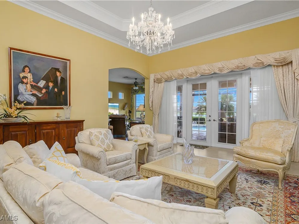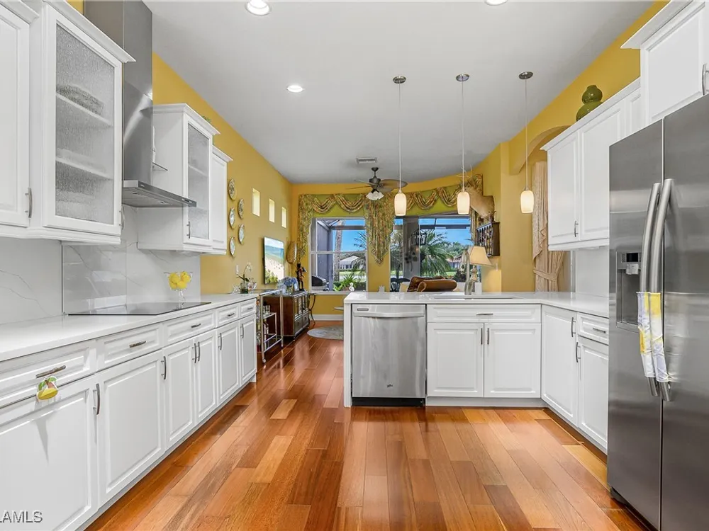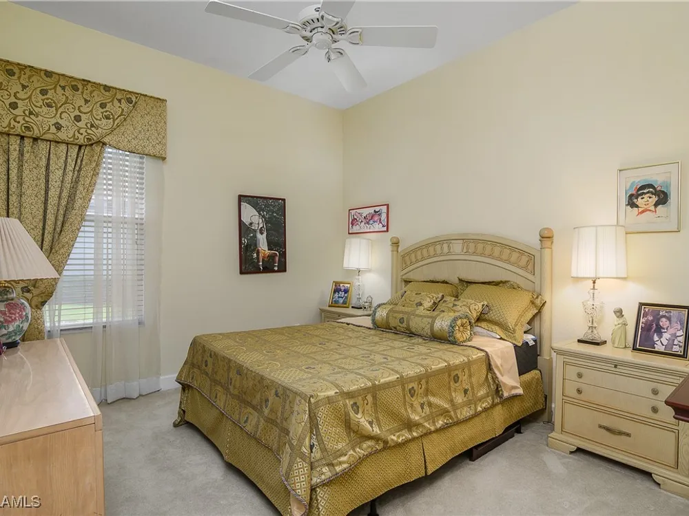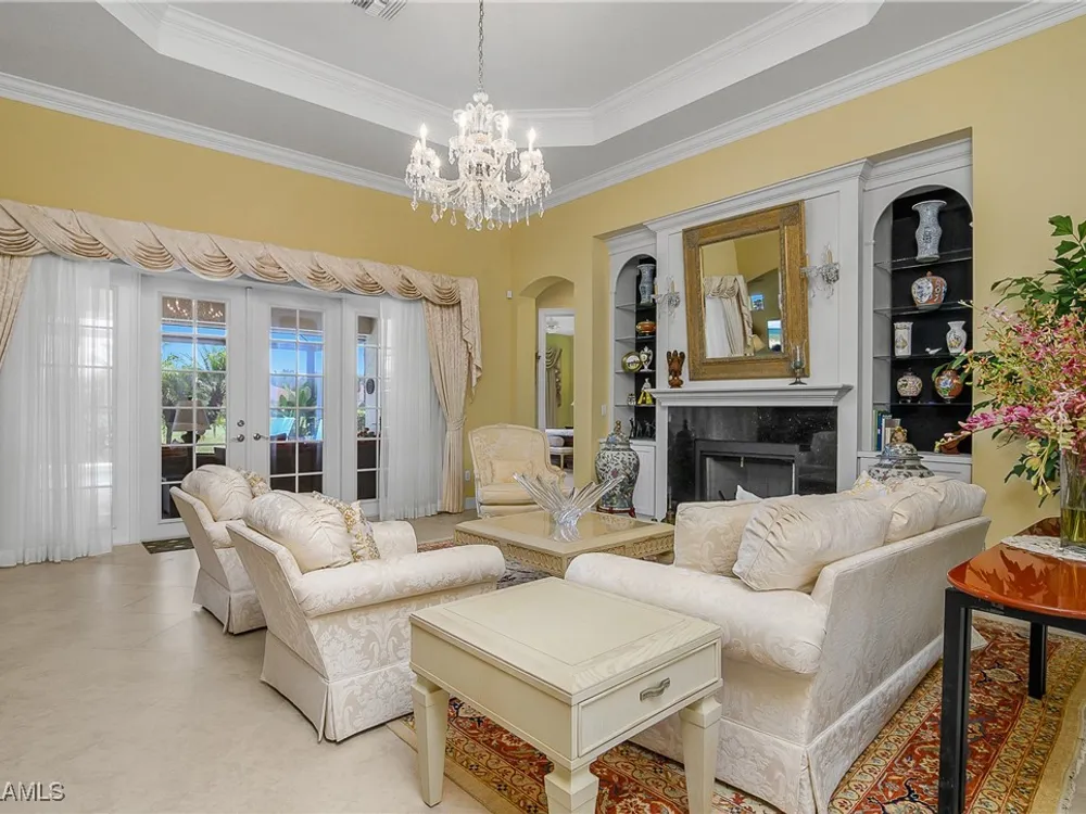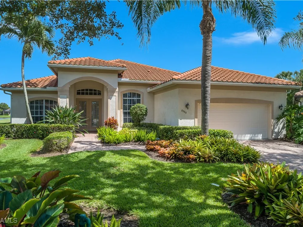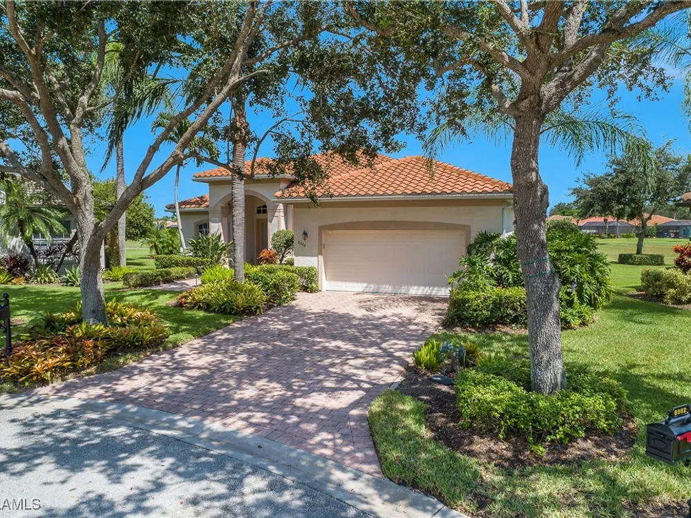 Outstanding lake view from this home located at the end of a cul-de-sac. Fabulous privacy with this 2 bedroom plus a den home. Foyer leads to large living room (great room) with marble framed fireplace and elegant dining room. Kitchen has stainless appliances, highly upgraded cabinets and quartz counters. Elegant master bedroom with walk-in closet and a custom designed ladies make-up area. Master bath has updated shower and dual sinks. Both master bed and bath have new hurricane windows installed in 2024. Split bedrooms allow for privacy in the guest bedroom and bath. Lovely pool has panoramic screen done in 2022. Lanai has hurricane screens put in by Storm Smart 2023. Pool is heated by solar and electric. High end AC replaced in 2025. New roof 2022. Two car garage with new spring board. Mustang Island is a gated community for homeowner security. The Players Club and Spa resort style amenities are included with this home. The Club offers three pools, tennis, pickle ball, bocce, spa, a complete fitness center, and a full social calendar. Lely Resort offers the perfect balance of leisure and recreation.