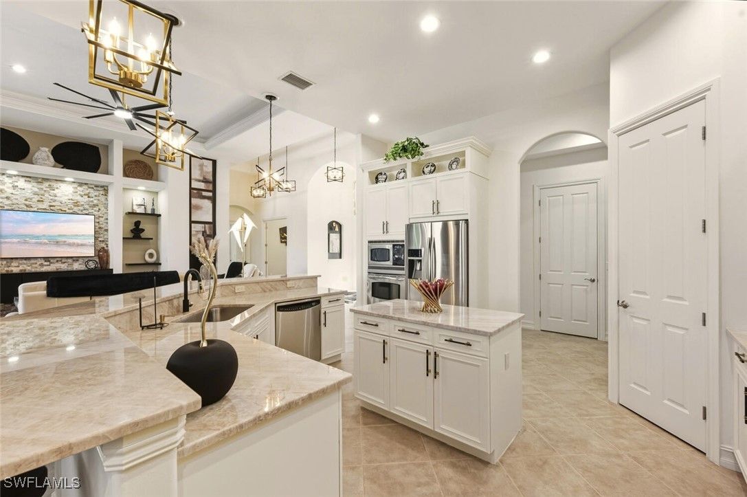 Welcome to this exceptionally updated 4-bedroom + den lakefront home in the prestigious Majors at Lely Resort, ideally situated on a quiet cul-de-sac within a double-gated community and offered with a deeded Players Club & Spa membership—NO waitlist. This fully furnished residence showcases a one-of-a-kind interior, thoughtfully redesigned with unique custom finishes, accent walls, and built-in features throughout. Enter through double glass front doors and immediately take in the wide, tranquil lake view that fills the home with natural light. Designed for seamless indoor-outdoor living, the great room opens to a huge covered lanai overlooking the water, complete with a heated pool and hot tub, outdoor fireplace, outdoor kitchen, and multiple seating and dining areas—perfect for entertaining or relaxing in total privacy. The updated white kitchen features stainless steel appliances, ample cabinetry, and flows effortlessly into the main living and dining spaces, enhanced by crown molding and recessed lighting. Throughout the home, you’ll find plantation shutters in every room, adding timeless elegance. The owner’s suite is a private retreat with his-and-her custom built-in closets, a convenient coffee bar, and a spa-inspired bathroom featuring a walk-in shower and freestanding soaking tub. One guest bedroom is brilliantly designed with a built-in desk and queen-size Murphy bed, making it ideal for a home office or flex space. Additional features include a private laundry room with utility sink and abundant storage, a 2021 roof, and power and manual storm shutters across the lanai for peace of mind. As a resident, enjoy full access to the Players Club & Spa, offering resort-style pools, fitness center, dining, tiki bar with entertainment, tennis, pickleball, bocce, and a vibrant social calendar for all ages. Luxury, lifestyle, and location converge in this beautifully updated lakefront home—move-in ready and truly unique.