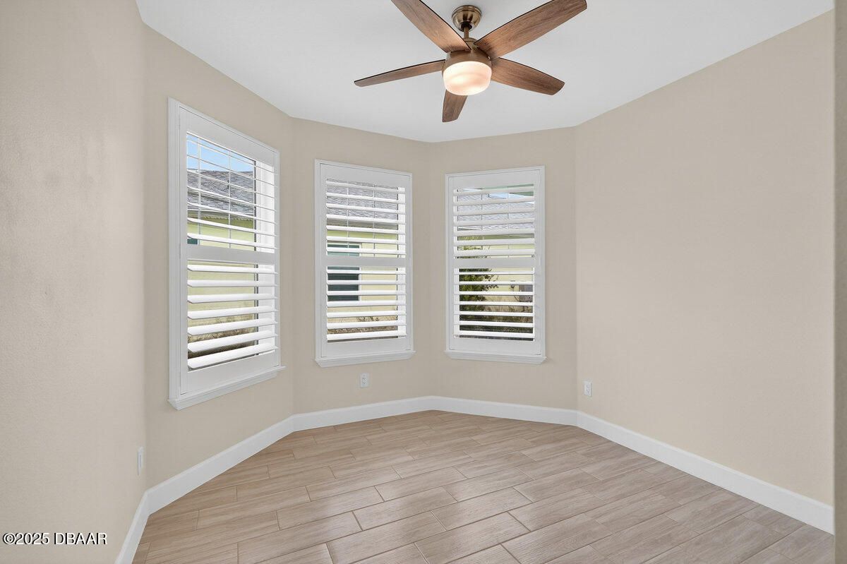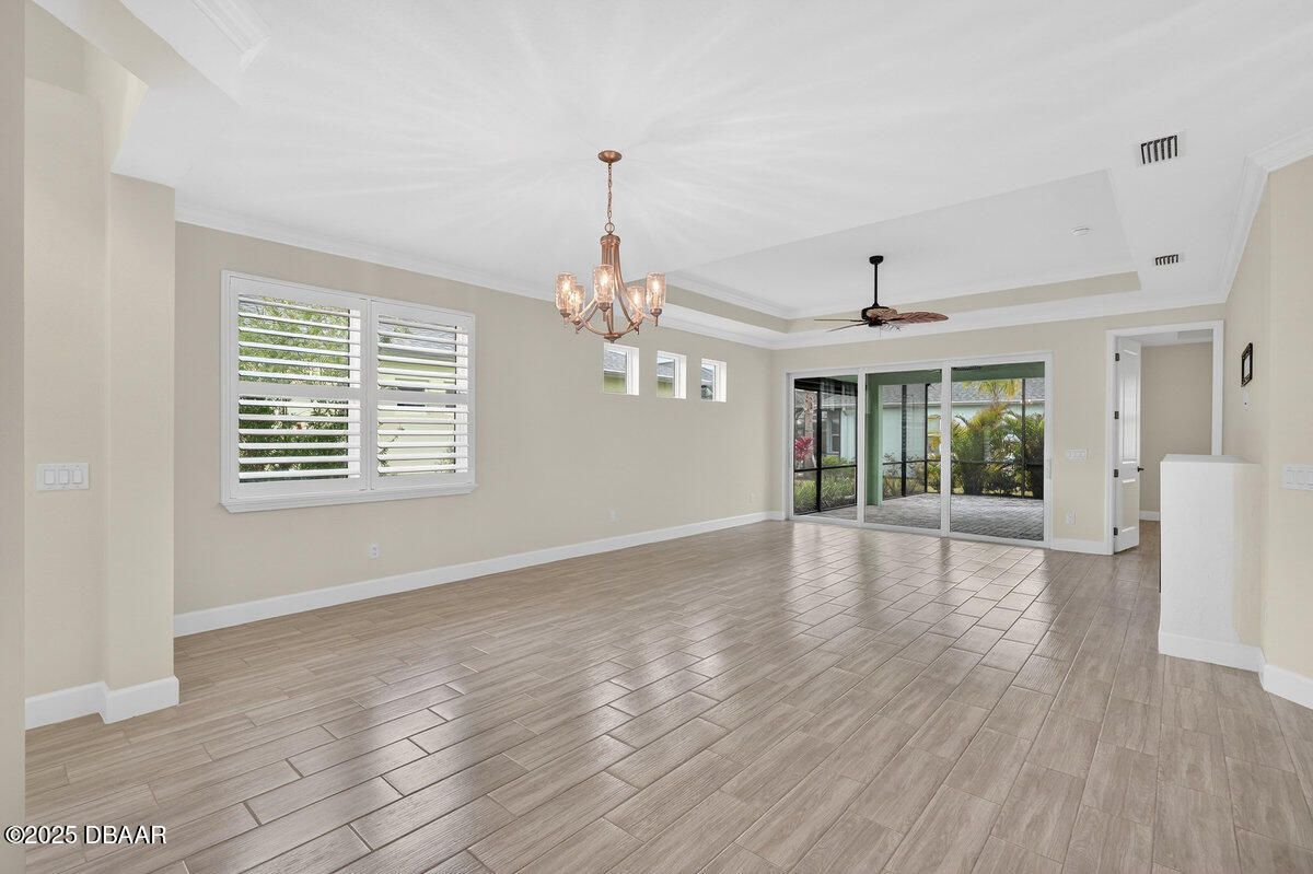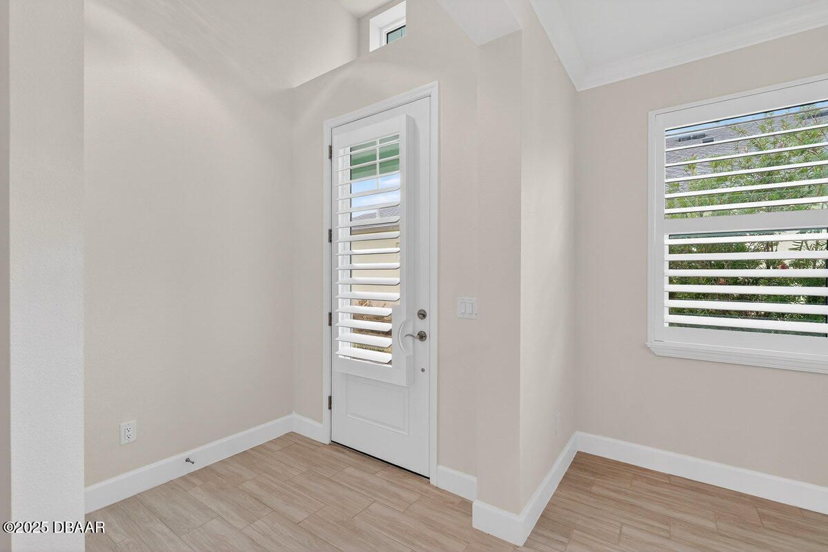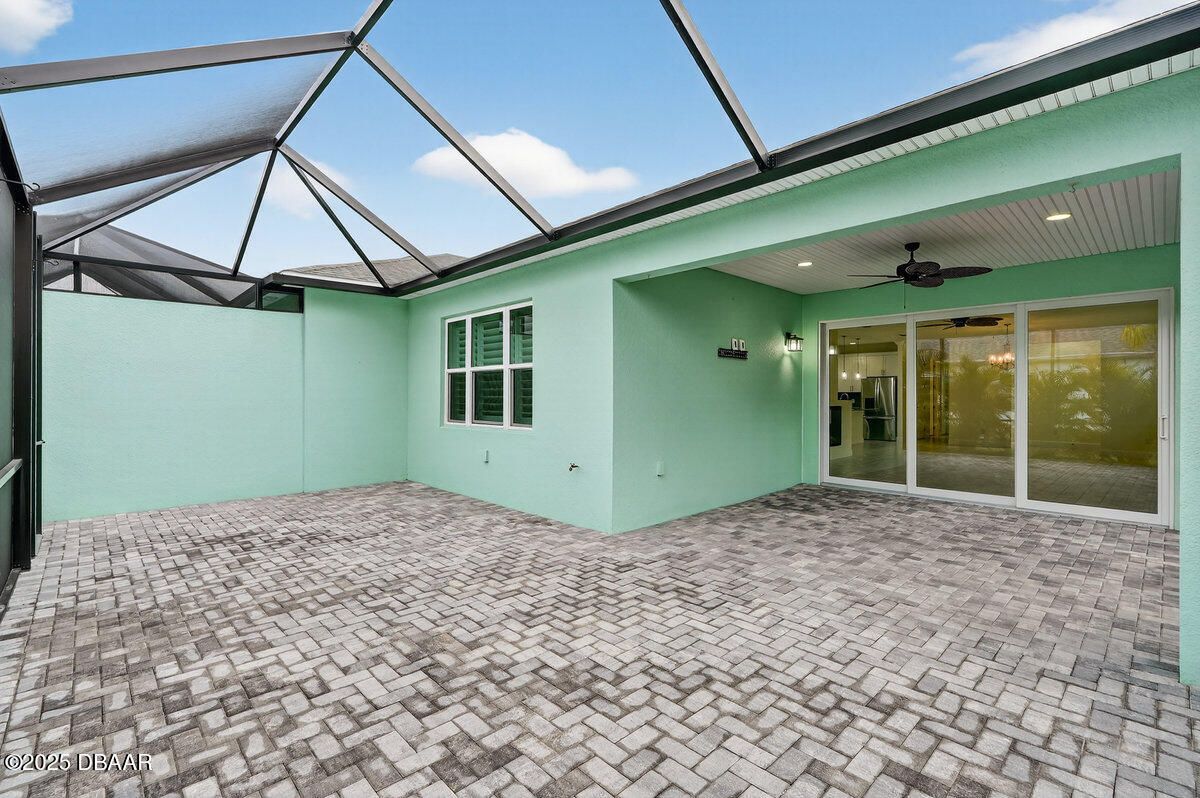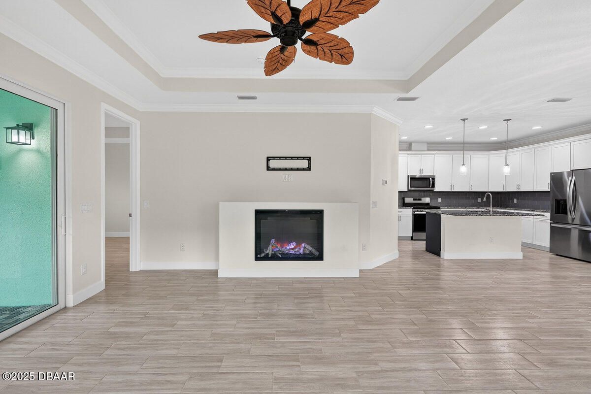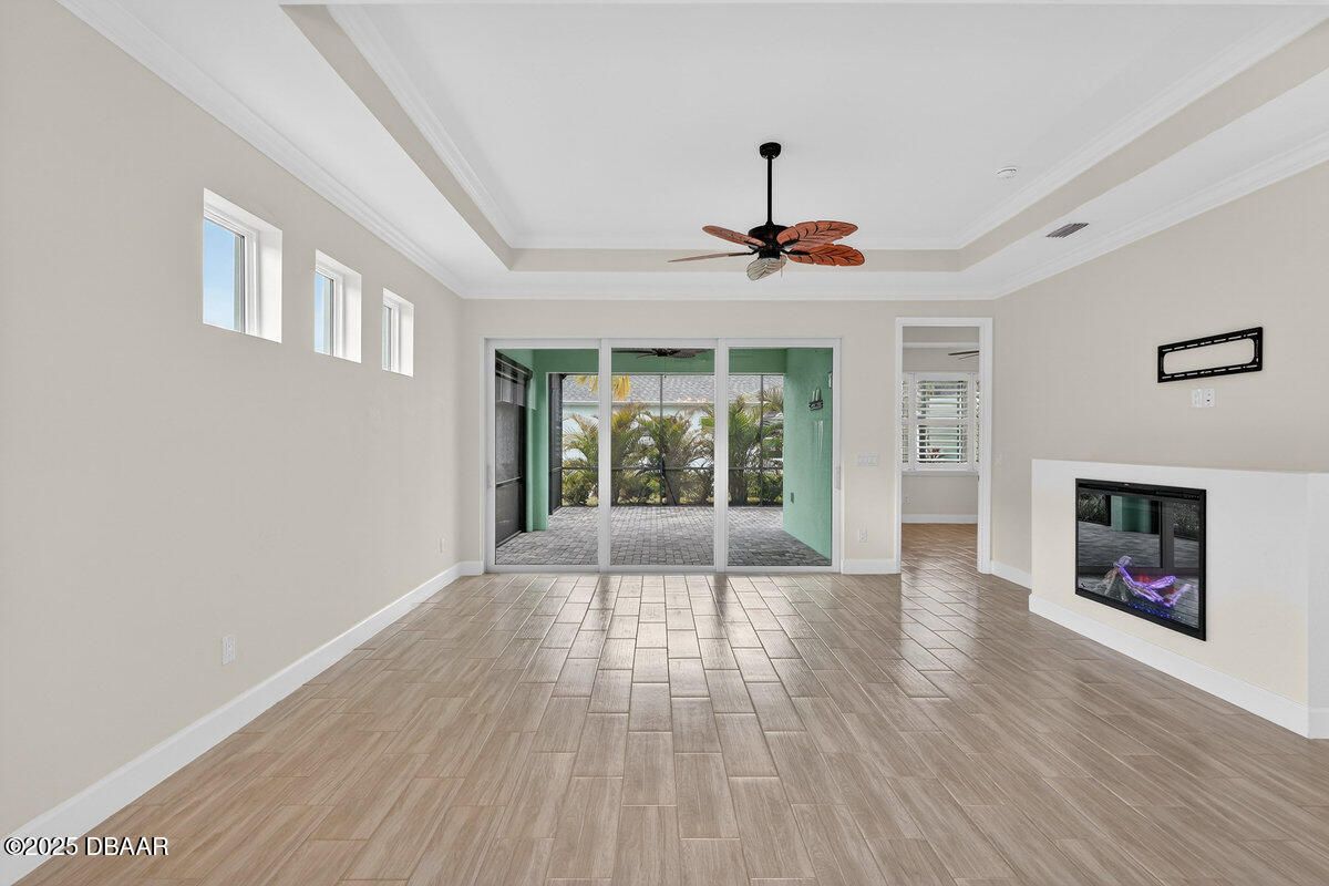 Welcome to this highly upgraded Lucia villa in Phase 7 of Latitude Margaritaville, just down the street from Guitar Park, offering impeccable condition and a clean, like-new feel that is truly move-in ready. Plank tile flooring, crown molding, 8-foot two-panel doors, and plantation shutters extend throughout the home, complemented by a custom fireplace and ceiling fans in every room, including the lanai. The chef's kitchen is thoughtfully designed with 42-inch cabinets accented by crown molding, pullout shelving, double trash pull-outs, dovetail soft-close doors and drawers, granite countertops, a gas range, and a glass tile backsplash, blending style with everyday functionality. The spacious primary suite features a tray ceiling and abundant natural light from two operable windows with fixed glass centered between them. The en-suite bath offers a walk-in closet, frameless glass shower with tile to the ceiling, dual sinks, and granite countertops. The guest bathroom is equally well-appointed with upgraded cabinetry, granite countertops, and a tub/shower combination finished with tile to the ceiling and a beautifully detailed accent listello. Outdoor living is enhanced by an extended paver lanai with an electric privacy screen and fuller trees lining the back of the lanai for added privacy. Additional highlights include motion-activated recessed lighting in the hallway, a well-designed laundry room with cabinetry, folding table, utility sink, and an epoxy-finished garage featuring an accent wall with a ceiling fan. The longer-than-average driveway offers ample additional parking, and the Lucia floor plan provides extra space at the rear of the garage, perfect for a golf cart or additional storage. Community & Lifestyle: Enjoy a prime community location just minutes from the residents-only gate, providing easy access to LPGA Boulevard as well as I-95 and I-4. Designed for vibrant 55+ living, this community blends recreation, relaxation, and connection. Amenities include resort-style pools, a state-of-the-art fitness center, on-site restaurant, theater, daily live entertainment, pickleball and tennis courts, dog park, art studio, and a private beach club with shuttle service. HOA maintenance covers lawn care, exterior pest control, and access to all community amenities, allowing you to fully embrace the Margaritaville lifestyle. Roof 2023 | HVAC 2023 | Tankless Hot Water Heater 2023 Square footage received from tax rolls. All information recorded in the MLS is intended to be accurate but cannot be guaranteed.