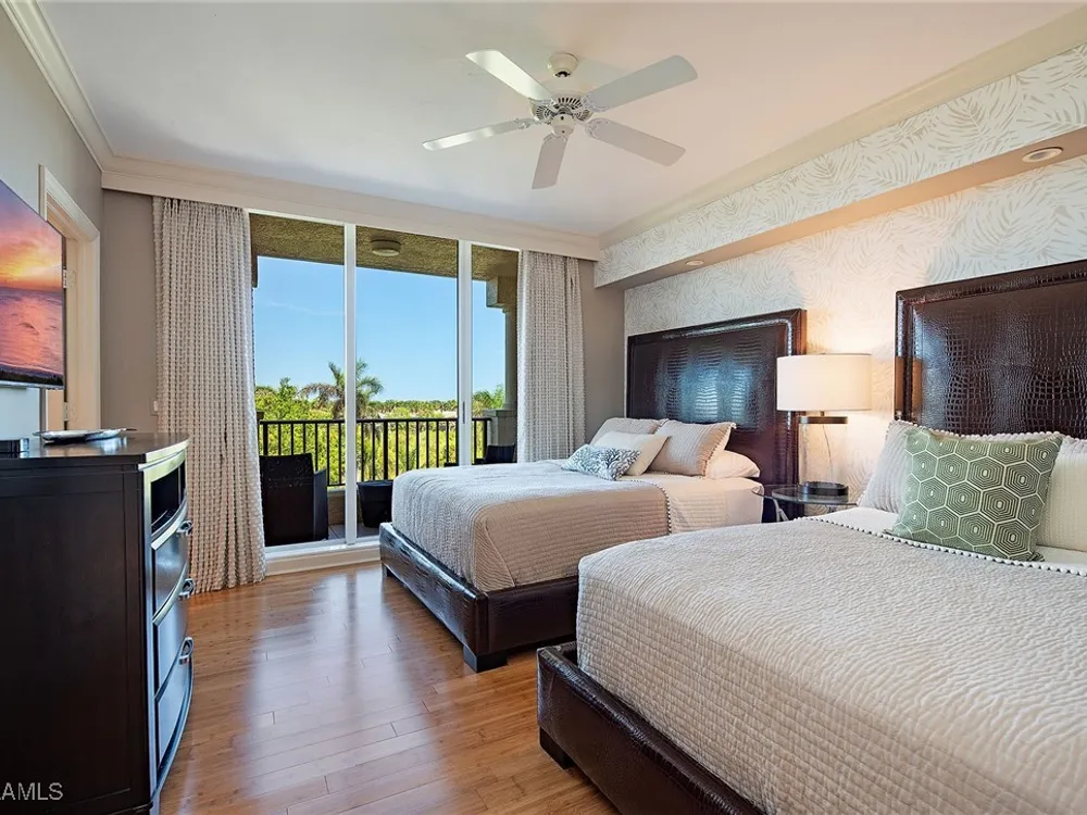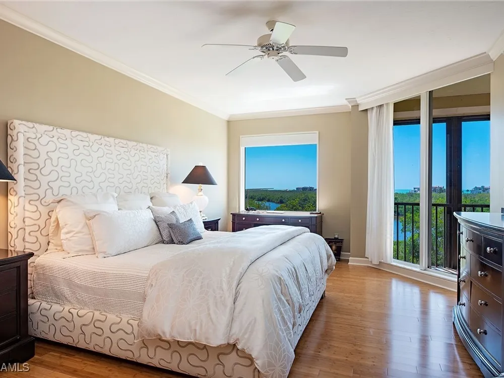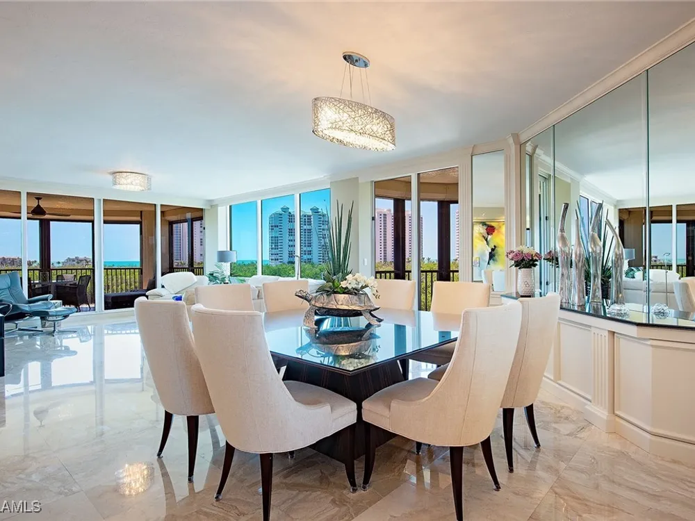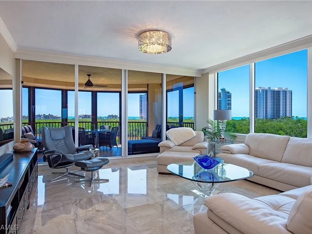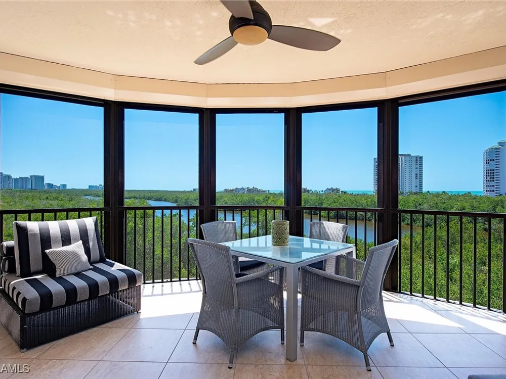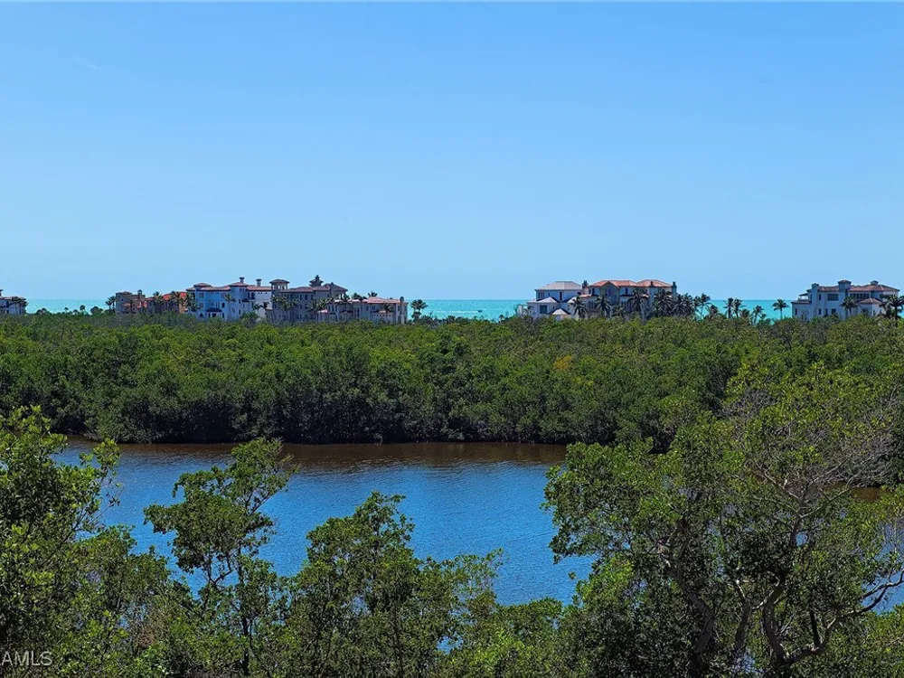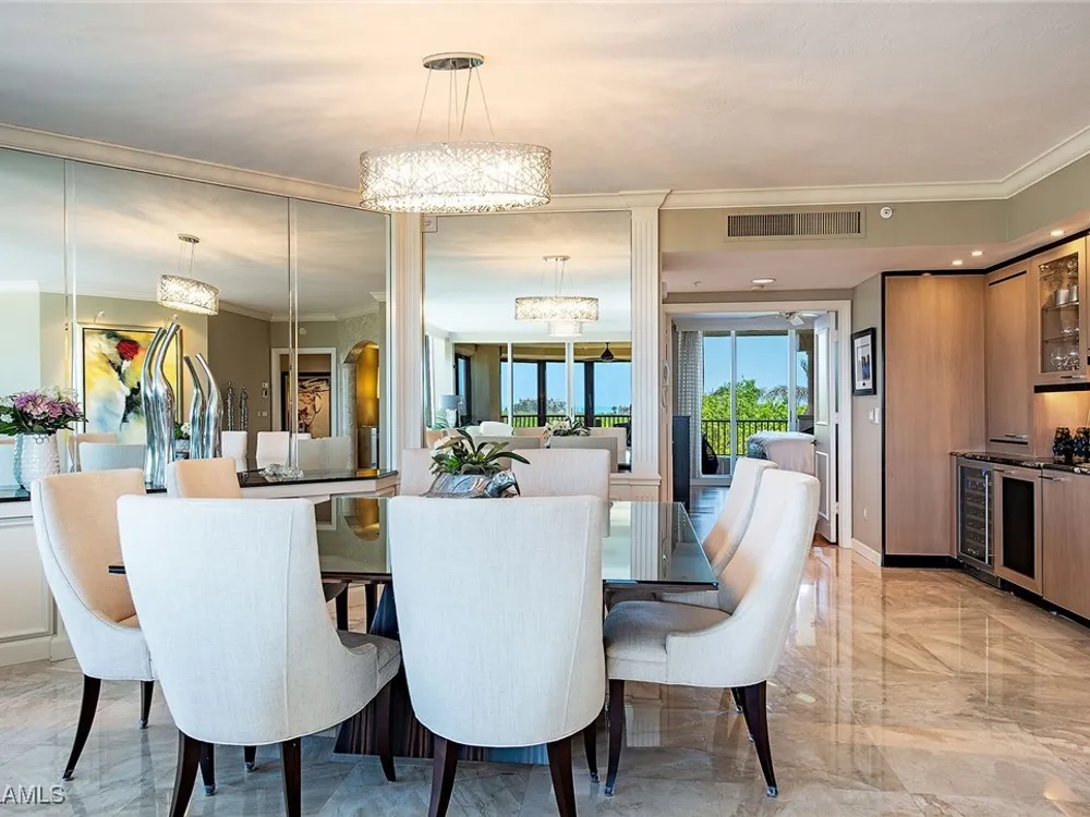 Experience the best of coastal living with beautiful gulf and bay views from this exquisite mid-level end-unit at the Marquesa in Bay Colony. Offering over 2,600 square feet of refined living space, this home features three bedrooms, three baths and luxurious finishes including marble floors and 9-foot ceilings. The custom-designed bar, complete with a stand-alone ice machine, sink and wine cooler, adds an extra touch of elegance. The expansive walls of glass flood the residence with natural light and seamlessly connect the indoors to the stunning outdoors. Relax on any of the three private lanais while enjoying the fresh air and panoramic views. Additional highlights include two deeded side-by-side parking spaces and an air-conditioned storage locker. As a resident, you'll enjoy automatic membership to the prestigious Bay Colony Beach and Tennis Club, as well as access to the Pelican Bay Foundation, which offers exclusive beachfront dining, tennis and fitness amenities. A blend of luxury and location!