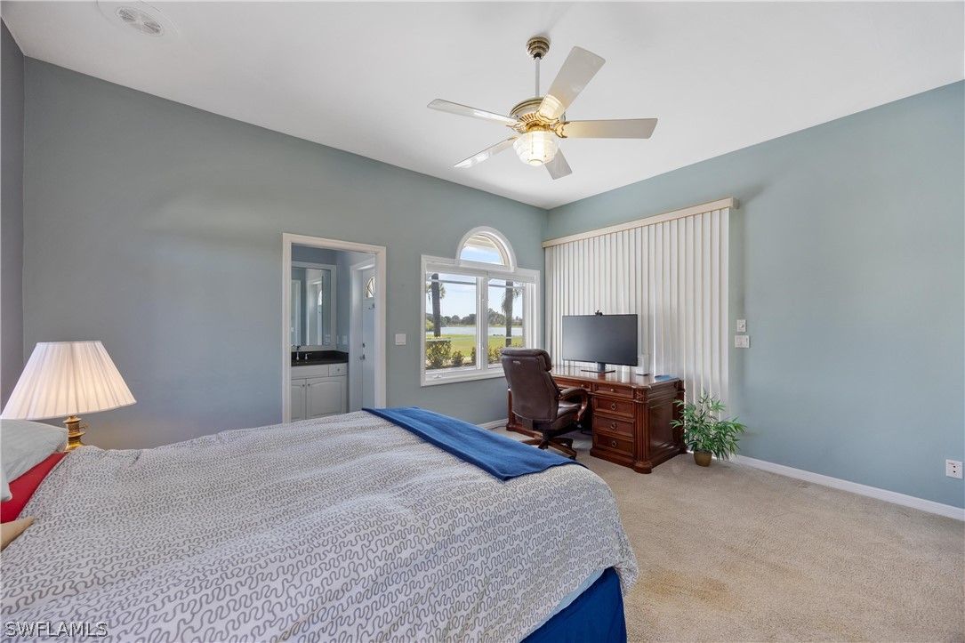 In Lely Island Estates at Lely Resort, this custom estate residence offers approximately 3,741 square feet of interior living space designed for everyday comfort and large-scale entertaining. The home includes four bedrooms plus a den, three full baths and one half bath, all positioned on an oversized and private homesite with southern exposure overlooking golf course, lake and preserve views. An impressive leaded glass mahogany double-door entry opens to a granite foyer, immediately framing the layered outdoor vistas. The great room floor plan is enhanced by volume and vaulted ceilings, creating expansive gathering areas filled with natural light. Pocketing sliding glass doors recess into the walls, seamlessly extending the living space to the lanai and maximizing long-range views. The updated kitchen features granite countertops, complemented by updated stainless steel appliances. The fully renovated baths feature new tile, white cabinetry and quartz countertops. Custom closet systems are installed throughout. Electric roll-down shutters at the rear, manual roll-down shutters on the sides and two new impact-resistant street-facing windows provide convenient storm protection. Recent updates include a newer tile roof and freshly painted exterior. Outdoor living is centered around a heated pool and spa with an expansive deck, offering private southern exposure and panoramic views across the golf course to the lake and preserve beyond. Residents of Lely Island Estates enjoy low homeowners association fees and no mandatory membership to The Players Club and Spa, offering flexibility within a resort-style community known for championship golf and extensive amenities.