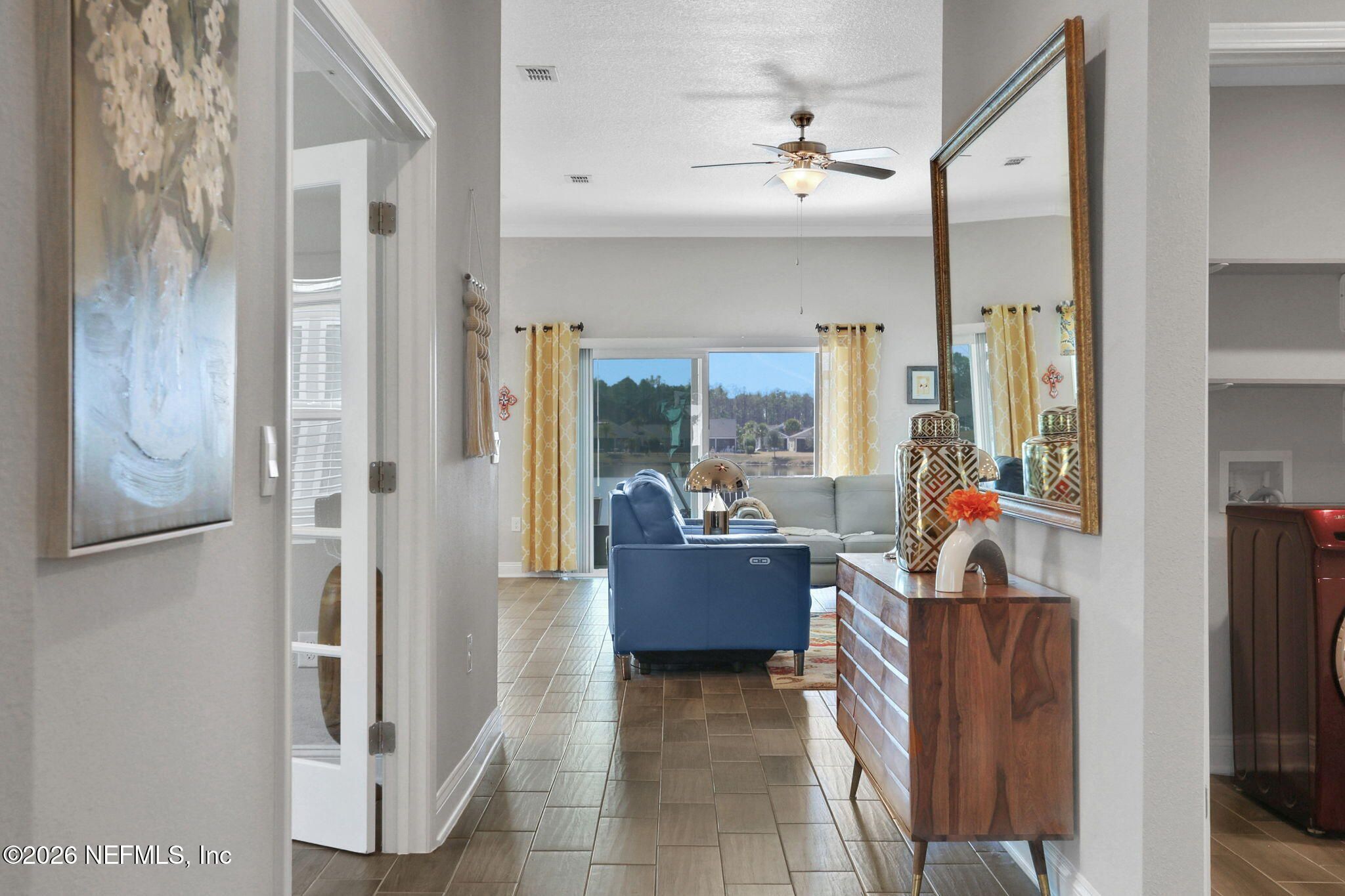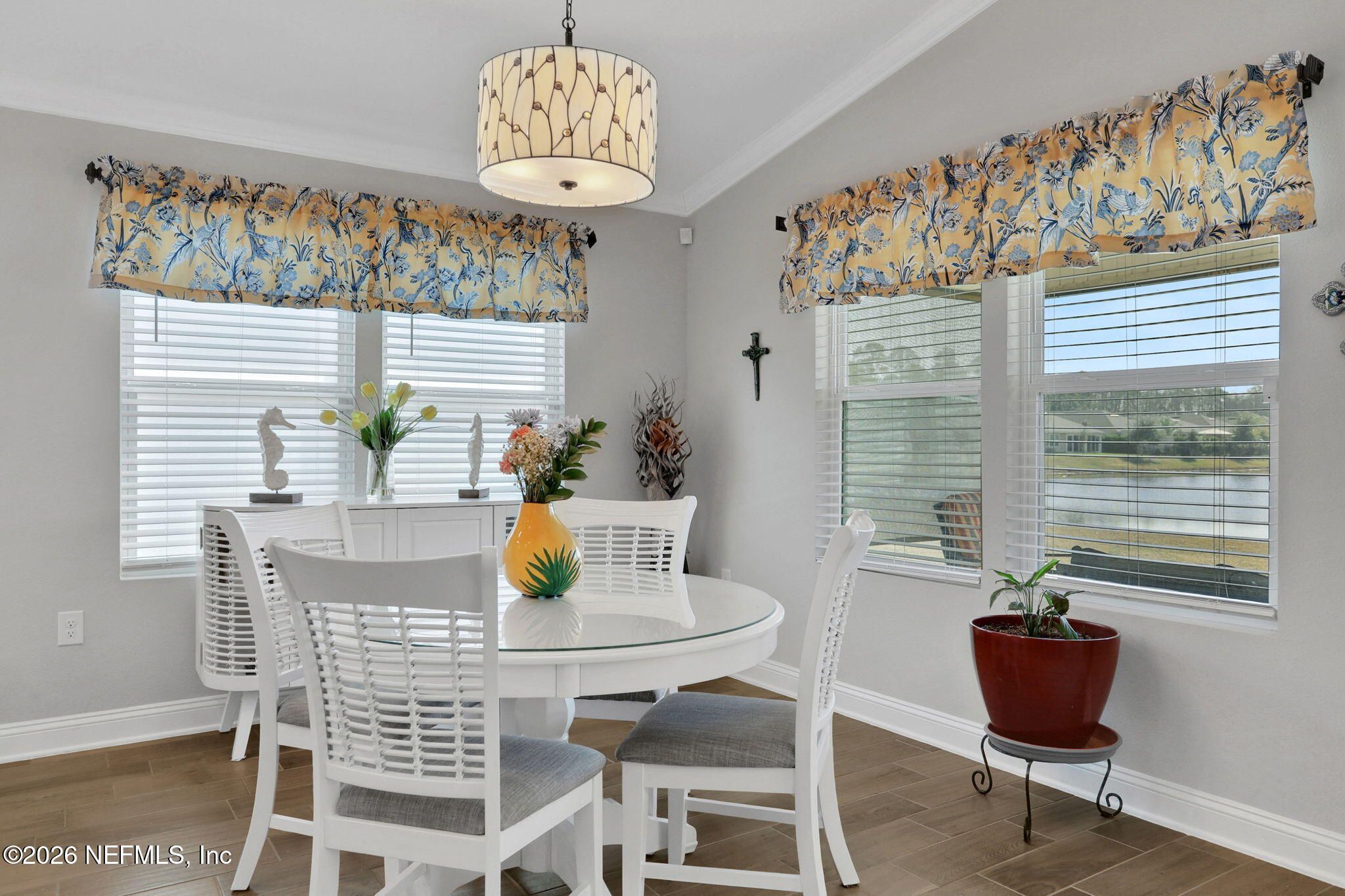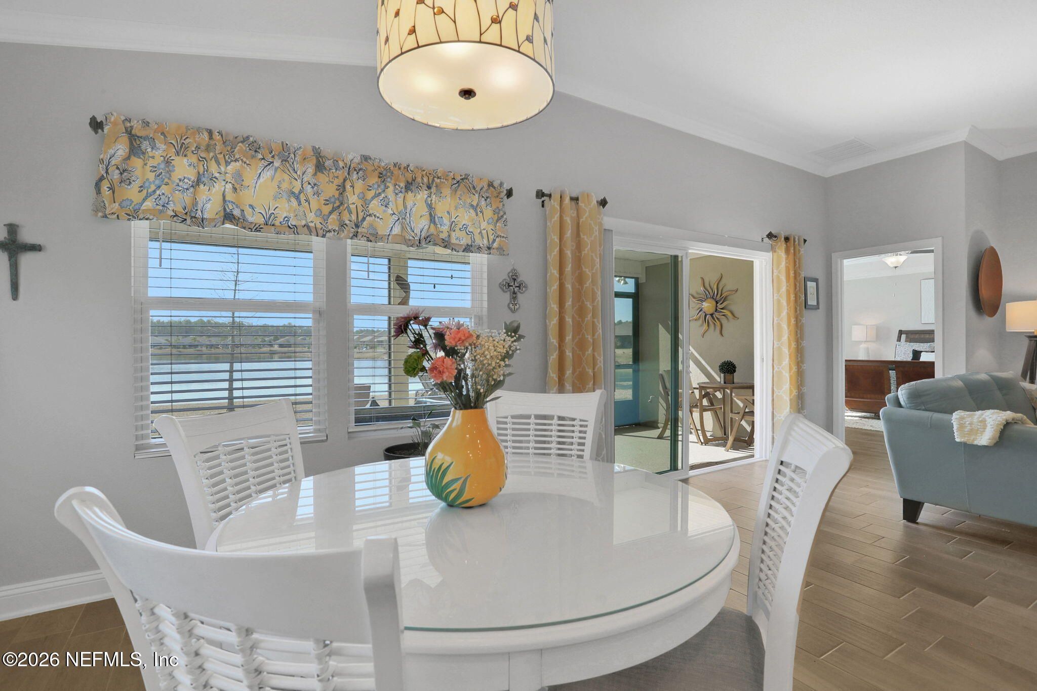 STUNNING BETTER THAN NEW DALTON FLOORPLAN ON A GRAND & EXPANSIVE POND W/ PLENTY OF DUCKS TO KEEP YOU COMPANY! Inside you will find three bedrooms & a lovely office/fourth bedroom with owner's suite in the back corner tucked privately. Wood grain plank tile flooring extends thru most every space in the home. Kitchen is open w/ prep island & bartop seating, light style quartz, 42in shaker cabinetry & ample recessed LED lighting. The lanai has been extended w/ screen & open space for entertaining & room for a summer kitchen. Large laundry room with wraparound shelving & multiple linen closets/walk-in closets provide for storage space. The community is gated with all the preferred amenities - fitness, pool, pickleball & more! I-95 is easily accessible within minutes.